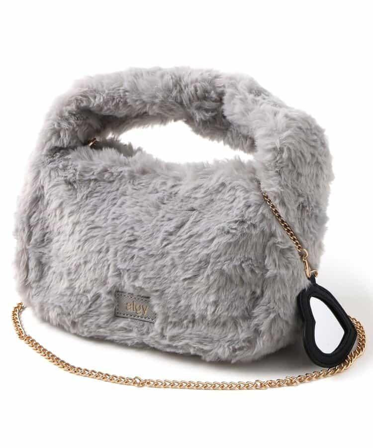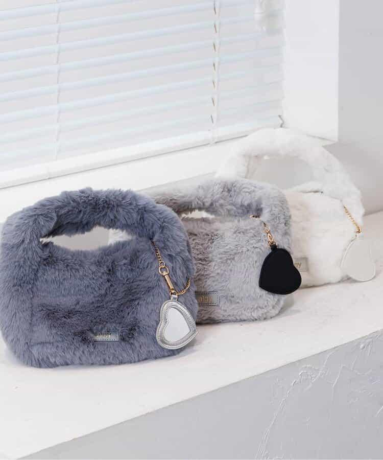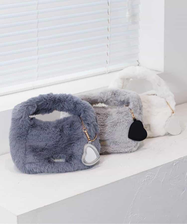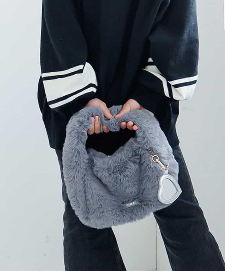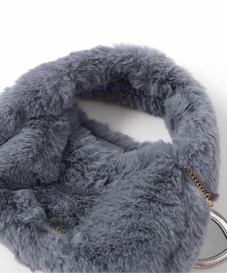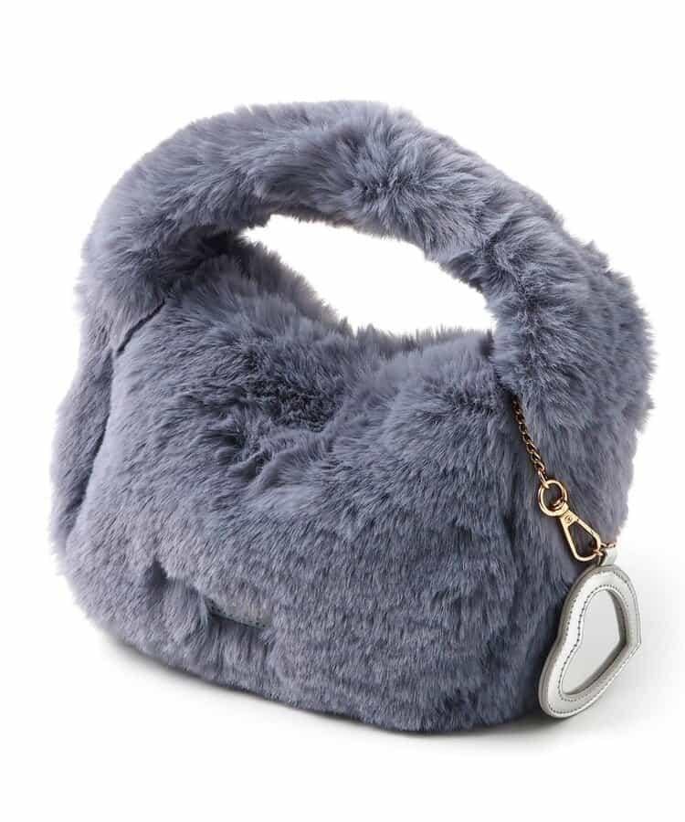 這款迷你手提包採用蓬鬆的皮草材料製成,烘托出季節氣氛。