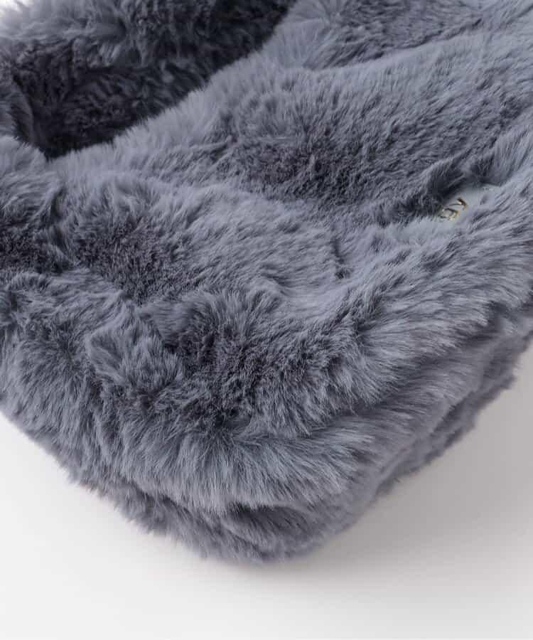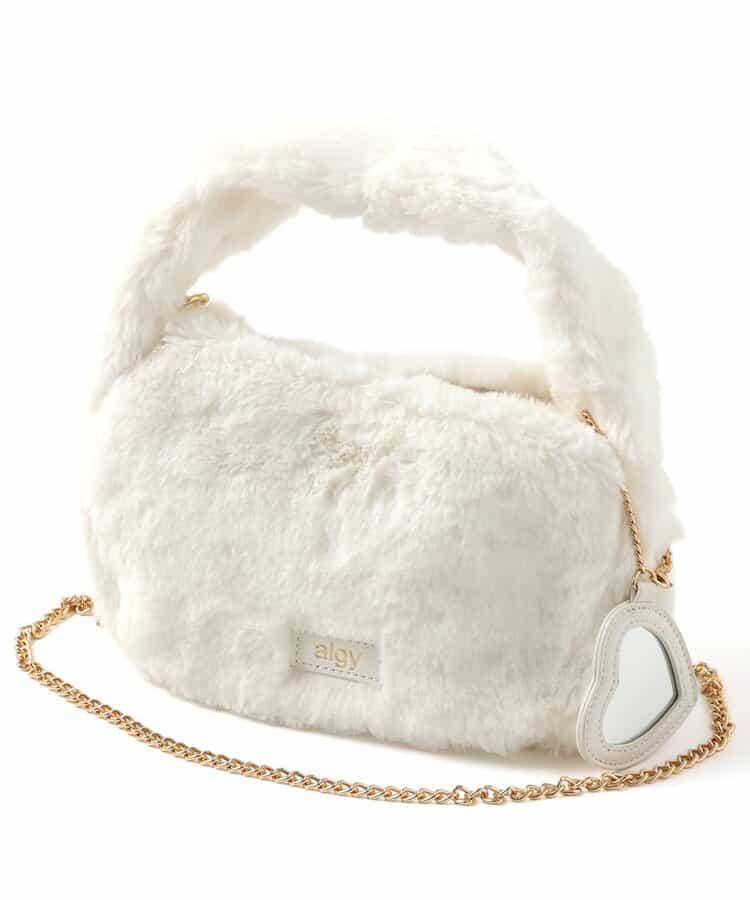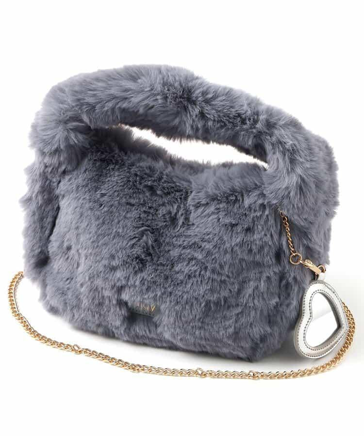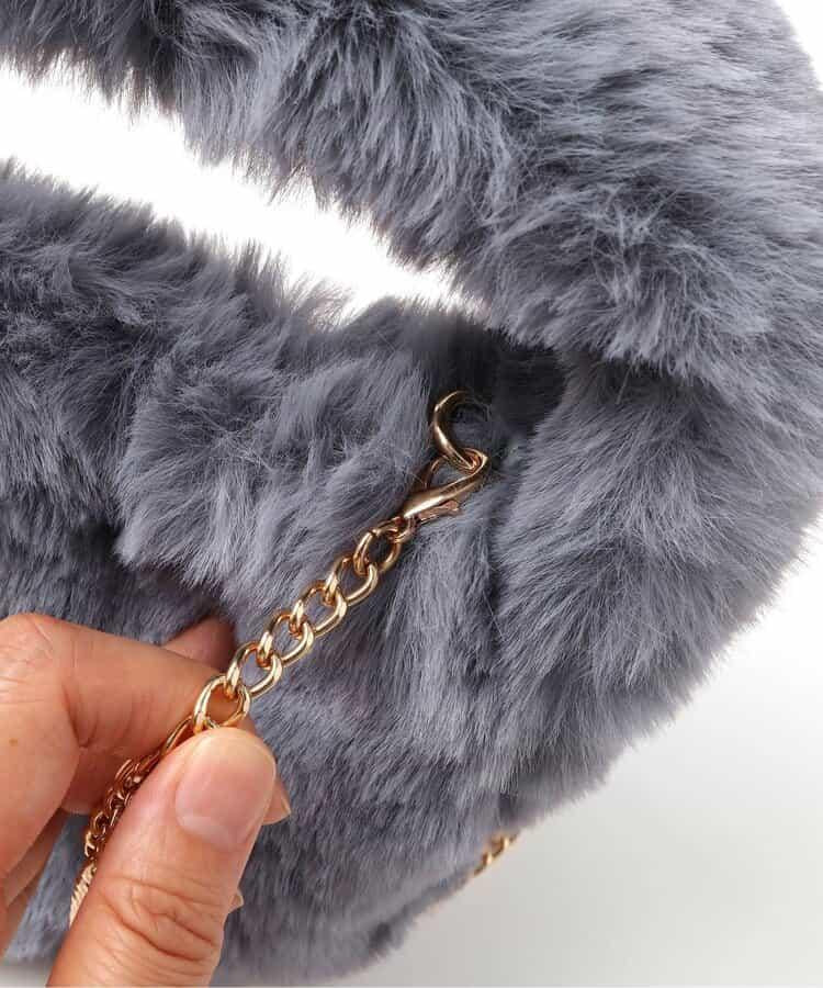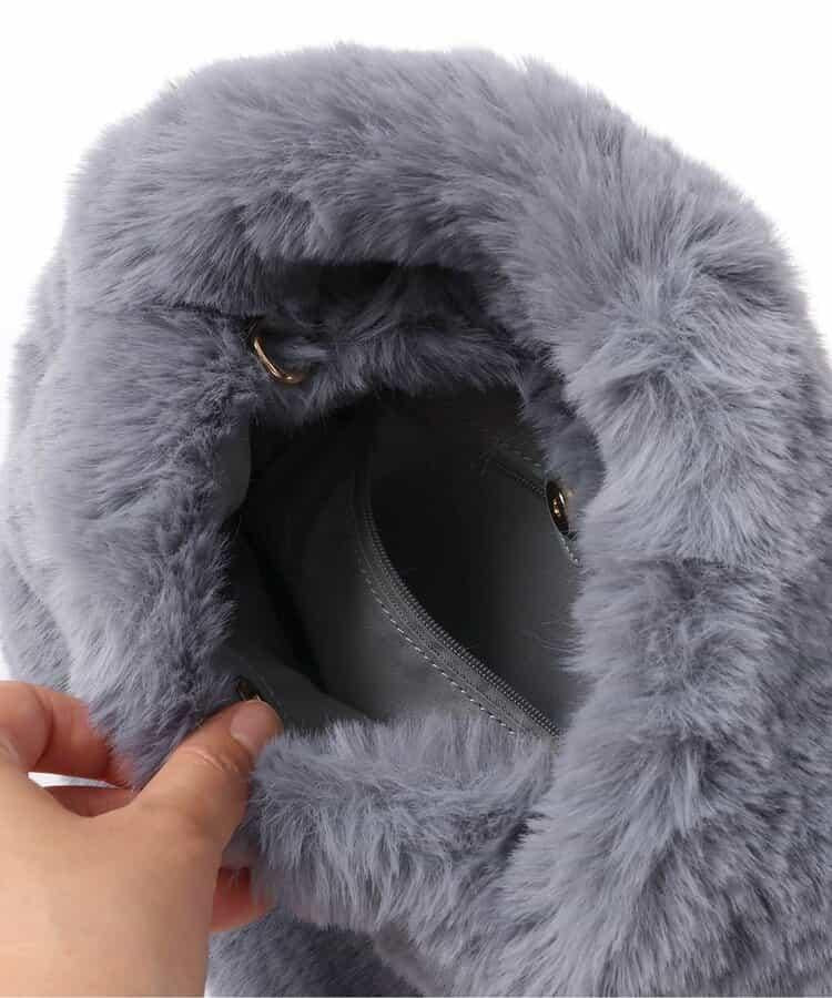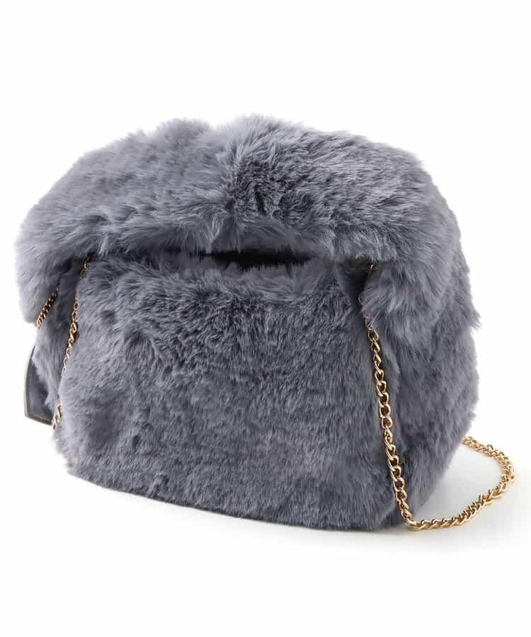 這款迷你手提包採用蓬鬆的皮草材料製成,烘托出季節氣氛。