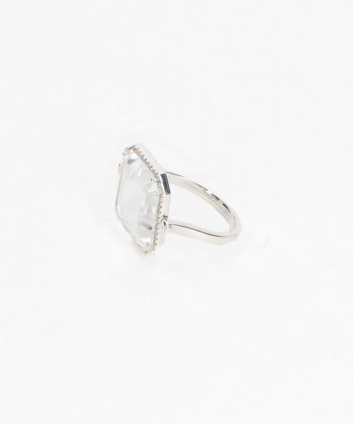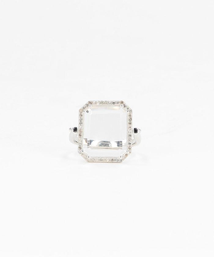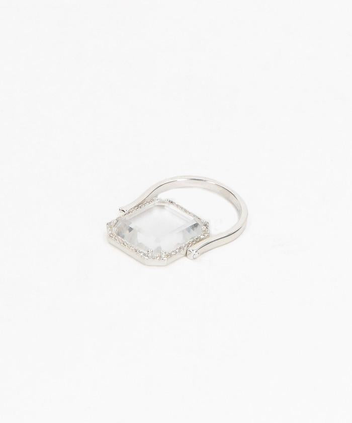 這枚精美的戒指上鑲嵌著一顆碩大的白色石英石,周圍鑲嵌著天然鑽石。