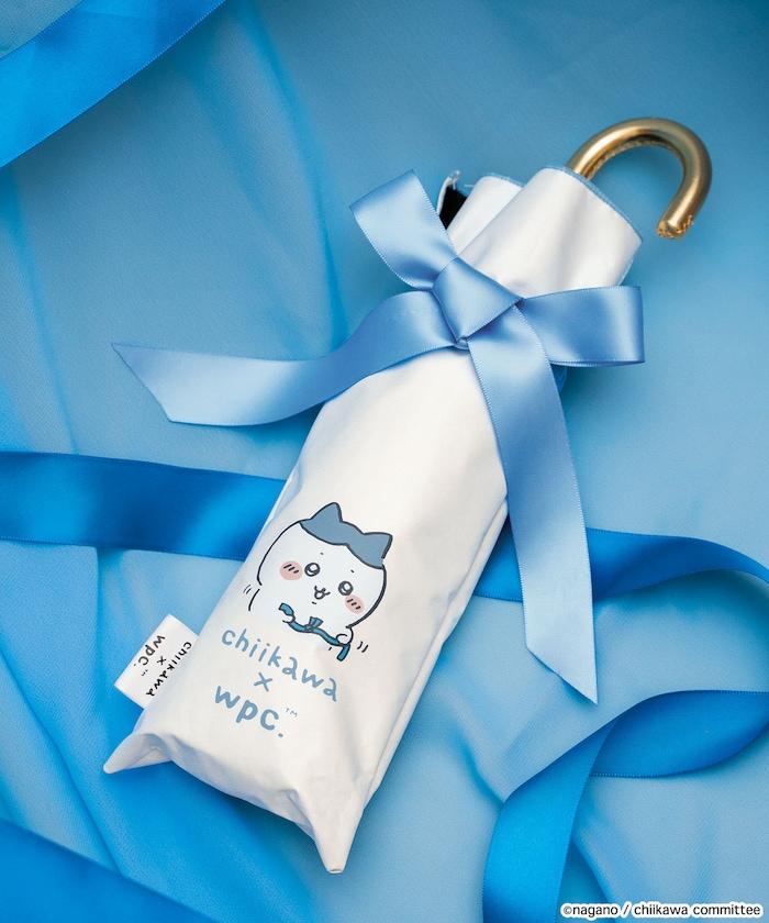 陽傘本身和收納袋上都裝飾有藍色絲帶。