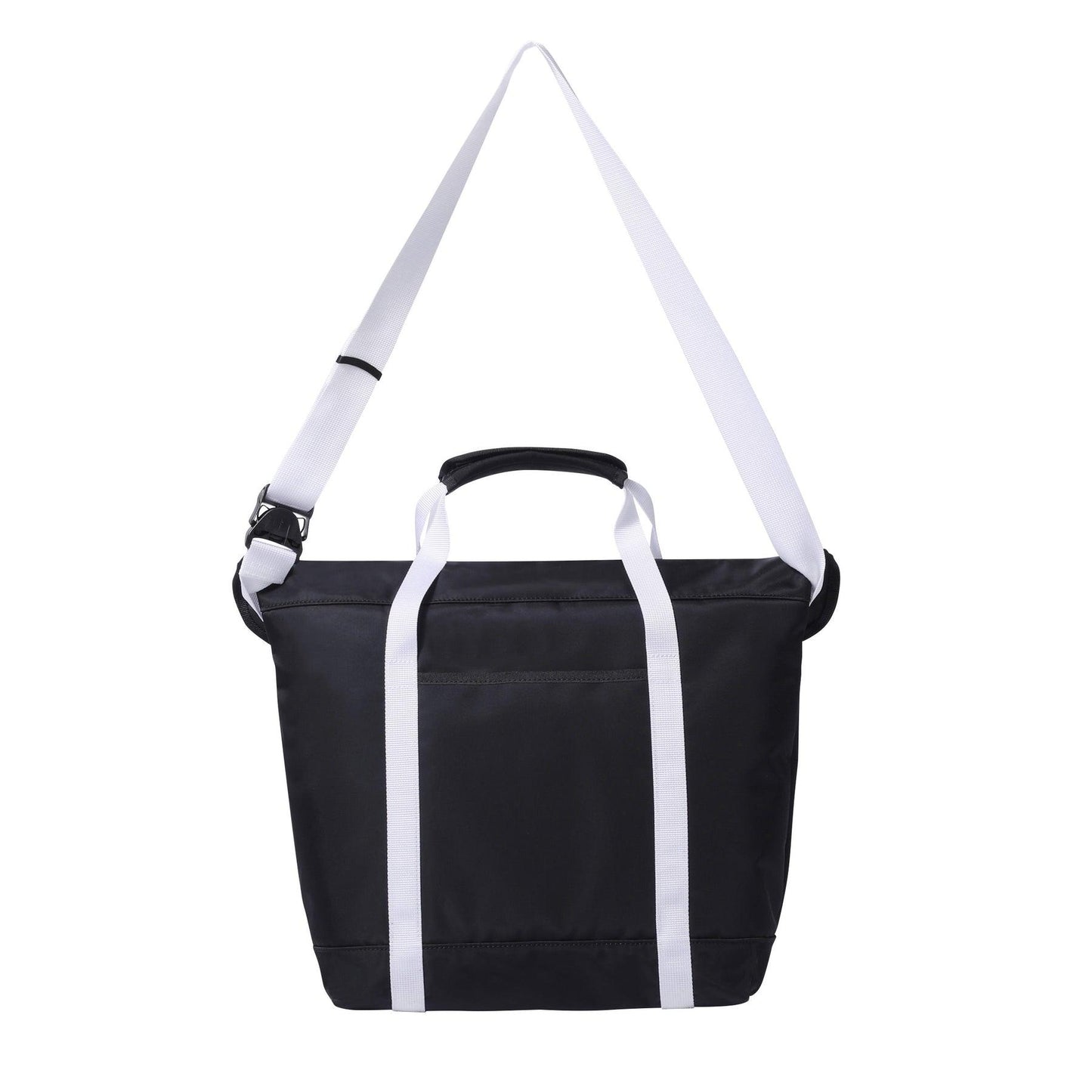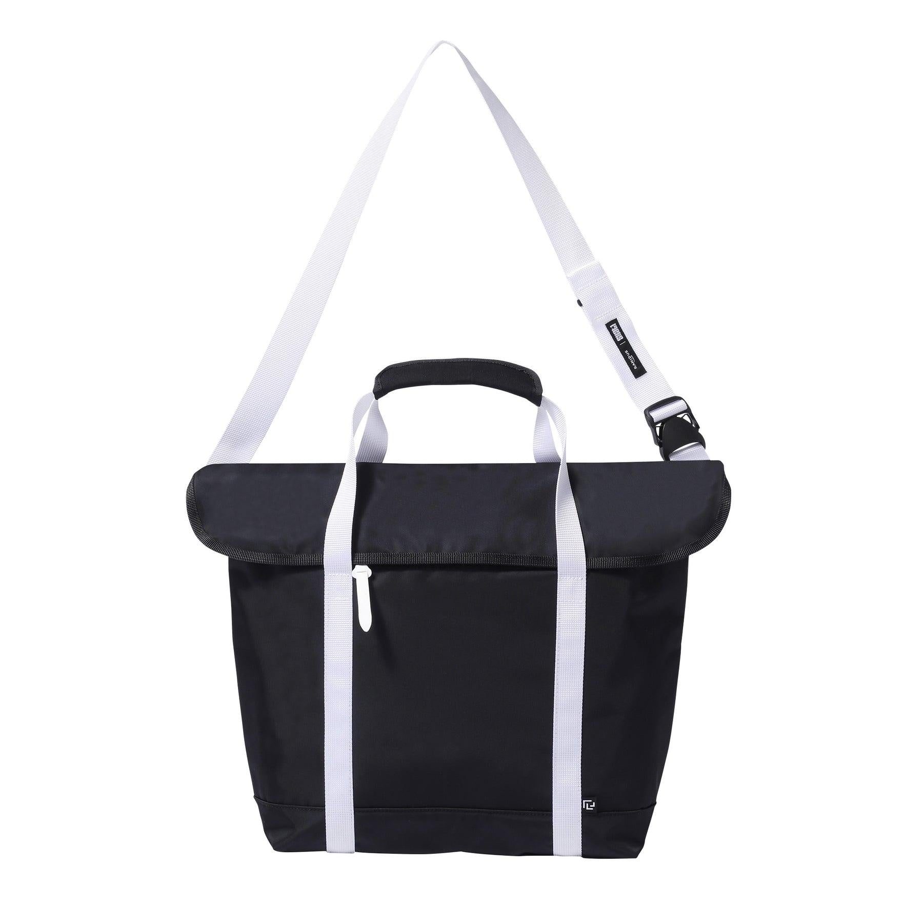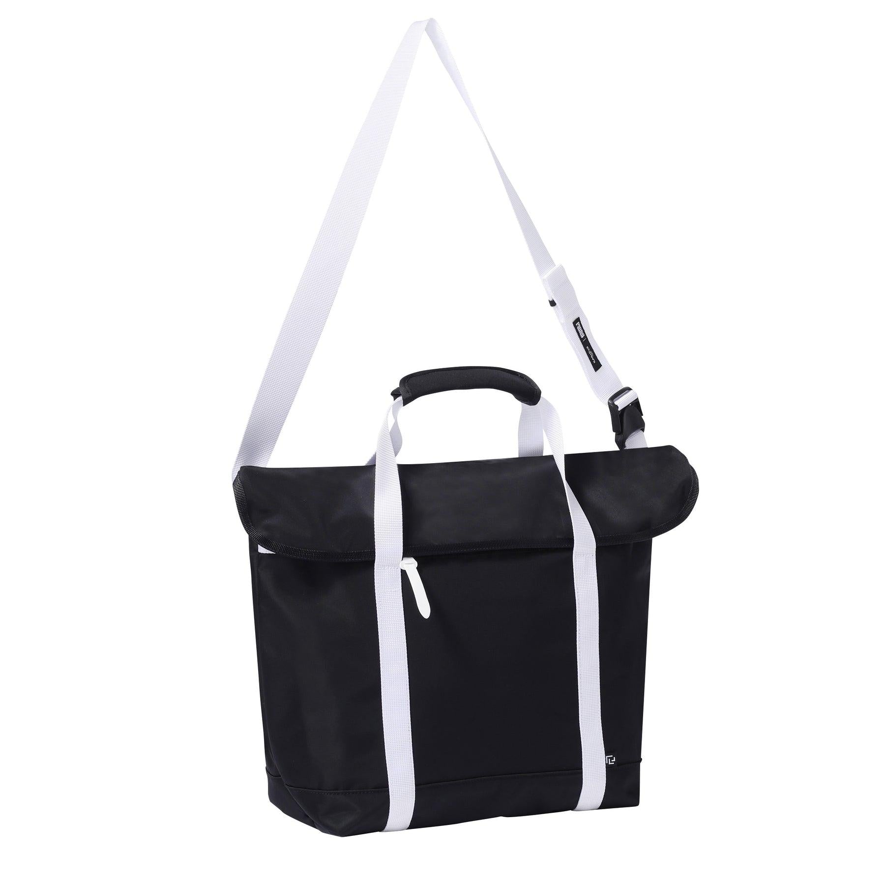 斜挎包肩包,也可用作手提包。除寬敞的主隔層外,內部還有一個可容納 MacBook Pro 16" 筆記本電腦的隔層、一個水瓶袋和三個可放置小雨傘的插槽。這款包攜帶方便,適用於各種場合。SHATI 系列採用單色設計,光滑閃亮的尼龍質地讓人聯想到虎鯨,包身以黑色為主色調,拉鍊拉頭和尼龍帶均為白色。這款特別款還配有白色錶帶,進一步突出了黑白對比。