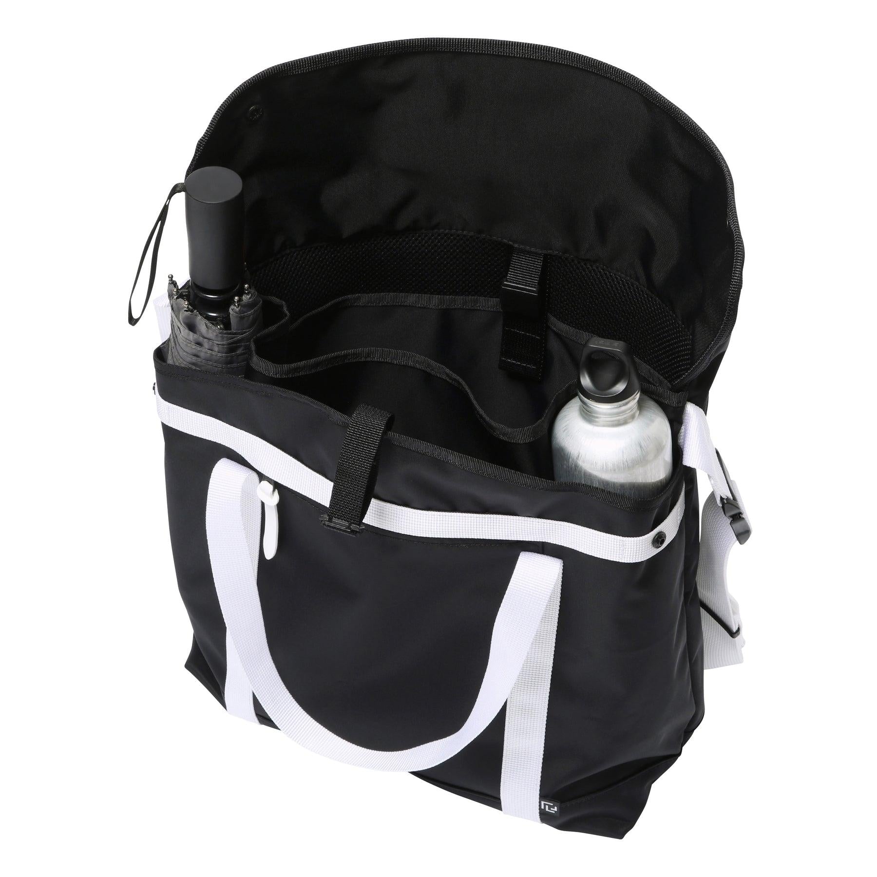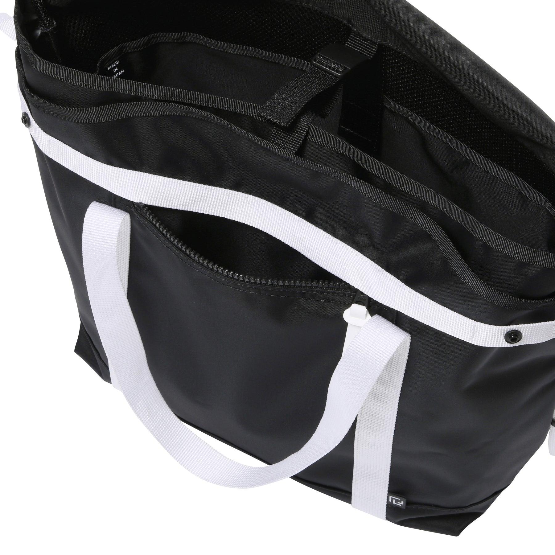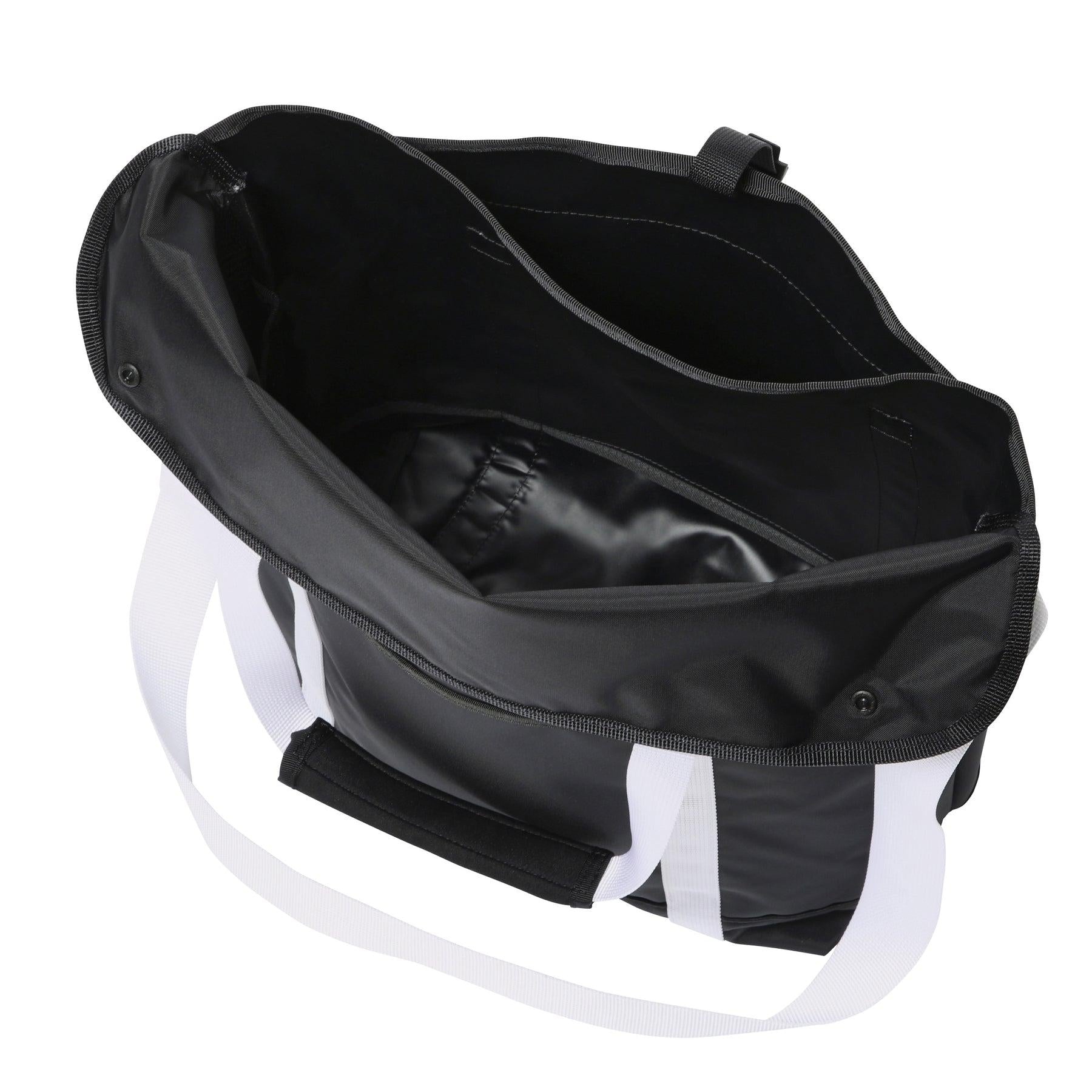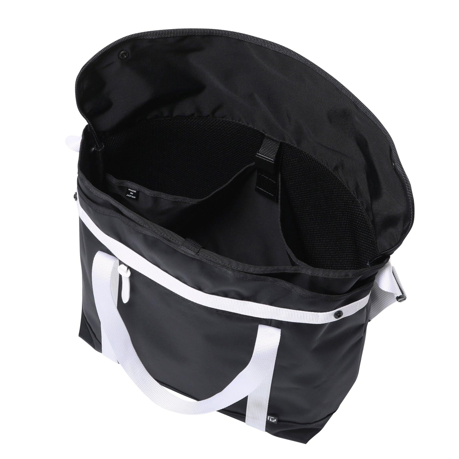 斜挎包肩包,也可用作手提包。除寬敞的主隔層外,內部還有一個可容納 MacBook Pro 16" 筆記本電腦的隔層、一個水瓶袋和三個可放置小雨傘的插槽。這款包攜帶方便,適用於各種場合。SHATI 系列採用單色設計,光滑閃亮的尼龍質地讓人聯想到虎鯨,包身以黑色為主色調,拉鍊拉頭和尼龍帶均為白色。這款特別款還配有白色錶帶,進一步突出了黑白對比。