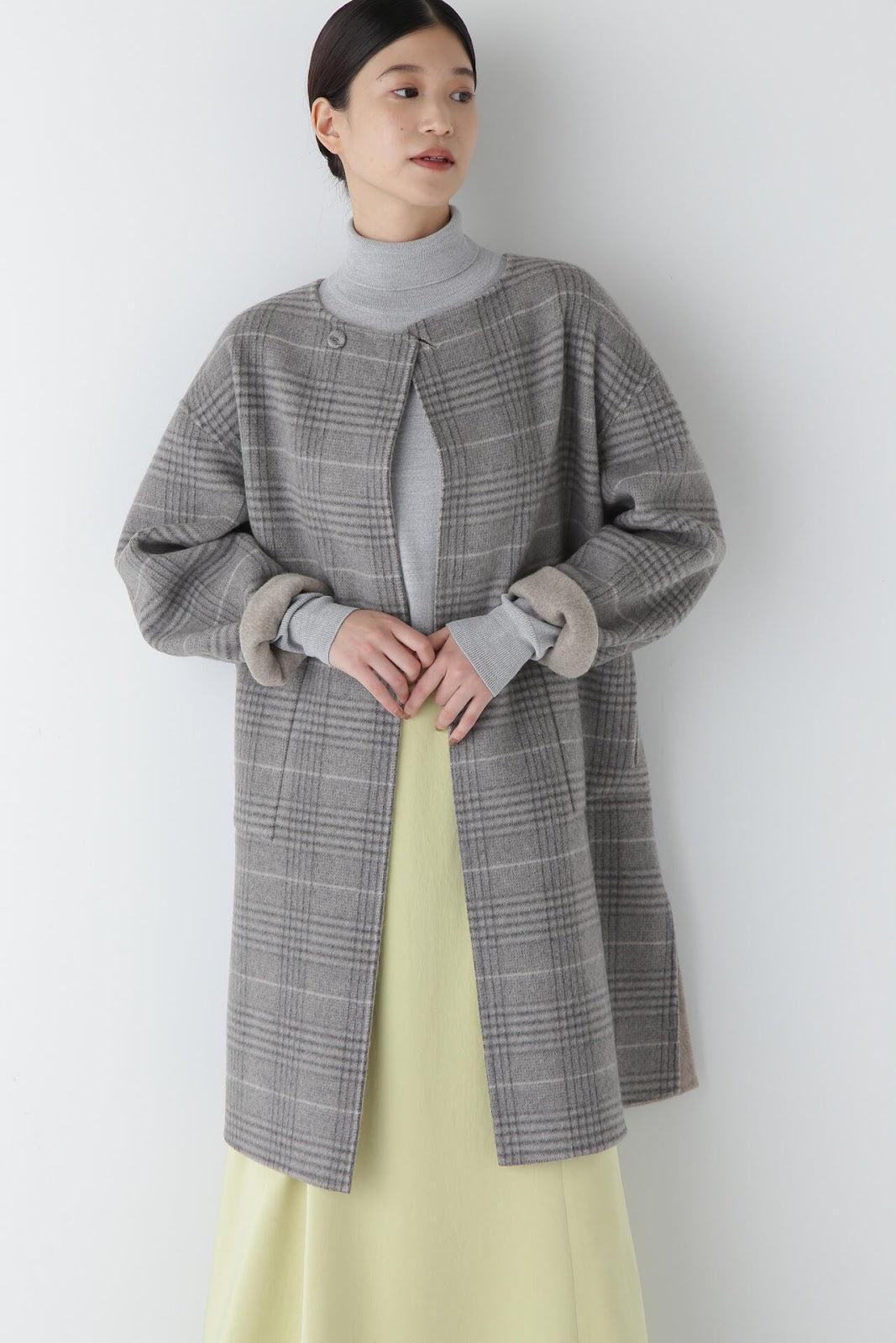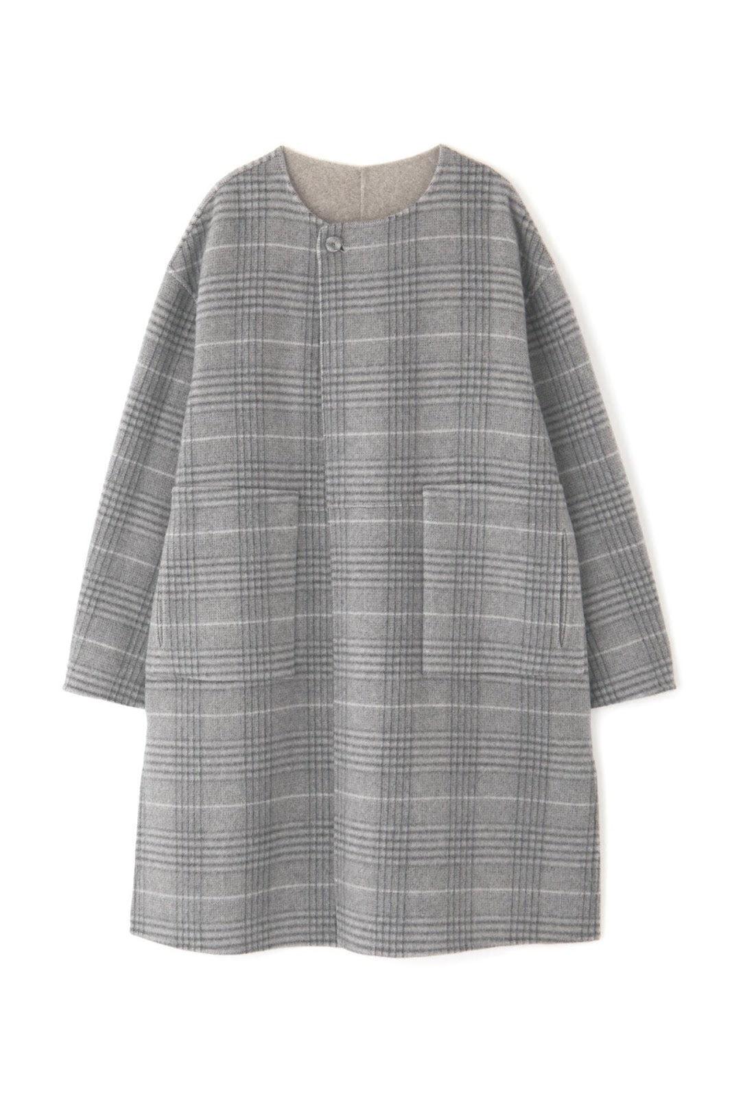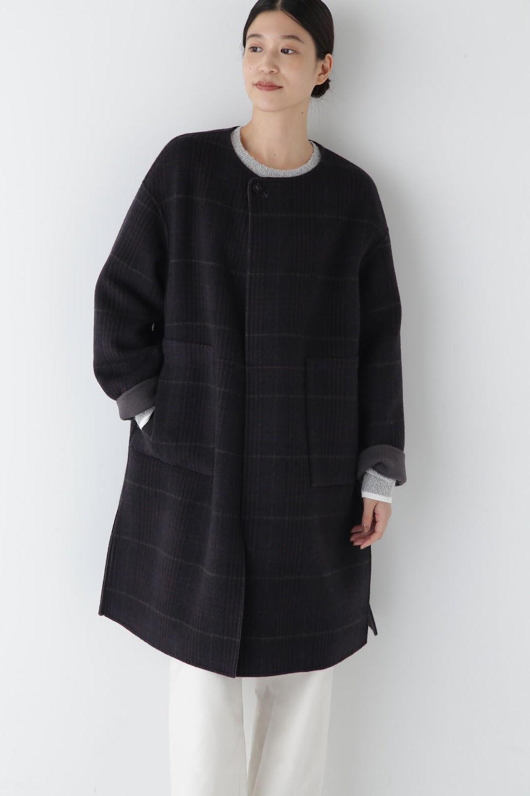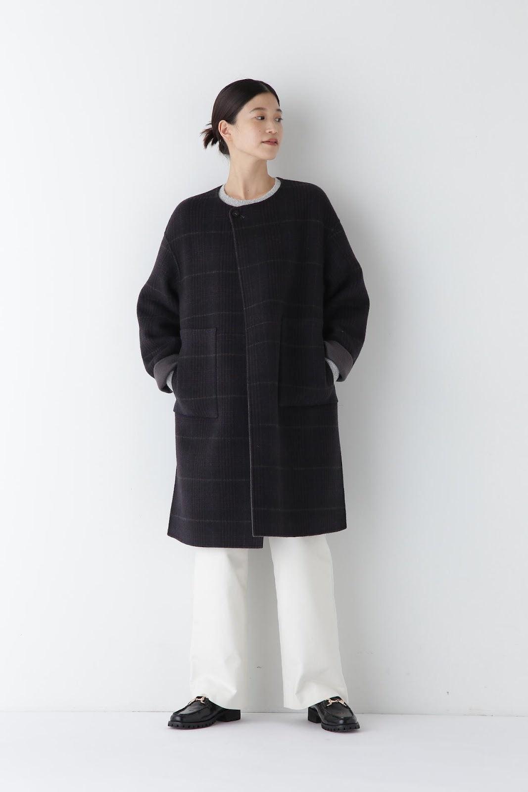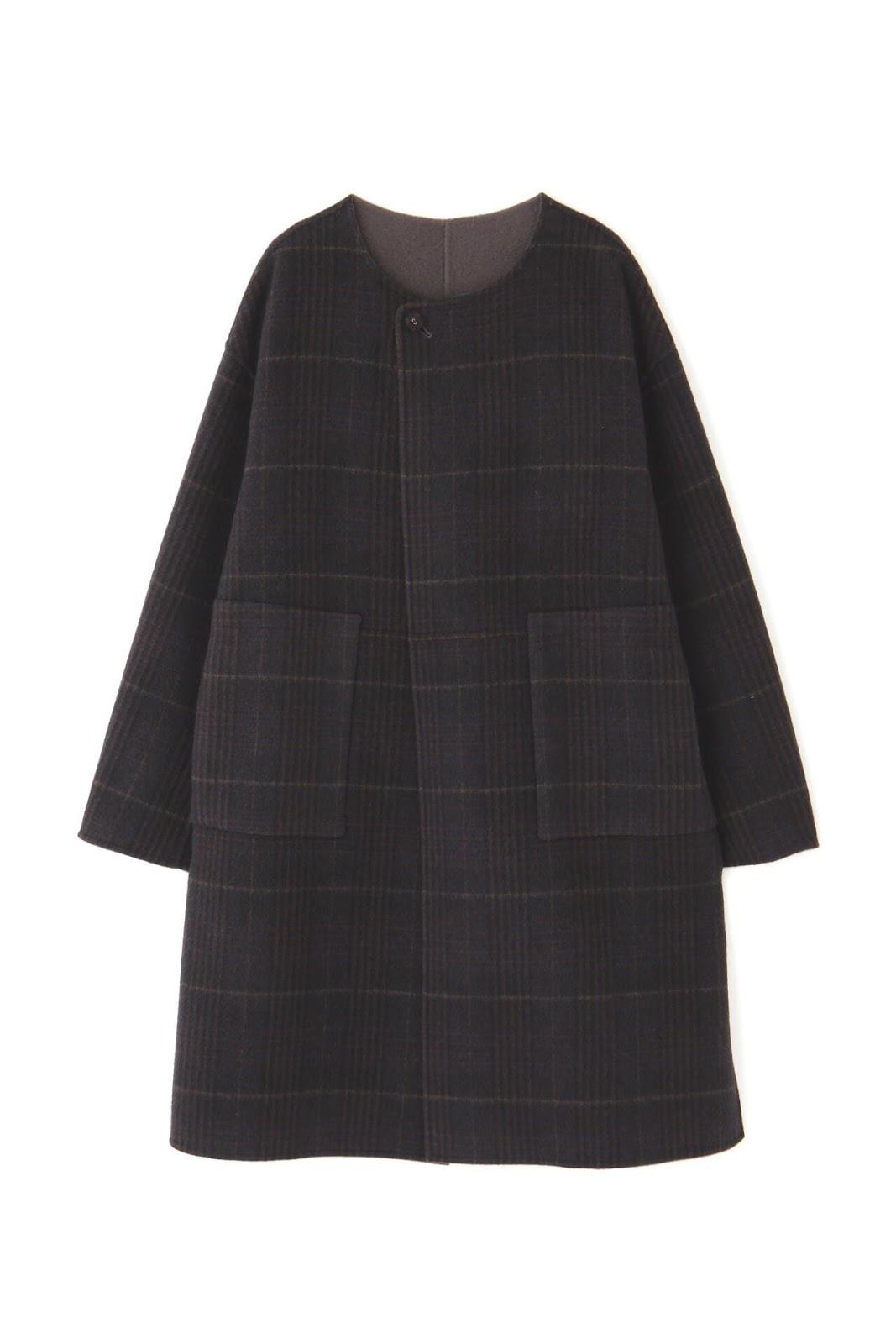 用標準優質材料量身定製的河邊大衣 [設計特色] 這是一款人類女性標準優質河邊大衣。本季採用方領無領款式,前緣寬大。由於採用了完全可翻轉的縫製和可翻轉的規格,因此可以將兩側朝外穿著。重點還在於通過剝離塔夫綢加工而成的鴿子孔胡桃木紐扣。面料由雙面凸起的梅爾頓製成,帶有優雅的毛皮。本季增加了紋路,以延長穿著時間。一面為原色格倫格子。推薦座標】奢華的反縫剪裁,只需穿上它,就能彰顯高貴氣質。無論在線上還是線下,它都能活躍起來。雙面設計可讓您根據心情享受不同的印象。