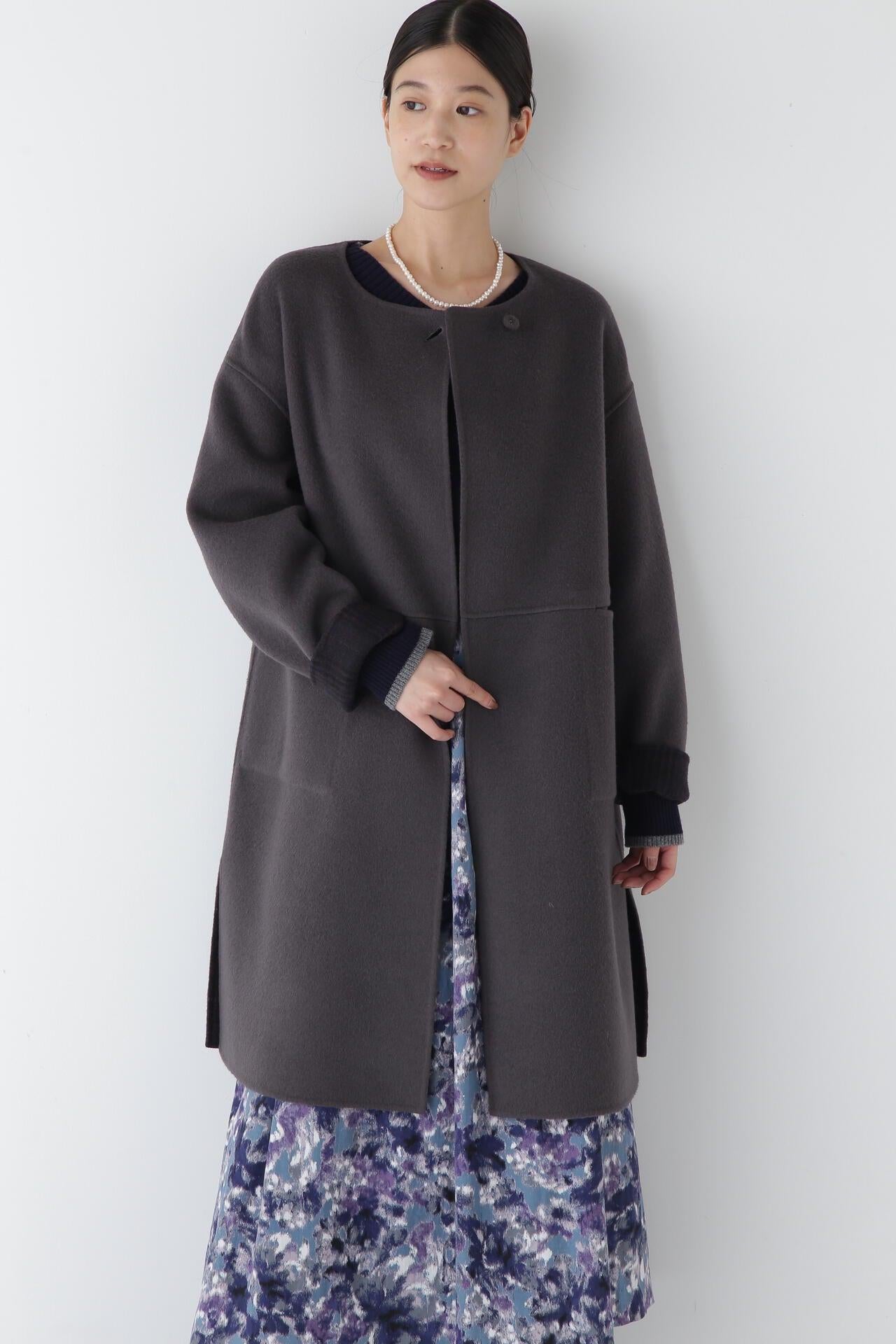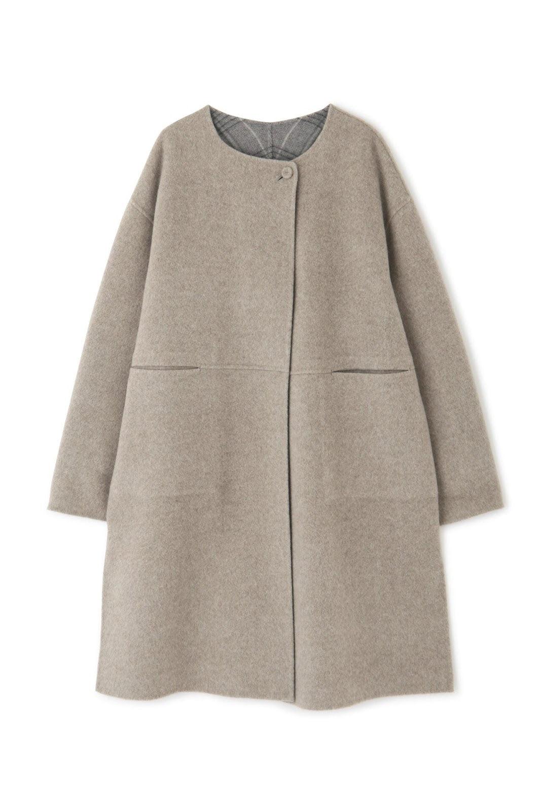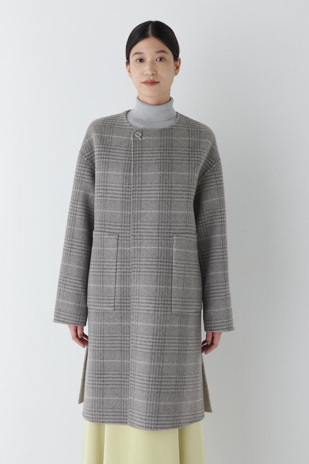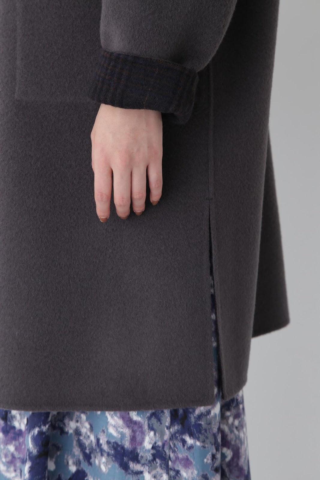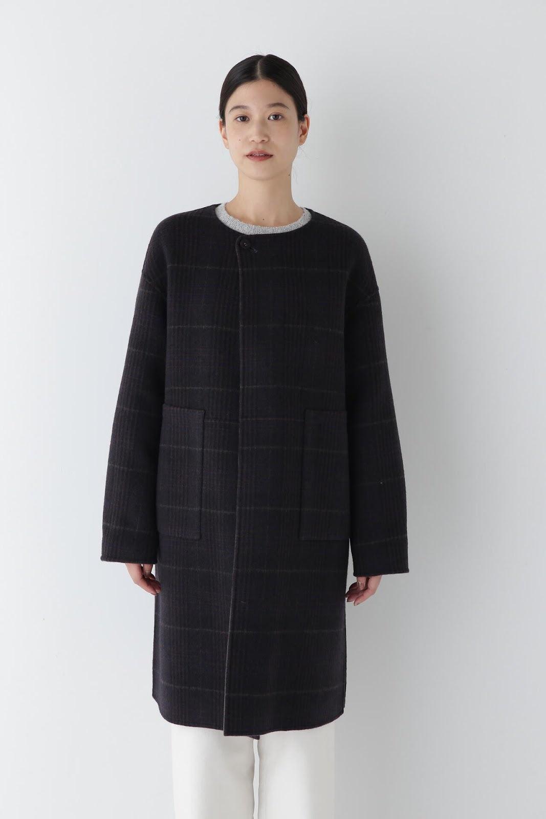 用標準優質材料量身定製的河邊大衣 [設計特色] 這是一款人類女性標準優質河邊大衣。本季採用方領無領款式,前緣寬大。由於採用了完全可翻轉的縫製和可翻轉的規格,因此可以將兩側朝外穿著。重點還在於通過剝離塔夫綢加工而成的鴿子孔胡桃木紐扣。面料由雙面凸起的梅爾頓製成,帶有優雅的毛皮。本季增加了紋路,以延長穿著時間。一面為原色格倫格子。推薦座標】奢華的反縫剪裁,只需穿上它,就能彰顯高貴氣質。無論在線上還是線下,它都能活躍起來。雙面設計可讓您根據心情享受不同的印象。