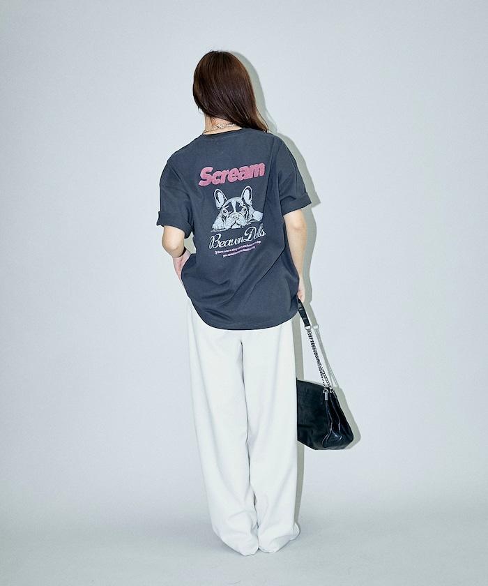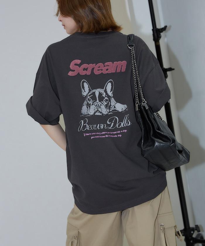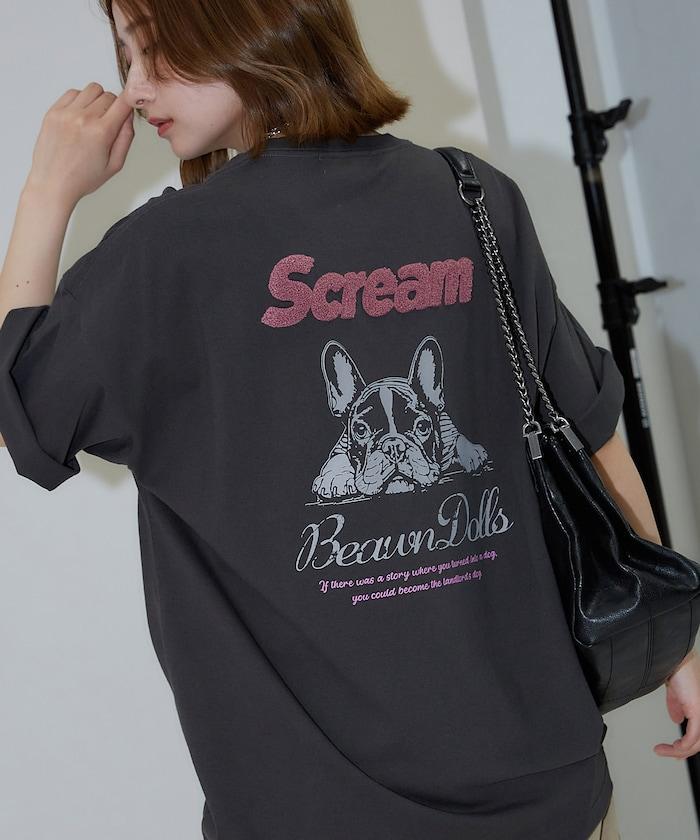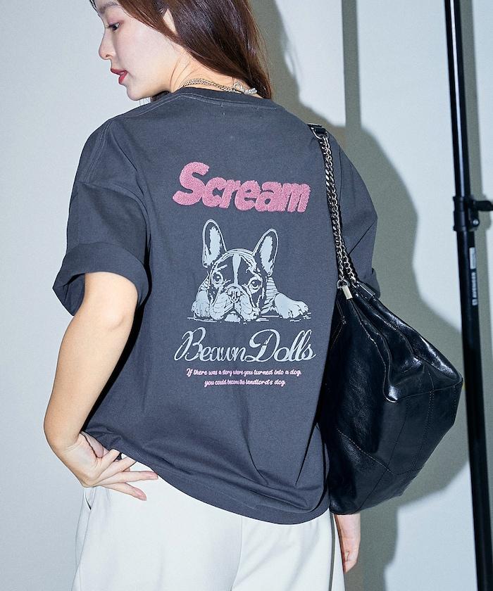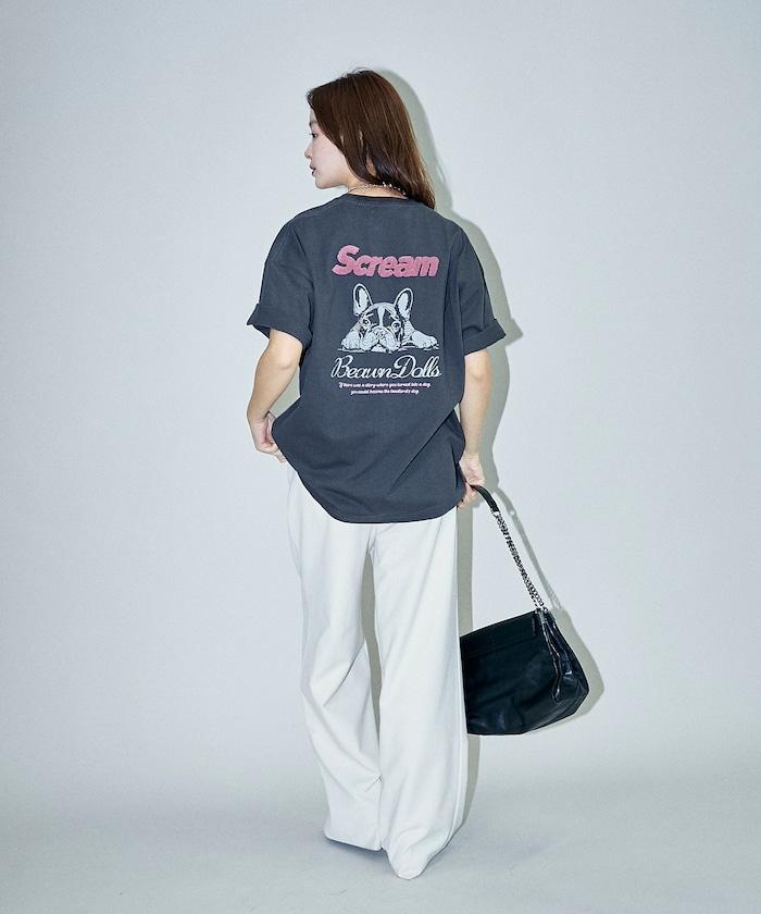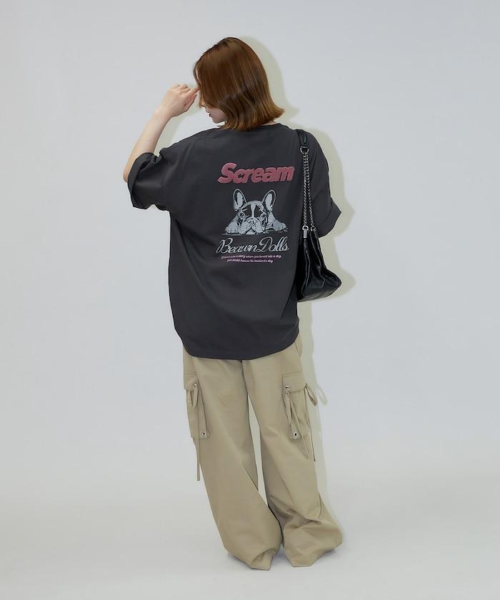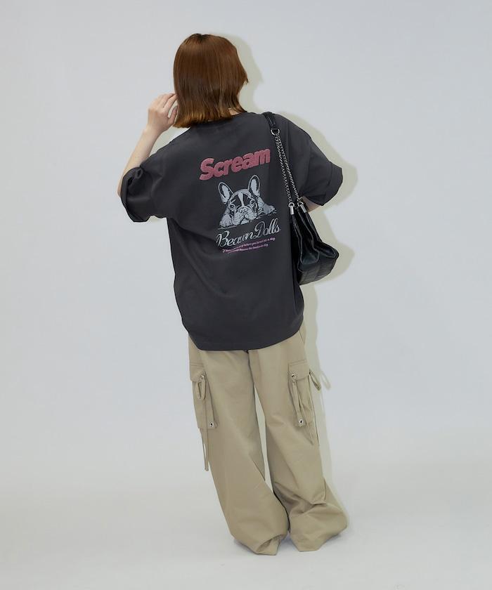 背面印有可愛法國鬥牛犬圖案的 T 恤。