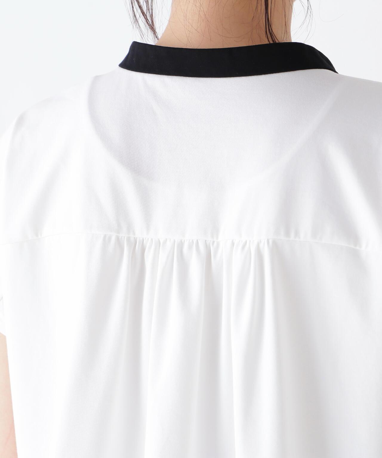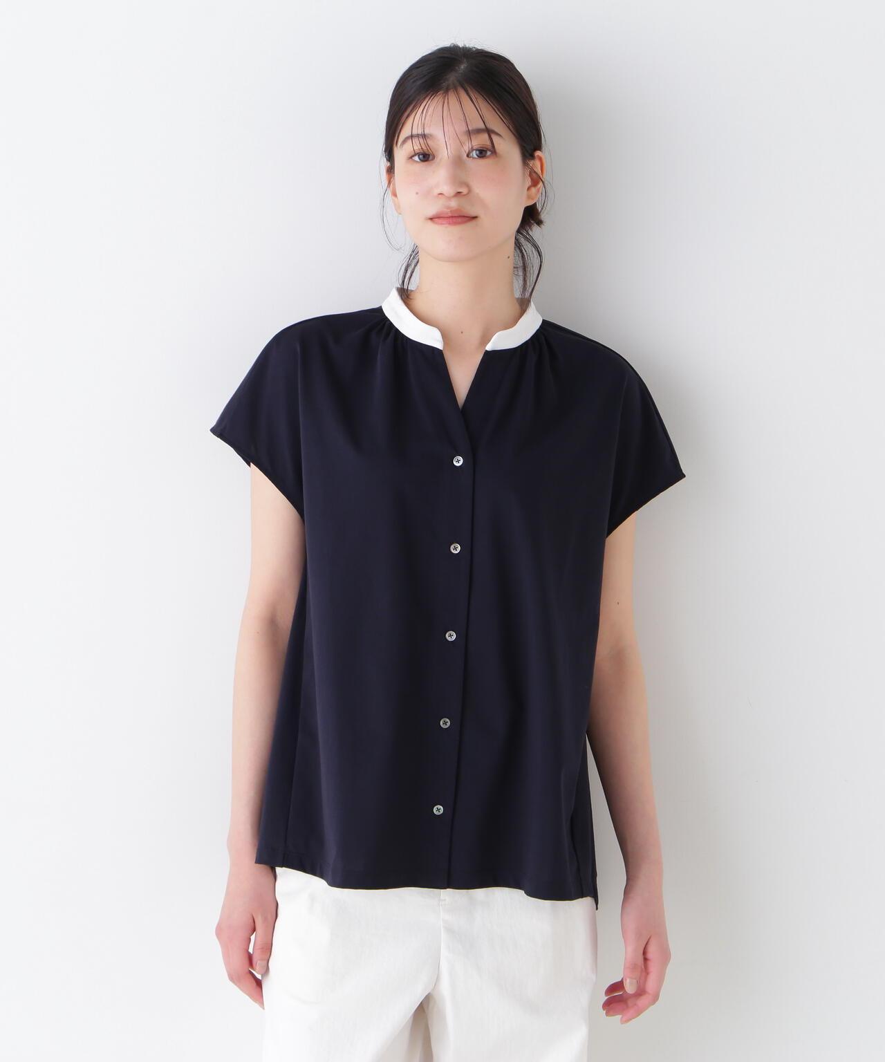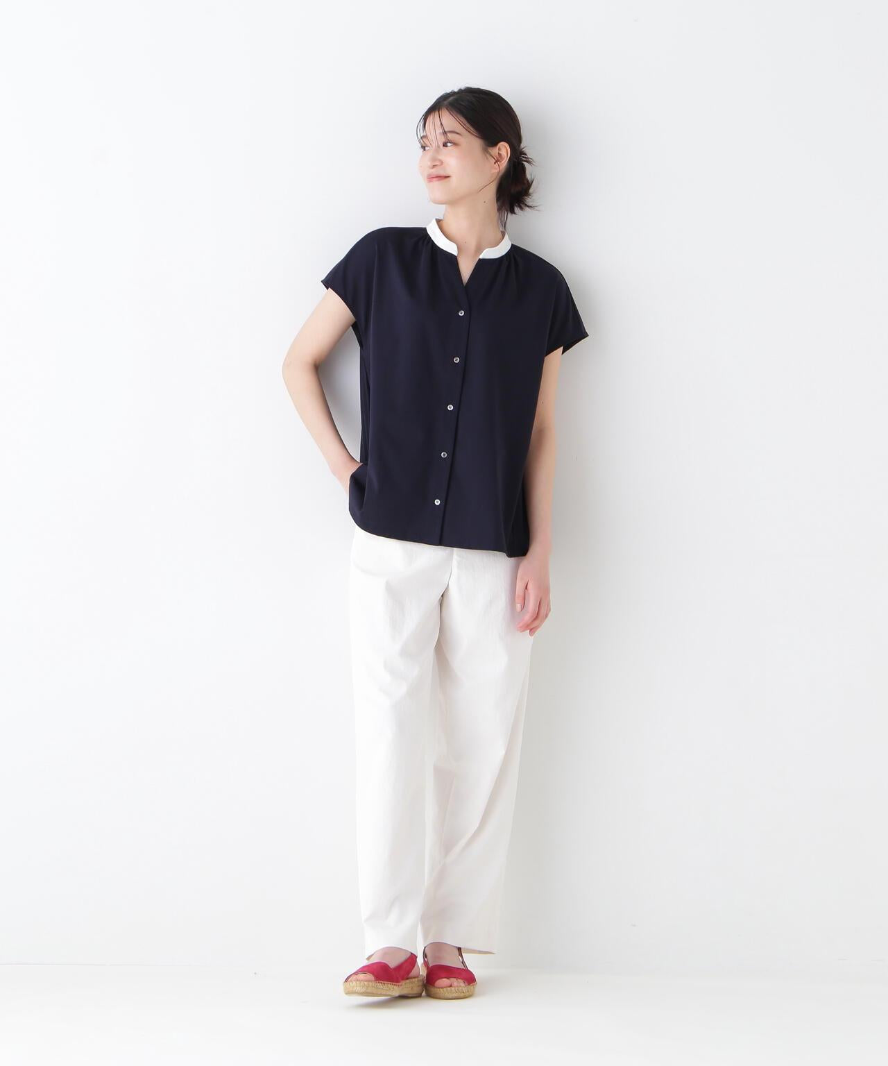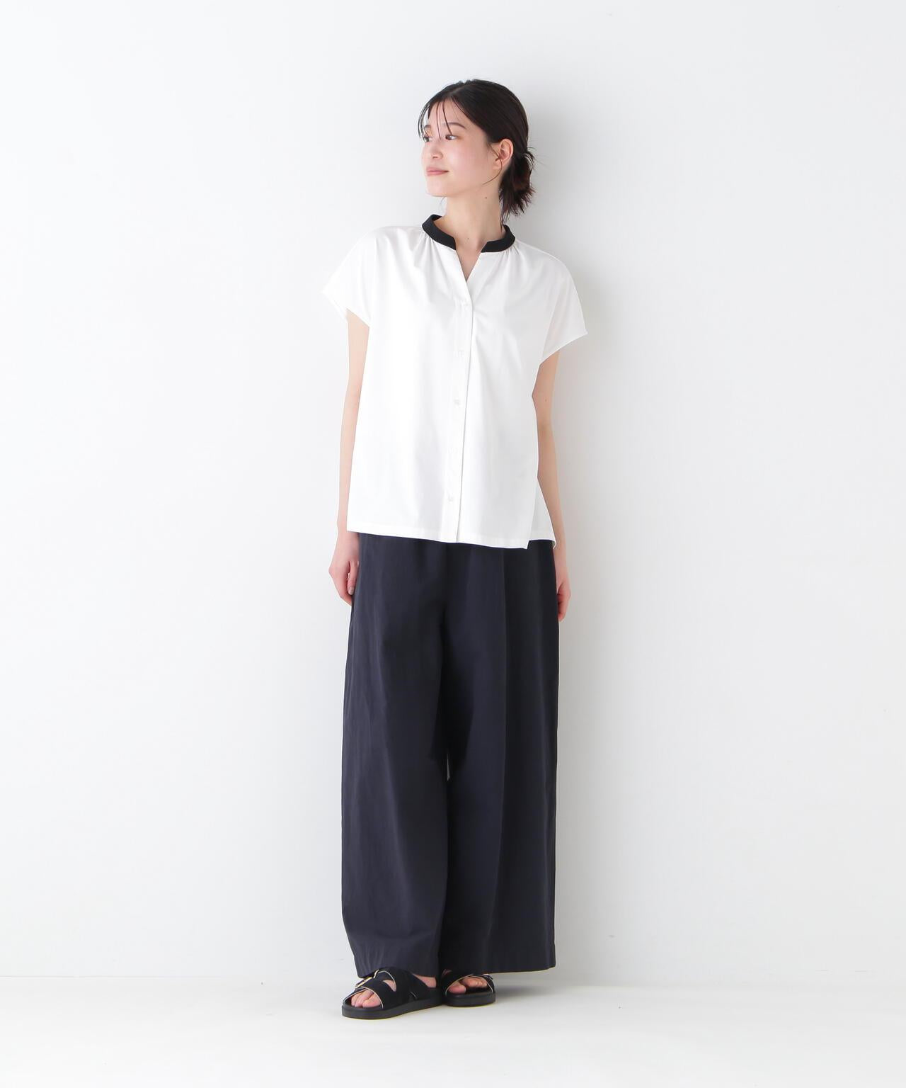 簡潔、舒適、襯衫式的剪裁和縫製 [設計要點] 這款法式袖船長襯衫由針織物製成,就像梭織襯衫一樣。領子由相同的材料製成,顏色與教士襯衫相似。上衣由高規格電鍍針織布製成,表面如梭織般緊密,觸感微涼。它的另一個特點是觸感輕盈,接觸時有涼爽的感覺。襯衫式的剪裁和縫紉面料穿著舒適,手感整潔,適合上班和下班穿著。