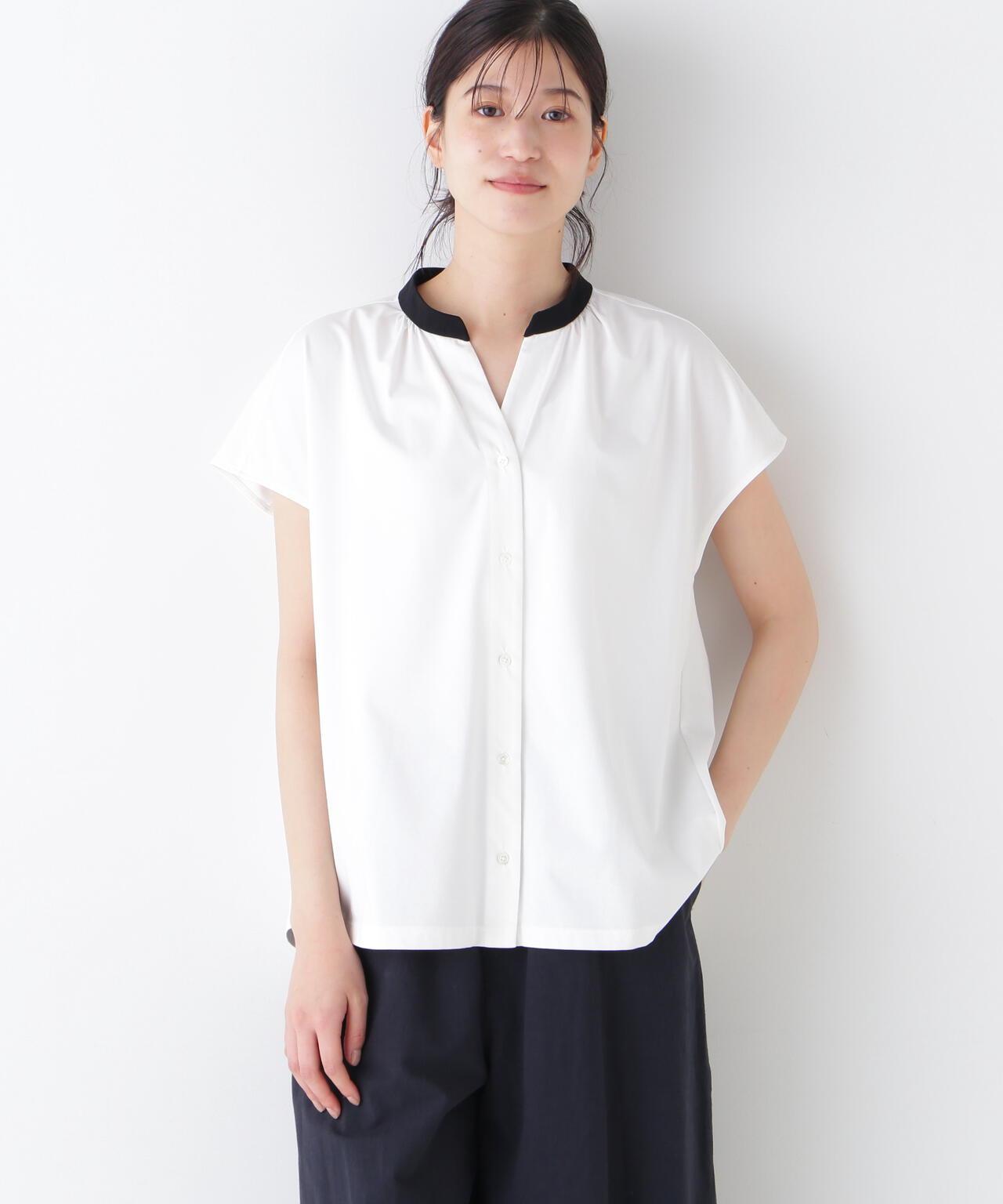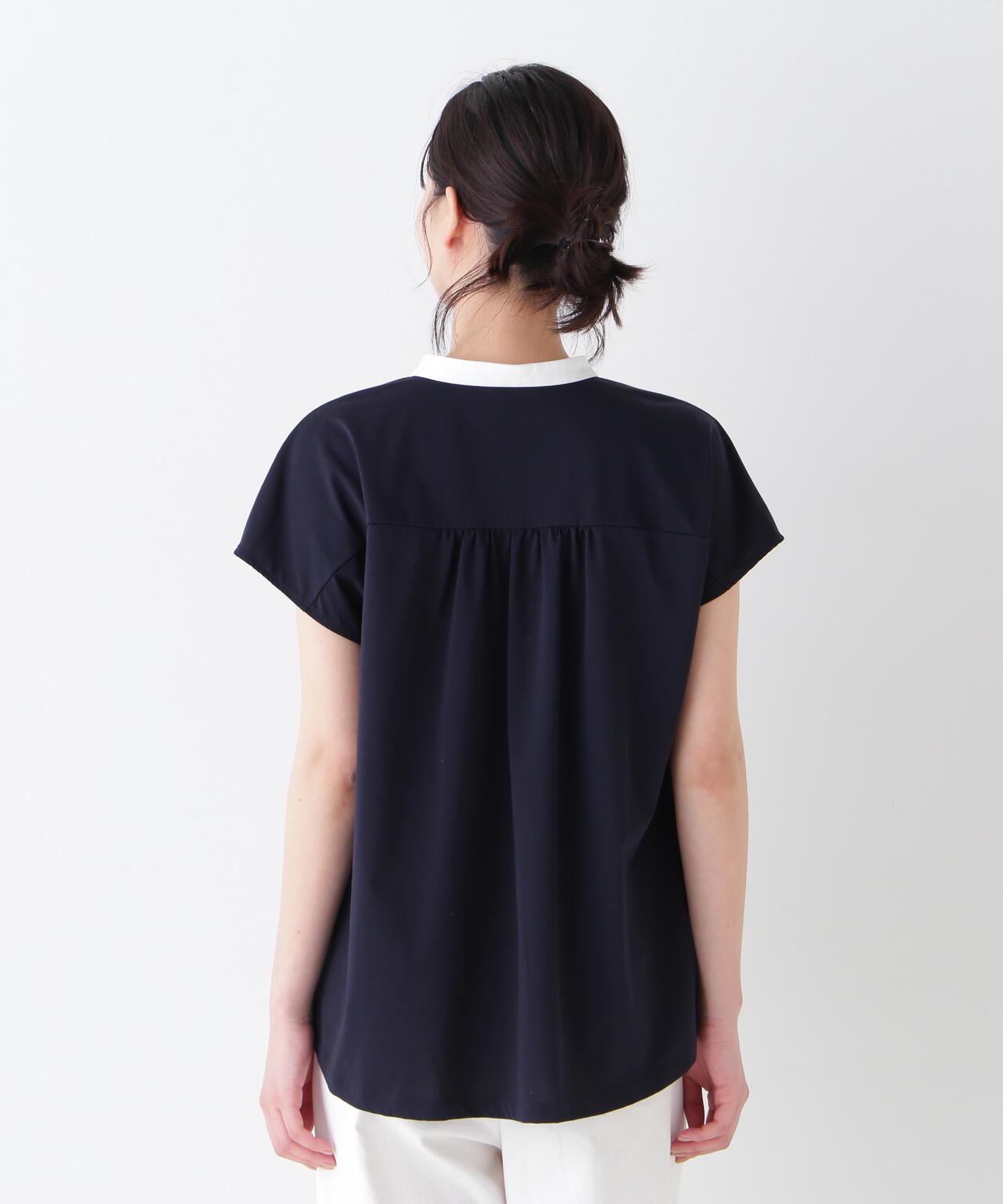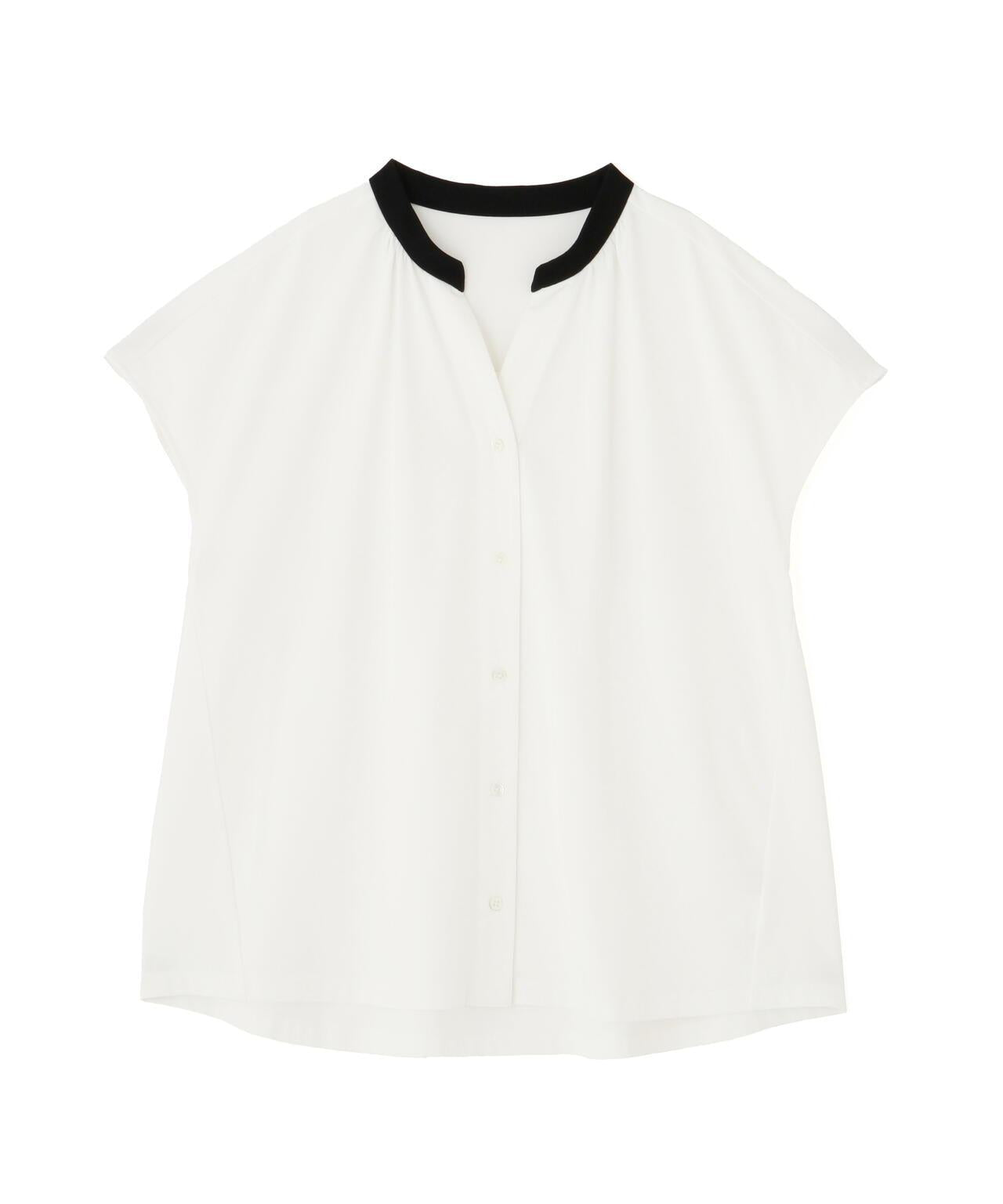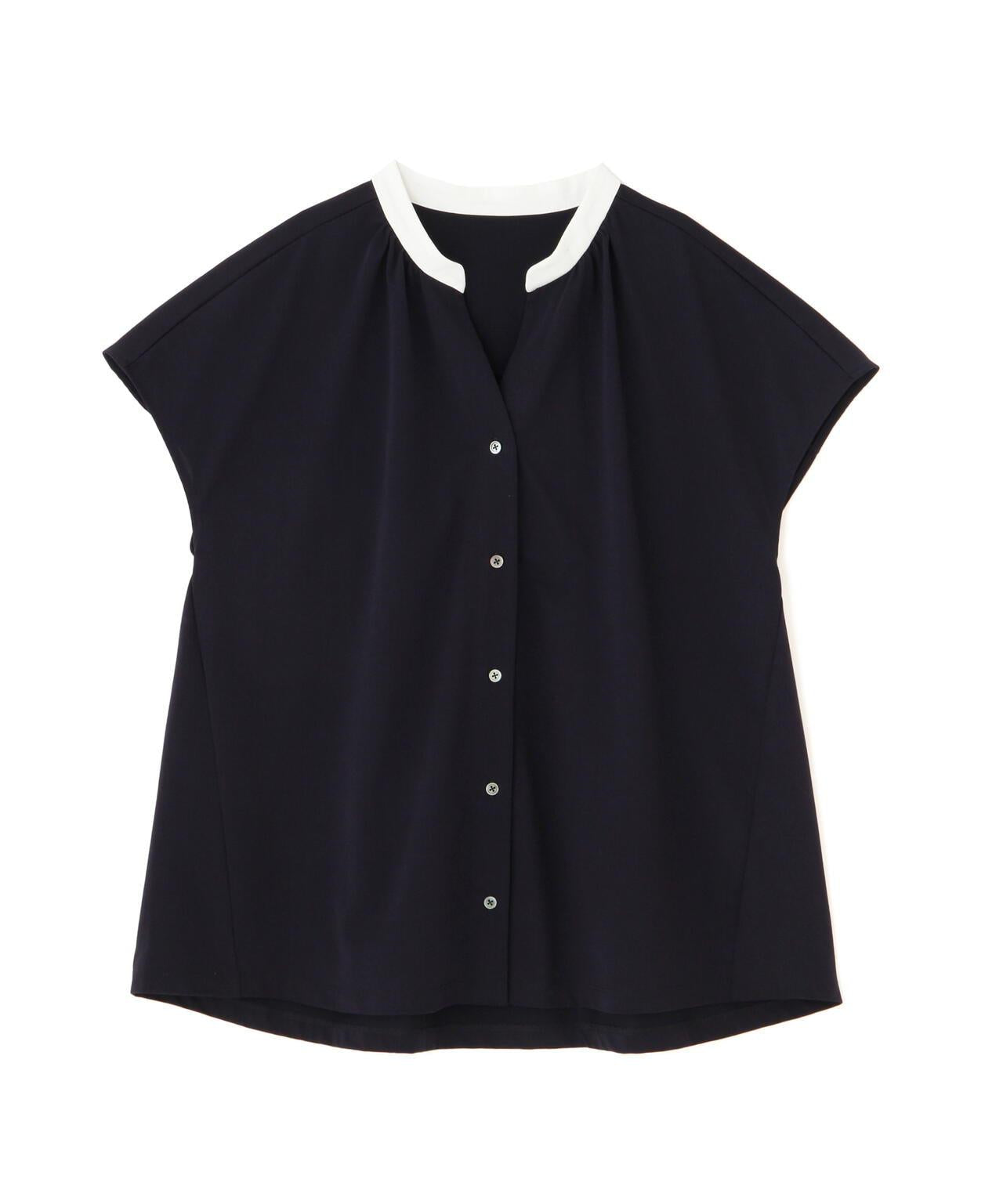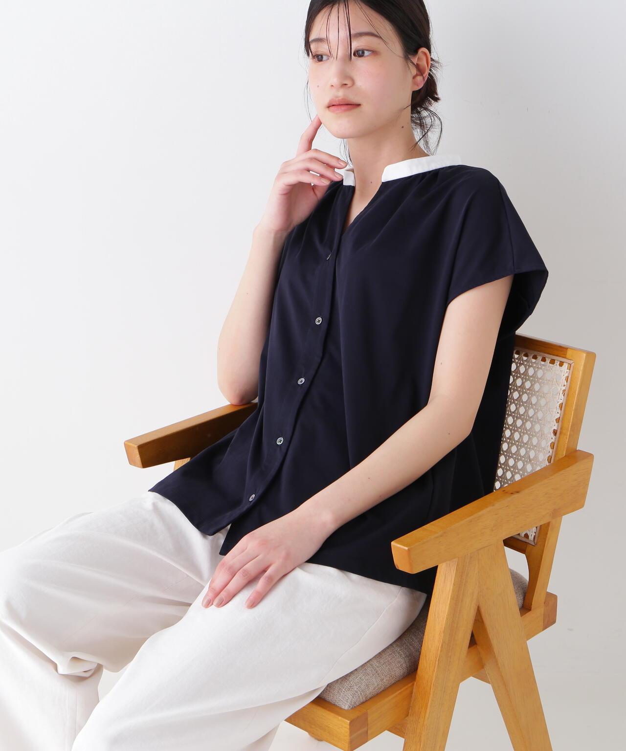 簡潔、舒適、襯衫式的剪裁和縫製 [設計要點] 這款法式袖船長襯衫由針織物製成,就像梭織襯衫一樣。領子由相同的材料製成,顏色與教士襯衫相似。上衣由高規格電鍍針織布製成,表面如梭織般緊密,觸感微涼。它的另一個特點是觸感輕盈,接觸時有涼爽的感覺。襯衫式的剪裁和縫紉面料穿著舒適,手感整潔,適合上班和下班穿著。