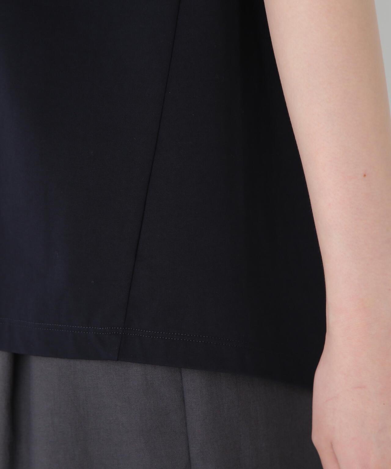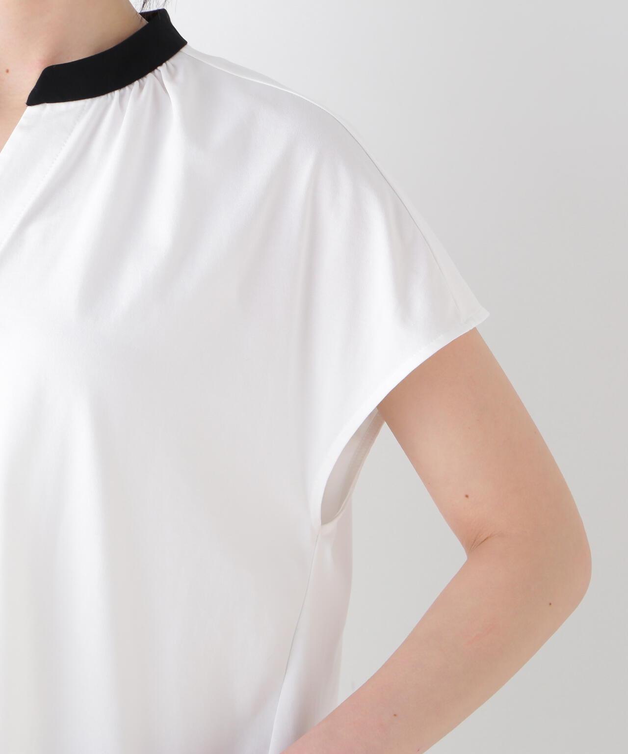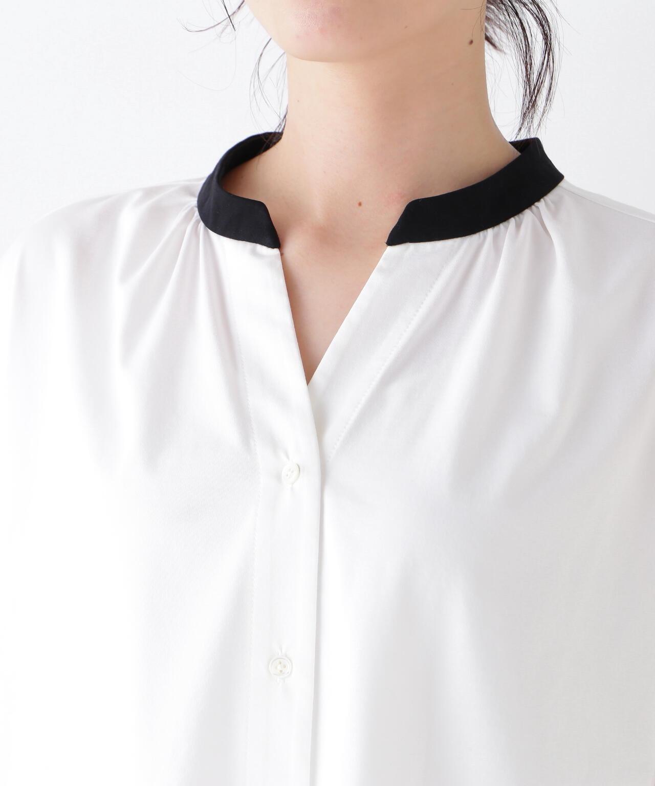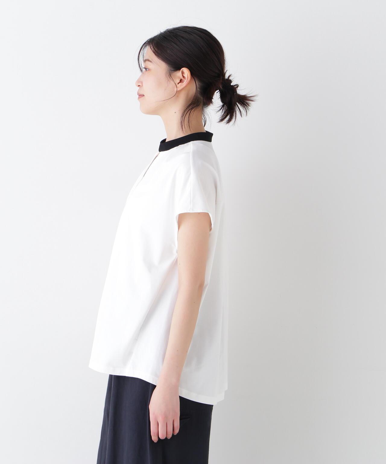 簡潔、舒適、襯衫式的剪裁和縫製 [設計要點] 這款法式袖船長襯衫由針織物製成,就像梭織襯衫一樣。領子由相同的材料製成,顏色與教士襯衫相似。上衣由高規格電鍍針織布製成,表面如梭織般緊密,觸感微涼。它的另一個特點是觸感輕盈,接觸時有涼爽的感覺。襯衫式的剪裁和縫紉面料穿著舒適,手感整潔,適合上班和下班穿著。
