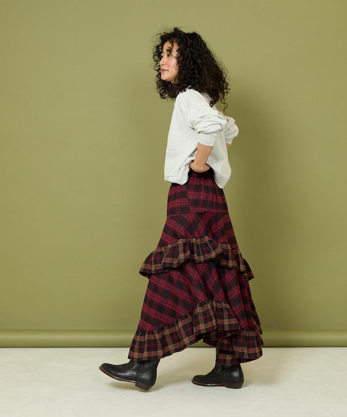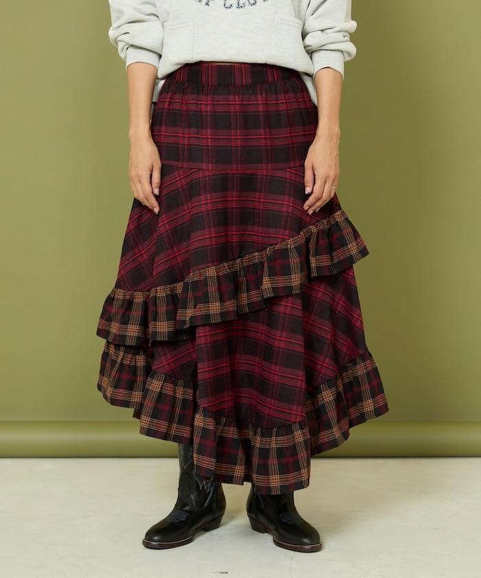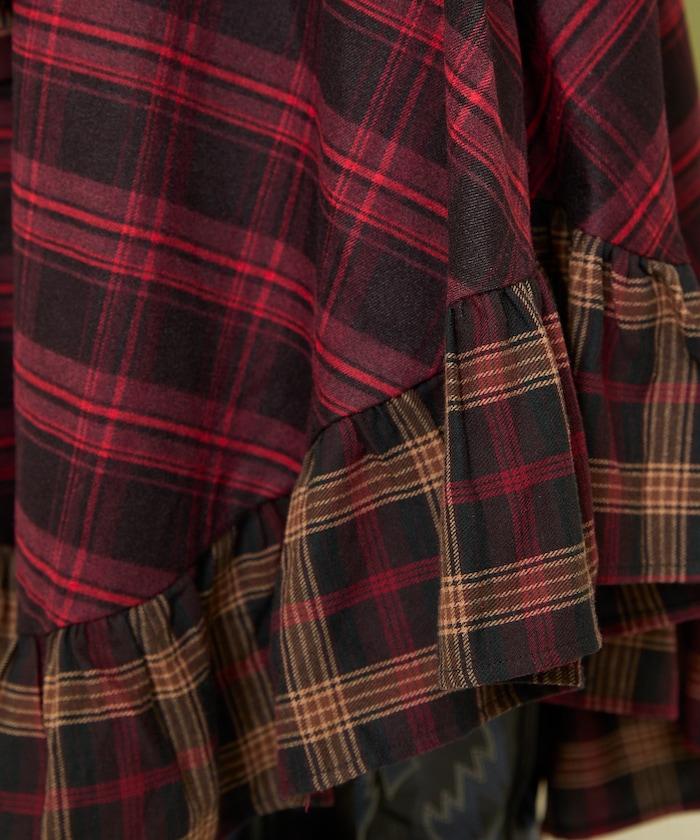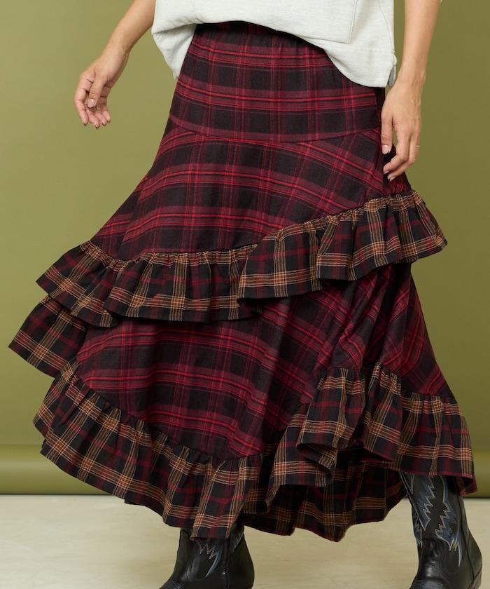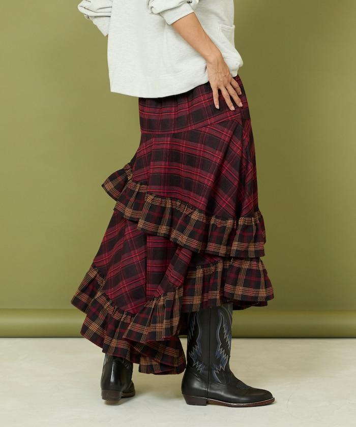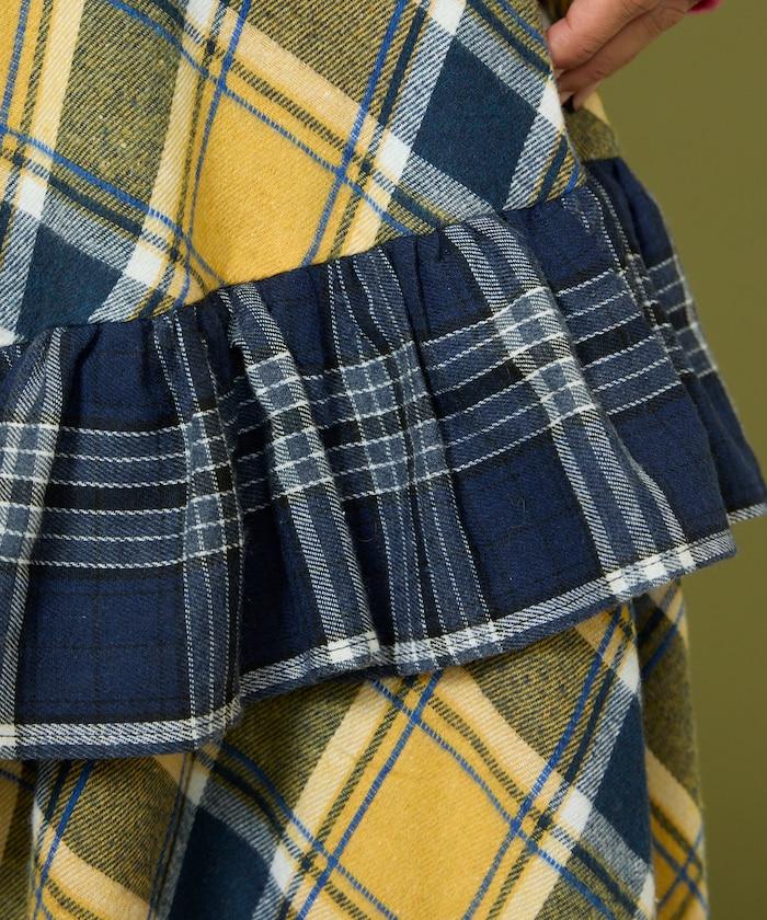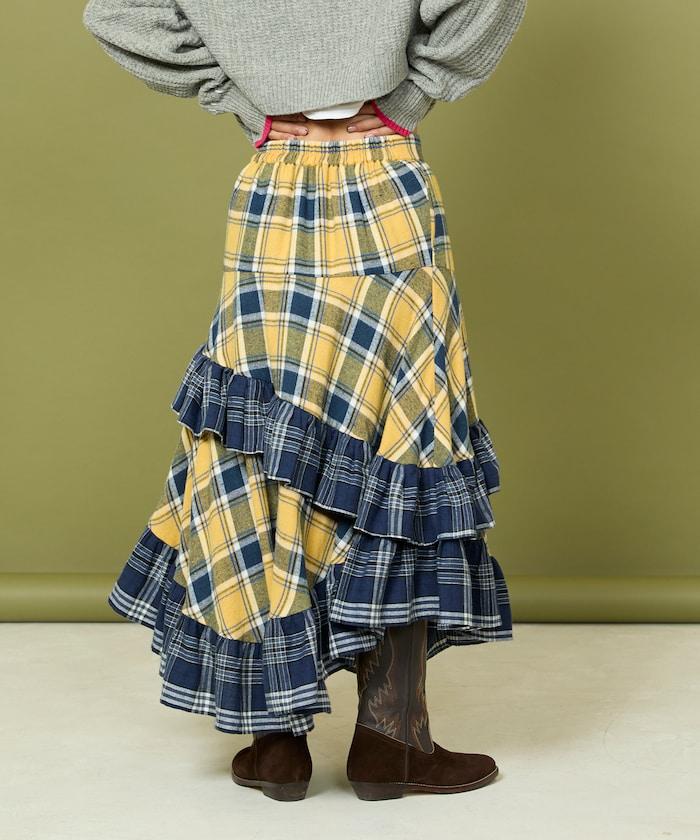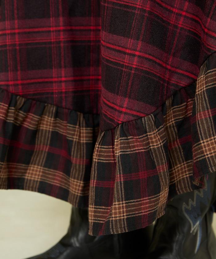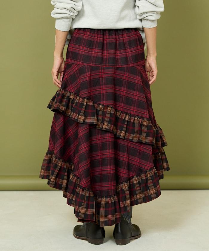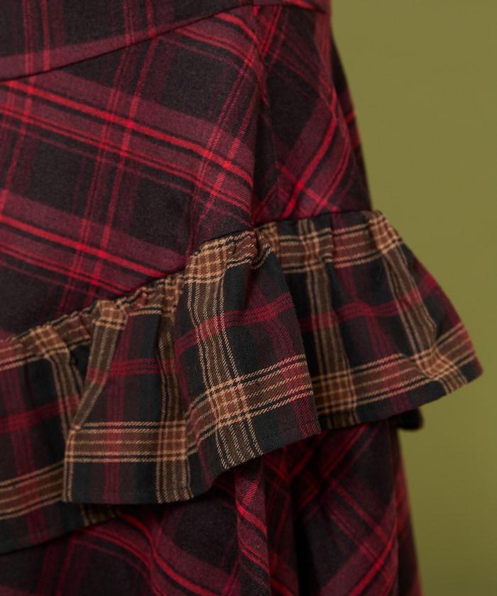 預約商品法蘭絨格紋不對稱荷葉邊半身裙