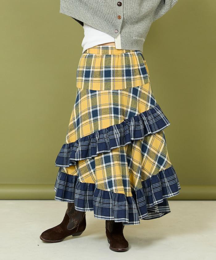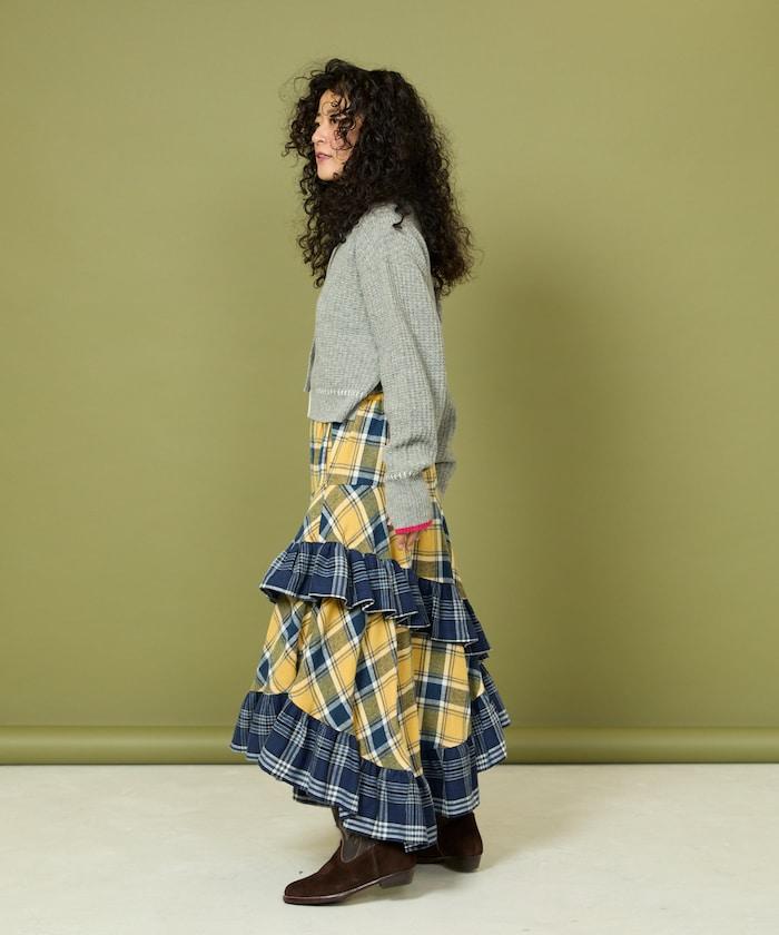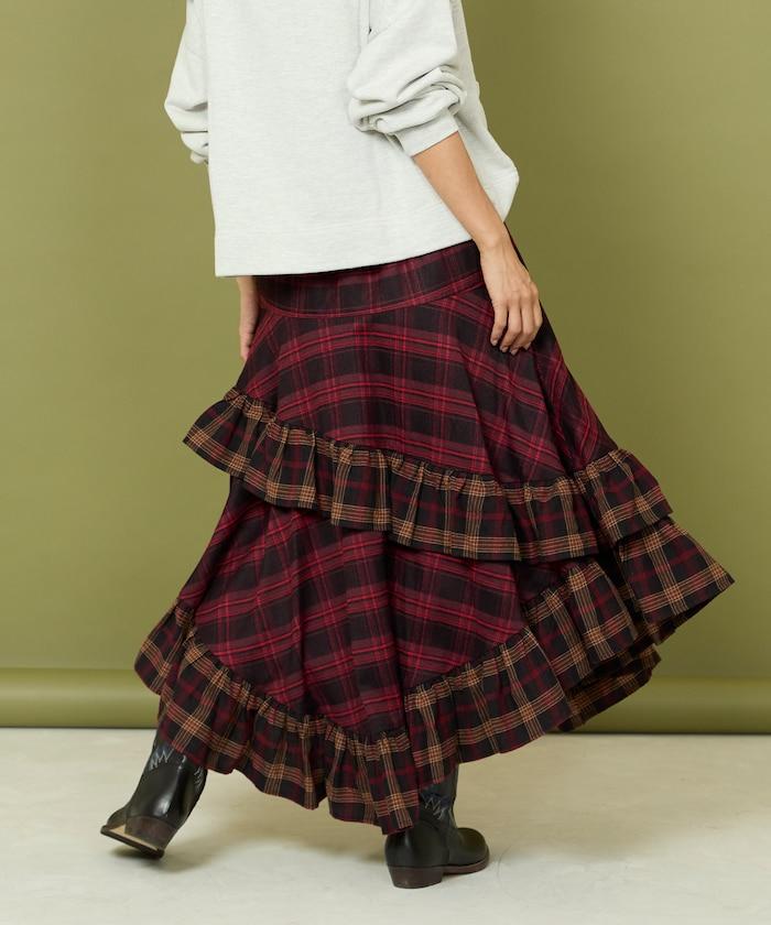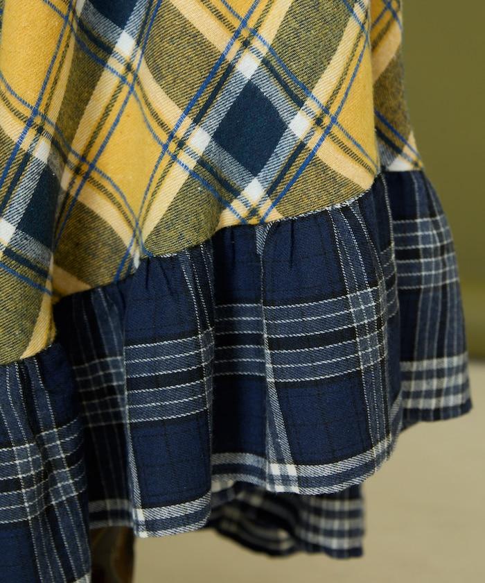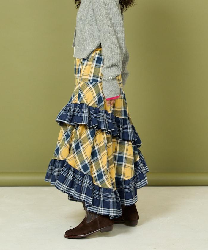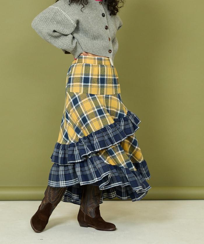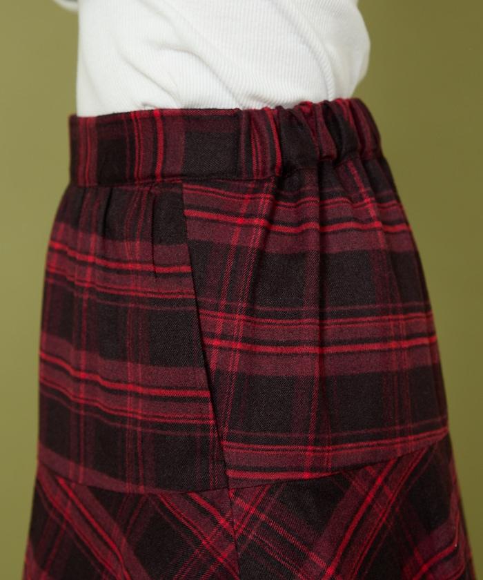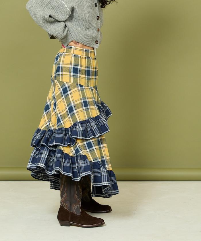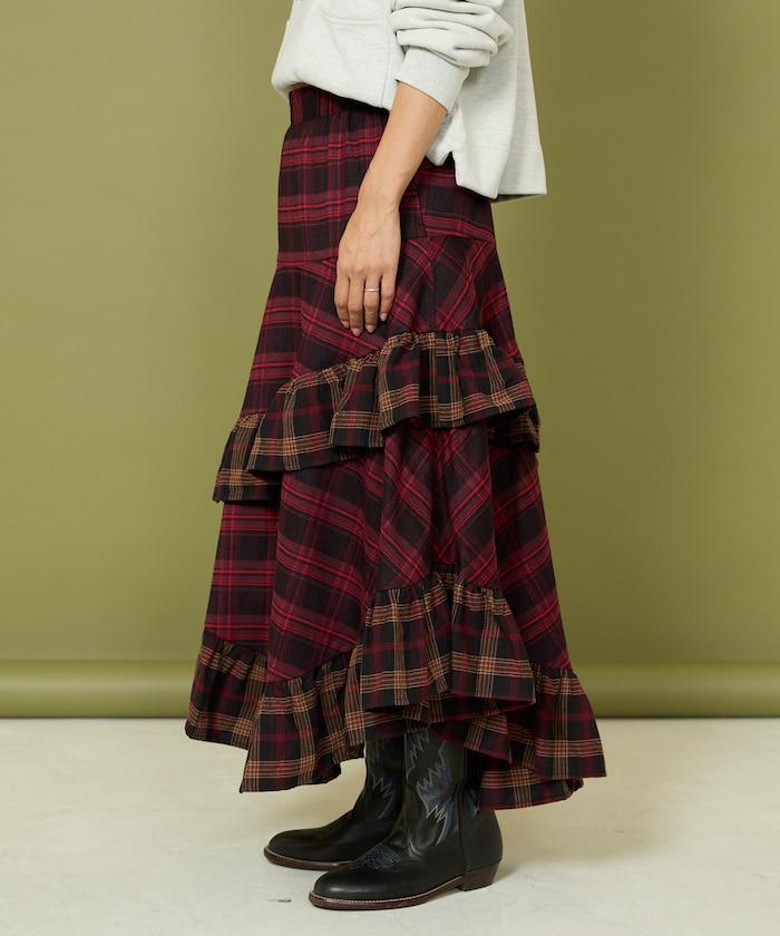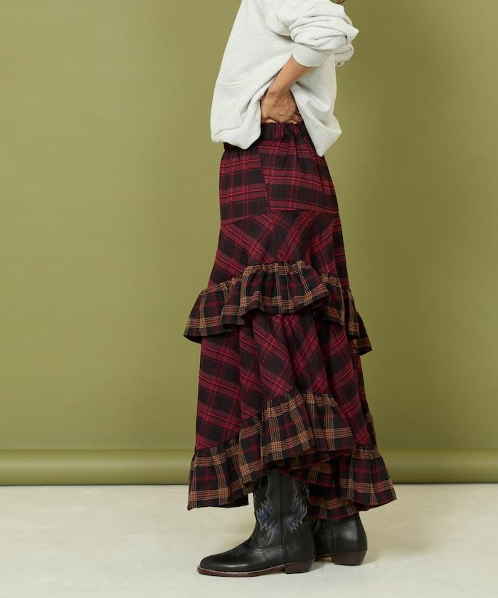 預約商品法蘭絨格紋不對稱荷葉邊半身裙