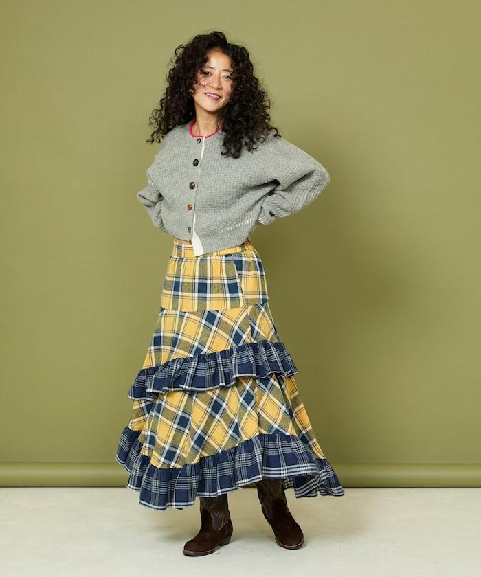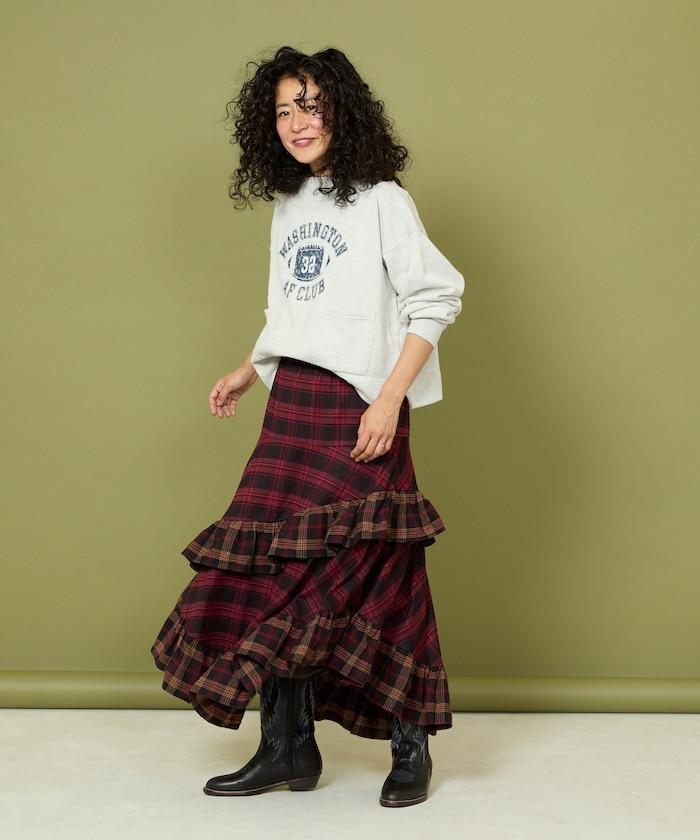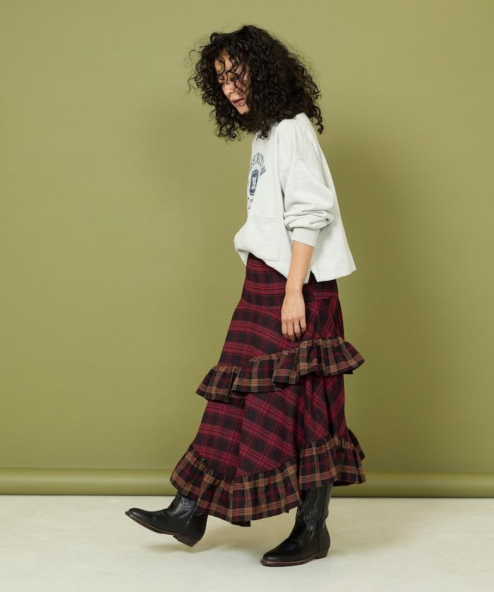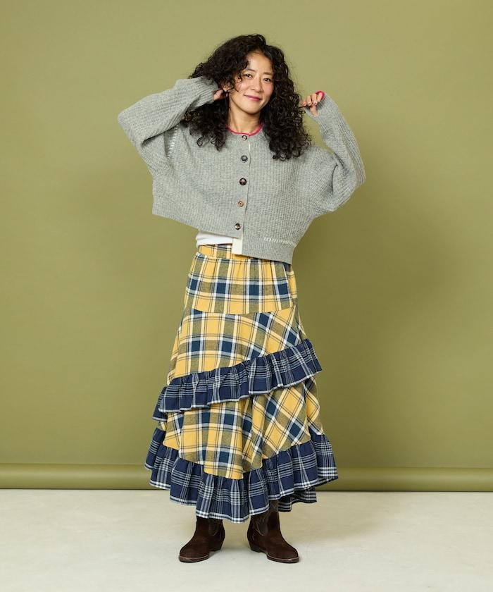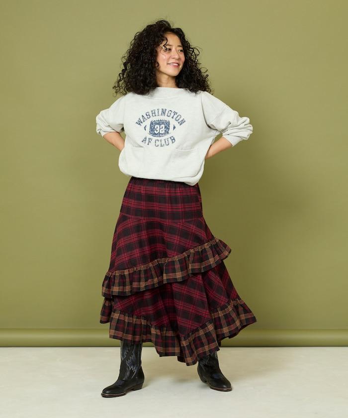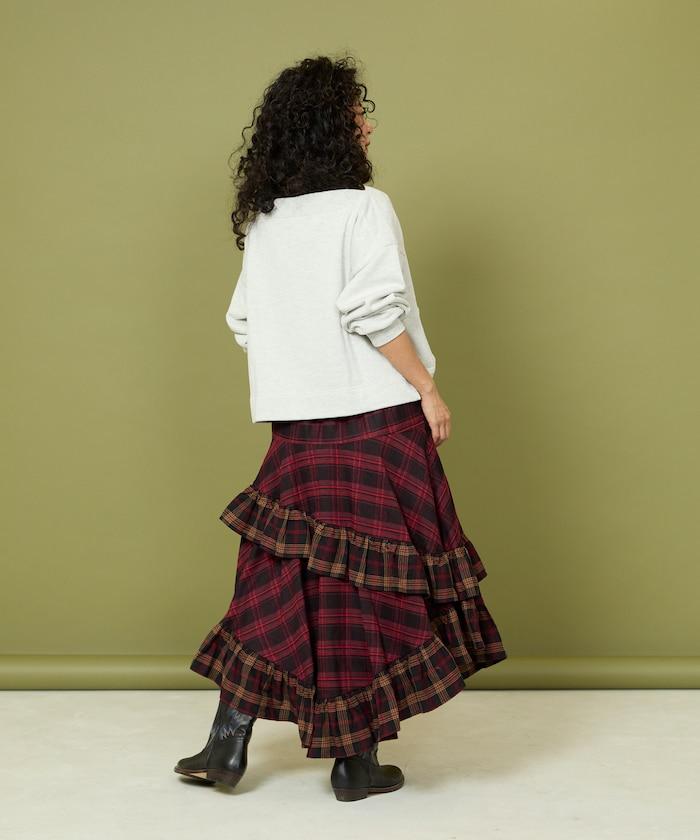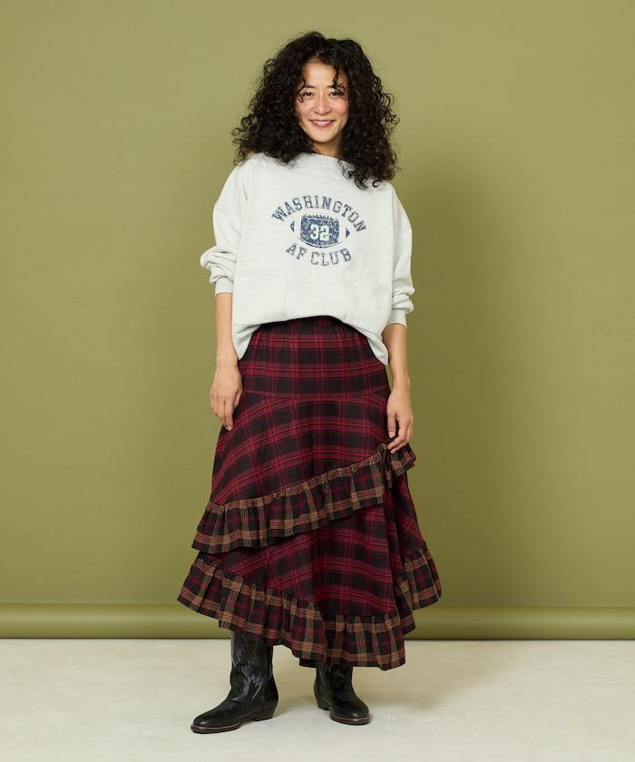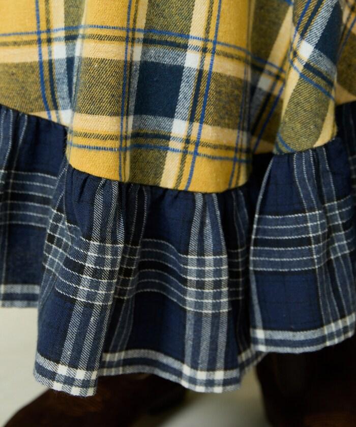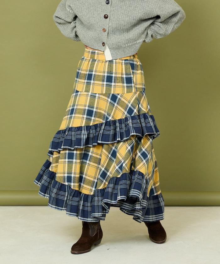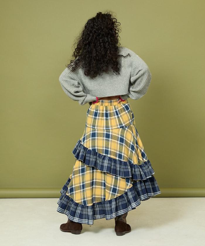 預約商品法蘭絨格紋不對稱荷葉邊半身裙