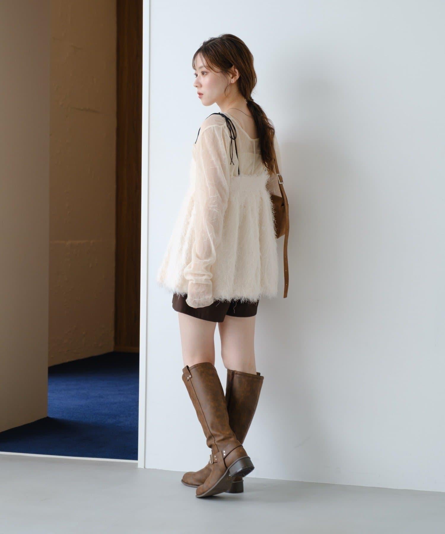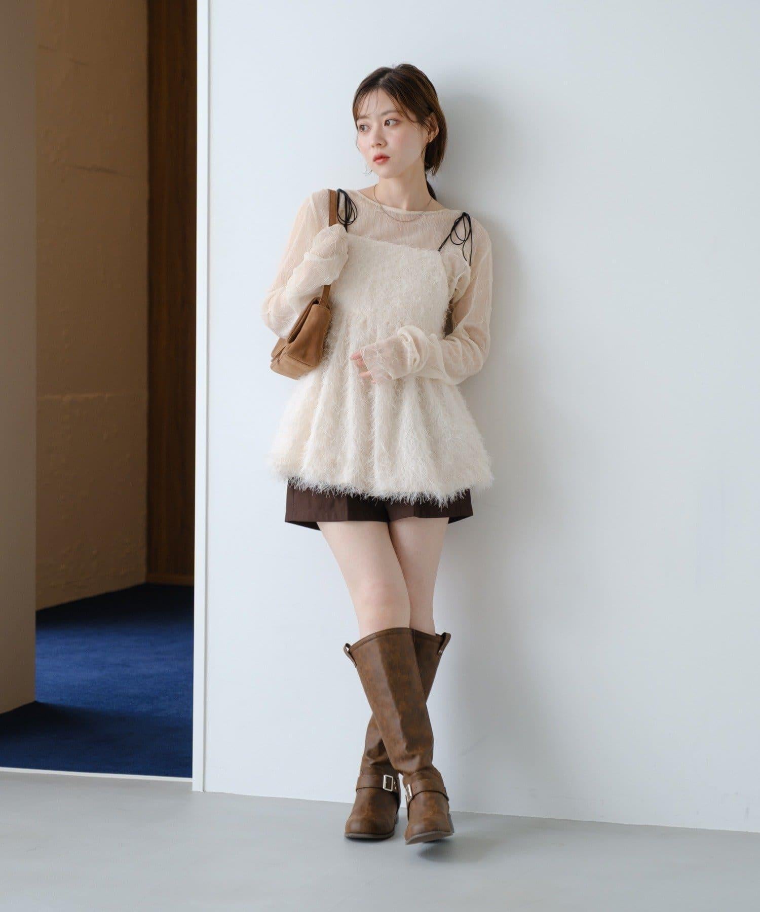 與透視上衣和高領毛衣疊穿,打造時髦造型。