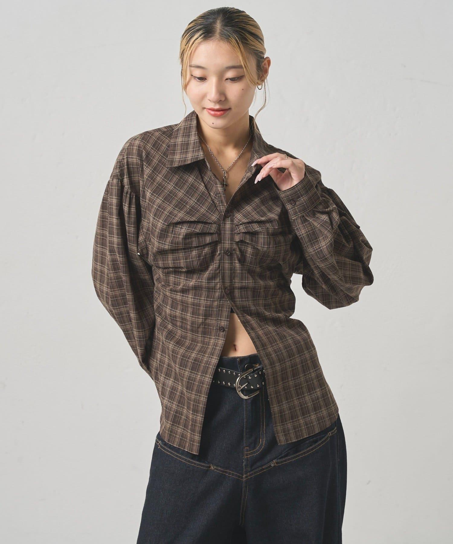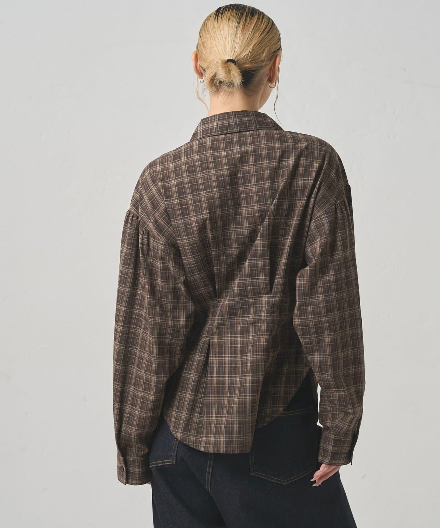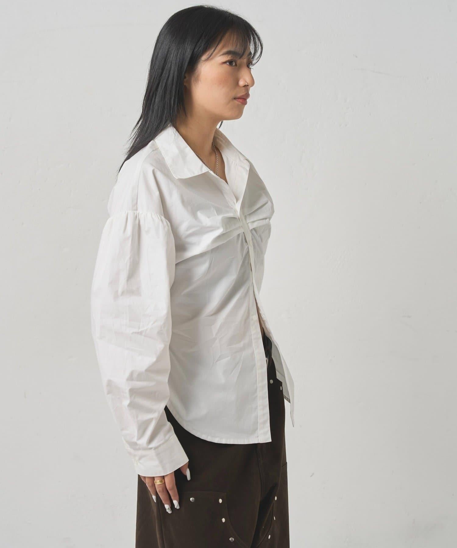 這款襯衫採用了攏起的蓬蓬袖和腰部褶皺設計。