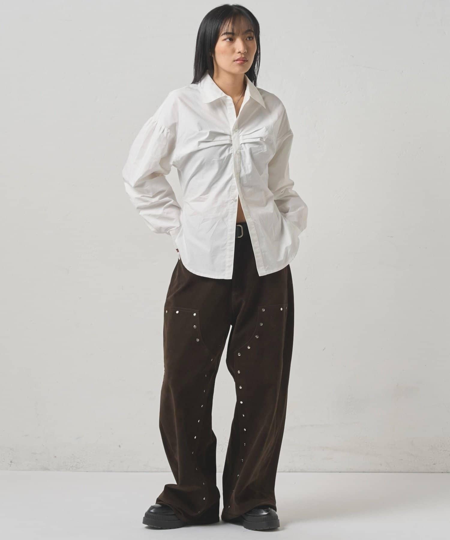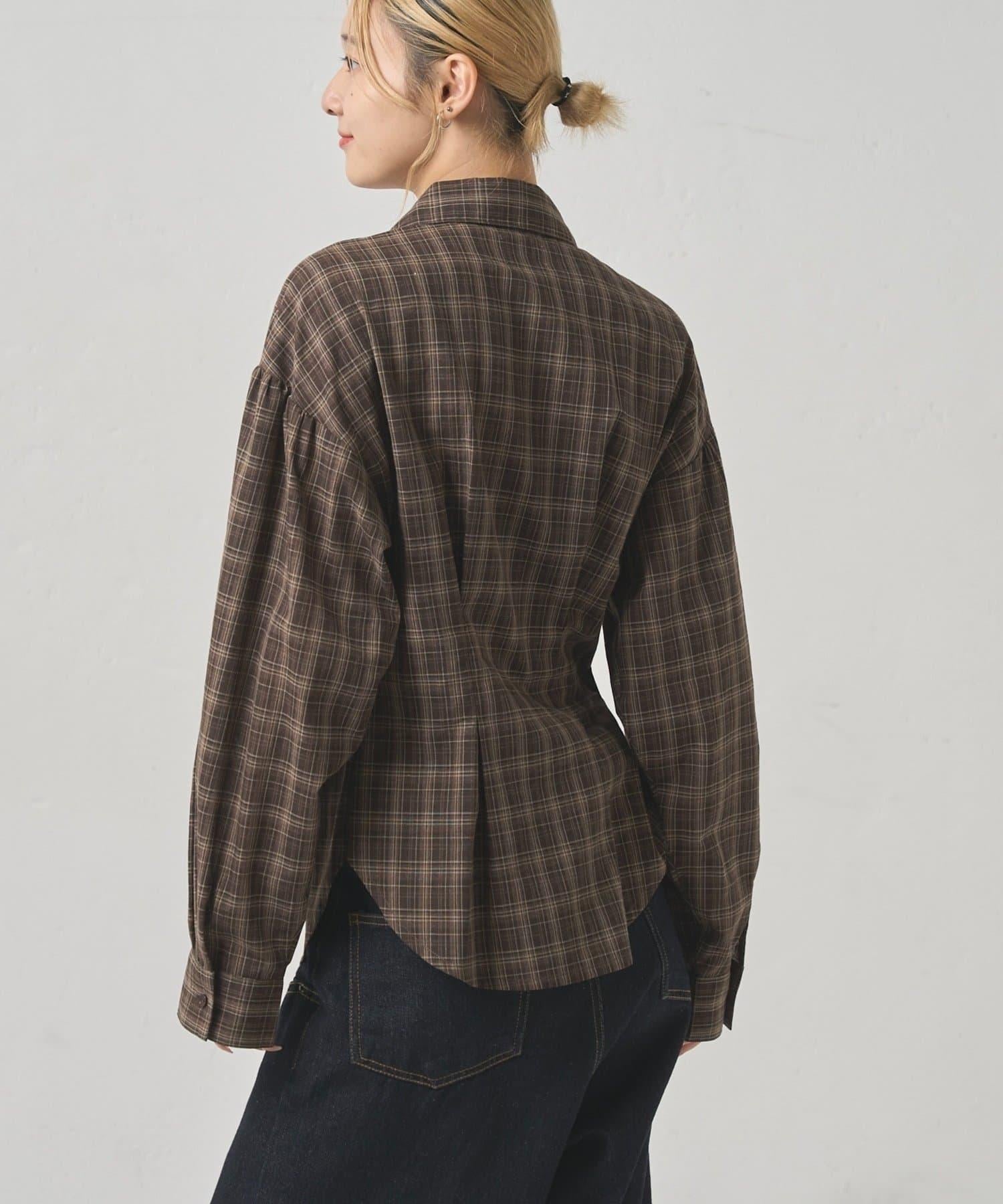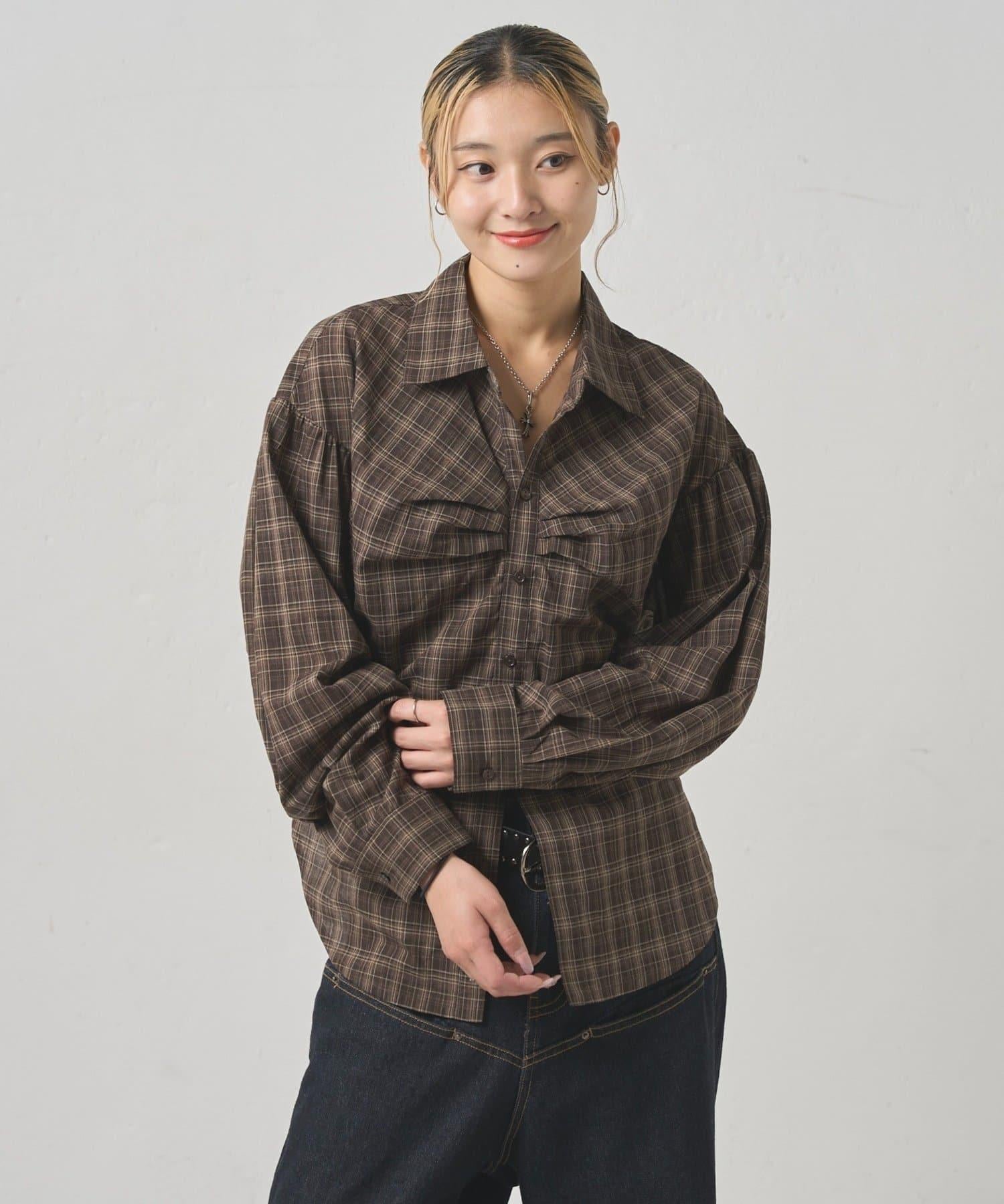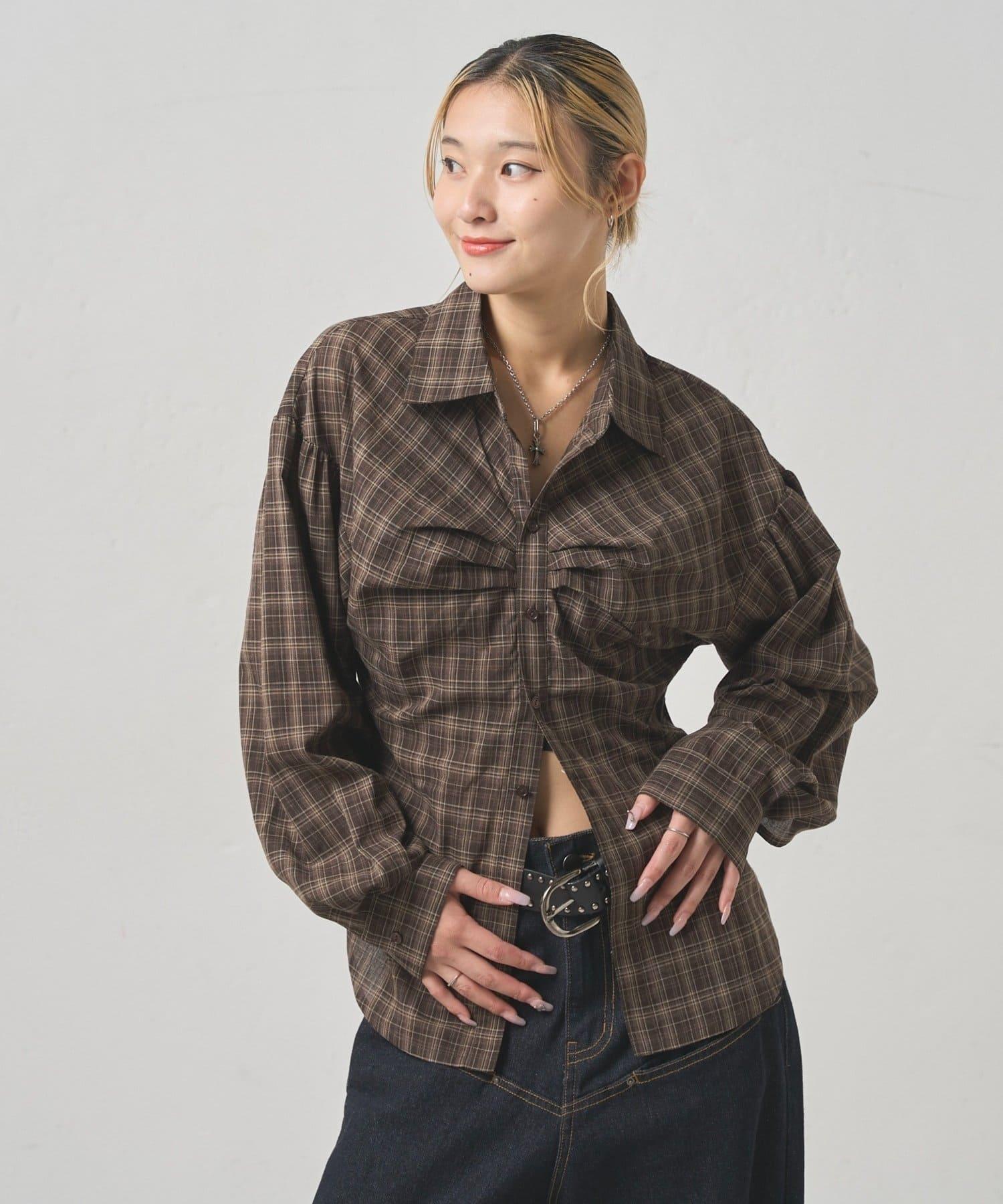 這款襯衫採用了攏起的蓬蓬袖和腰部褶皺設計。