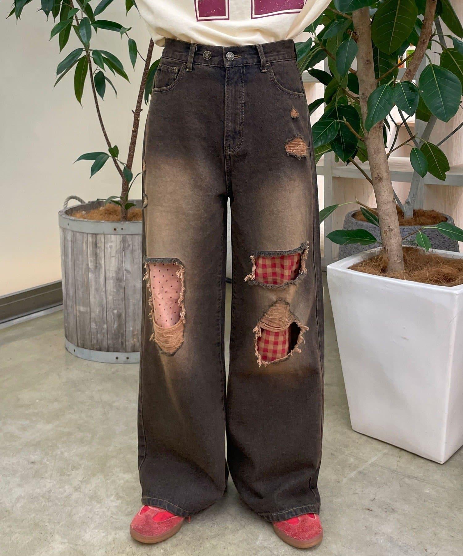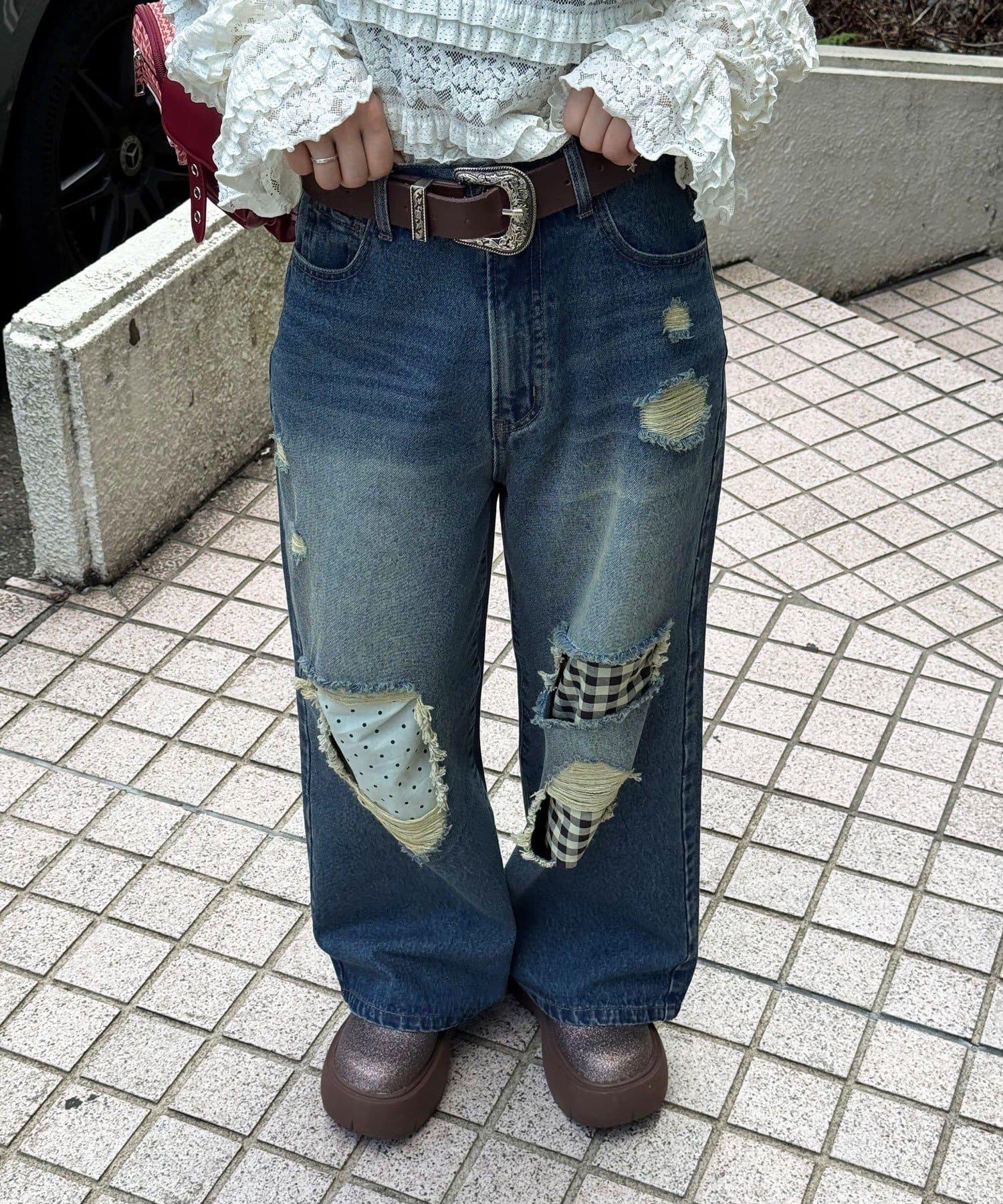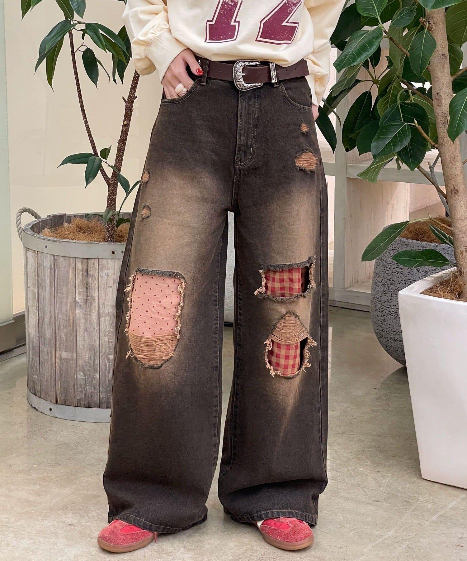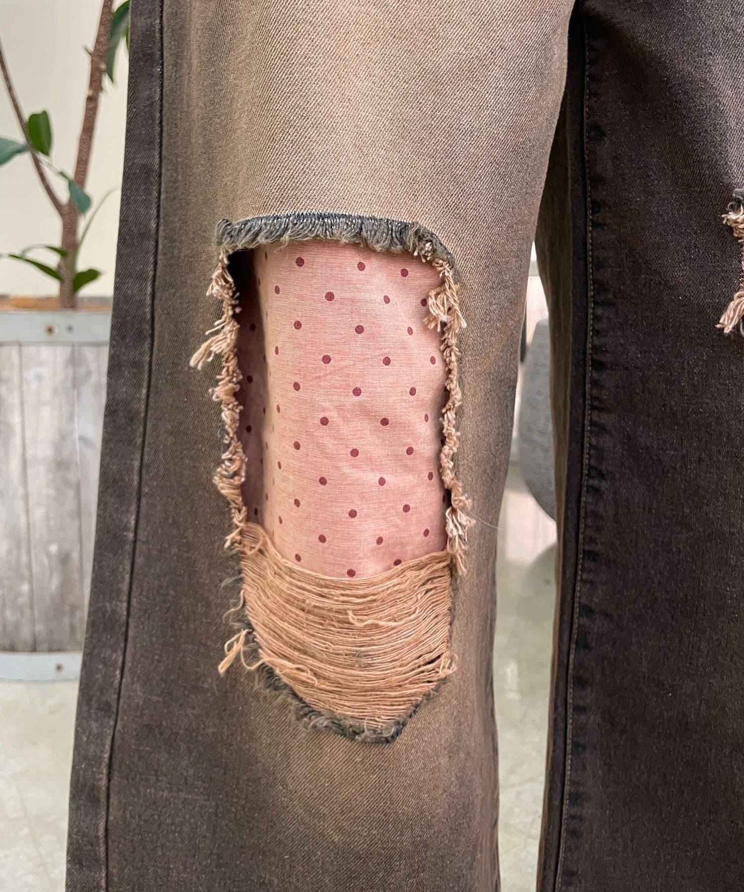 寬幅牛仔布採用大膽、醒目的破損處理。
