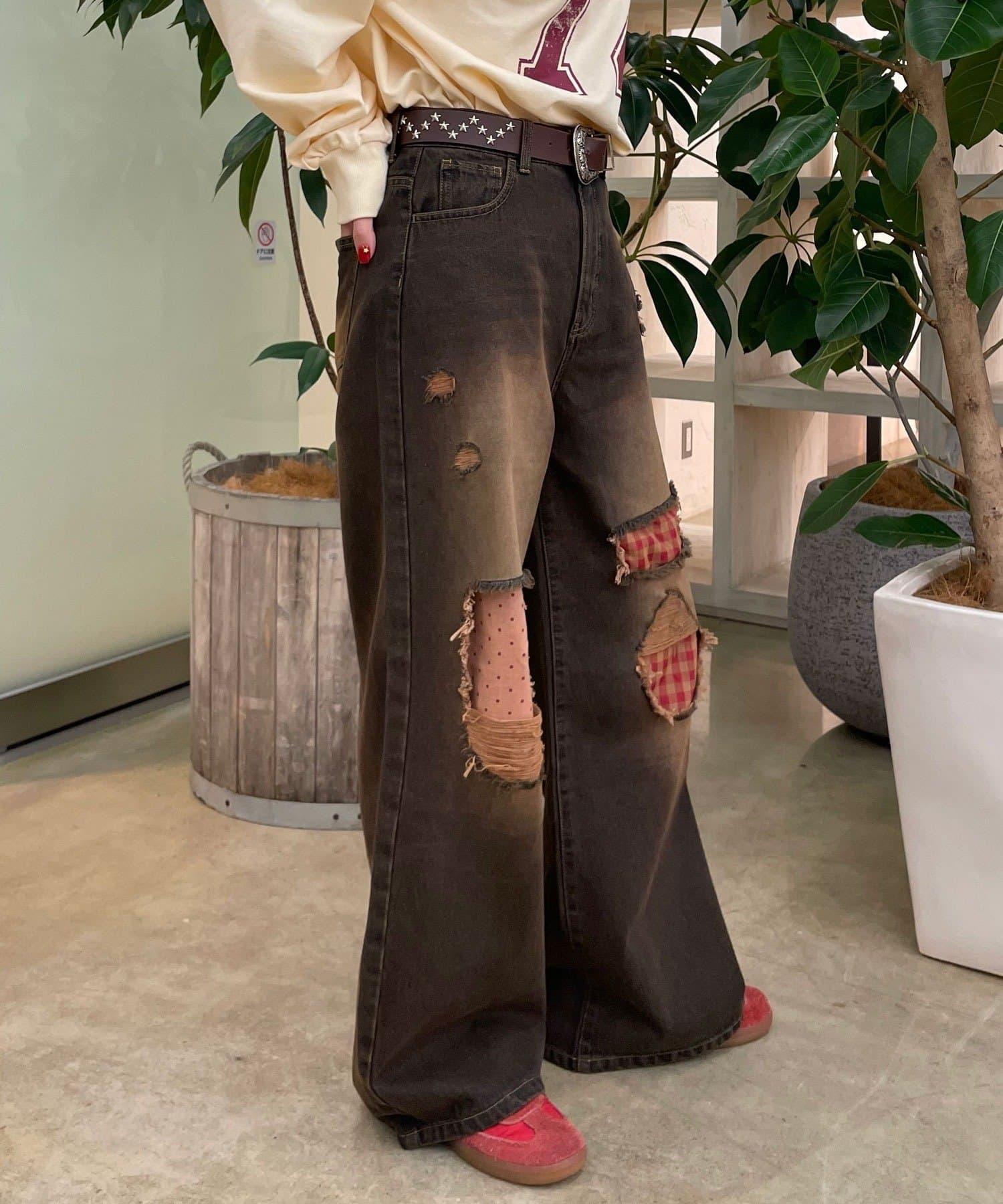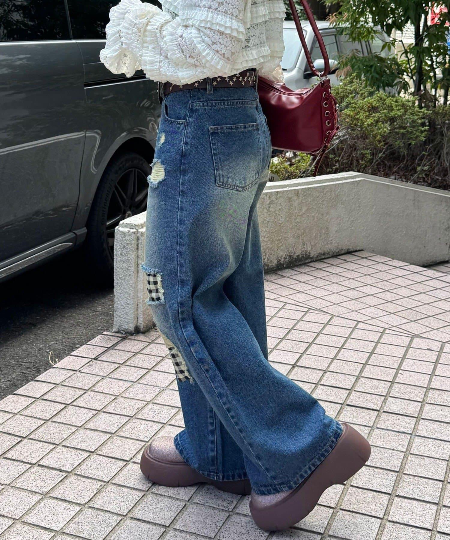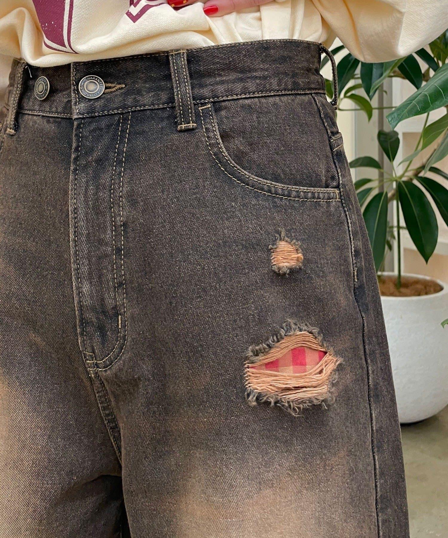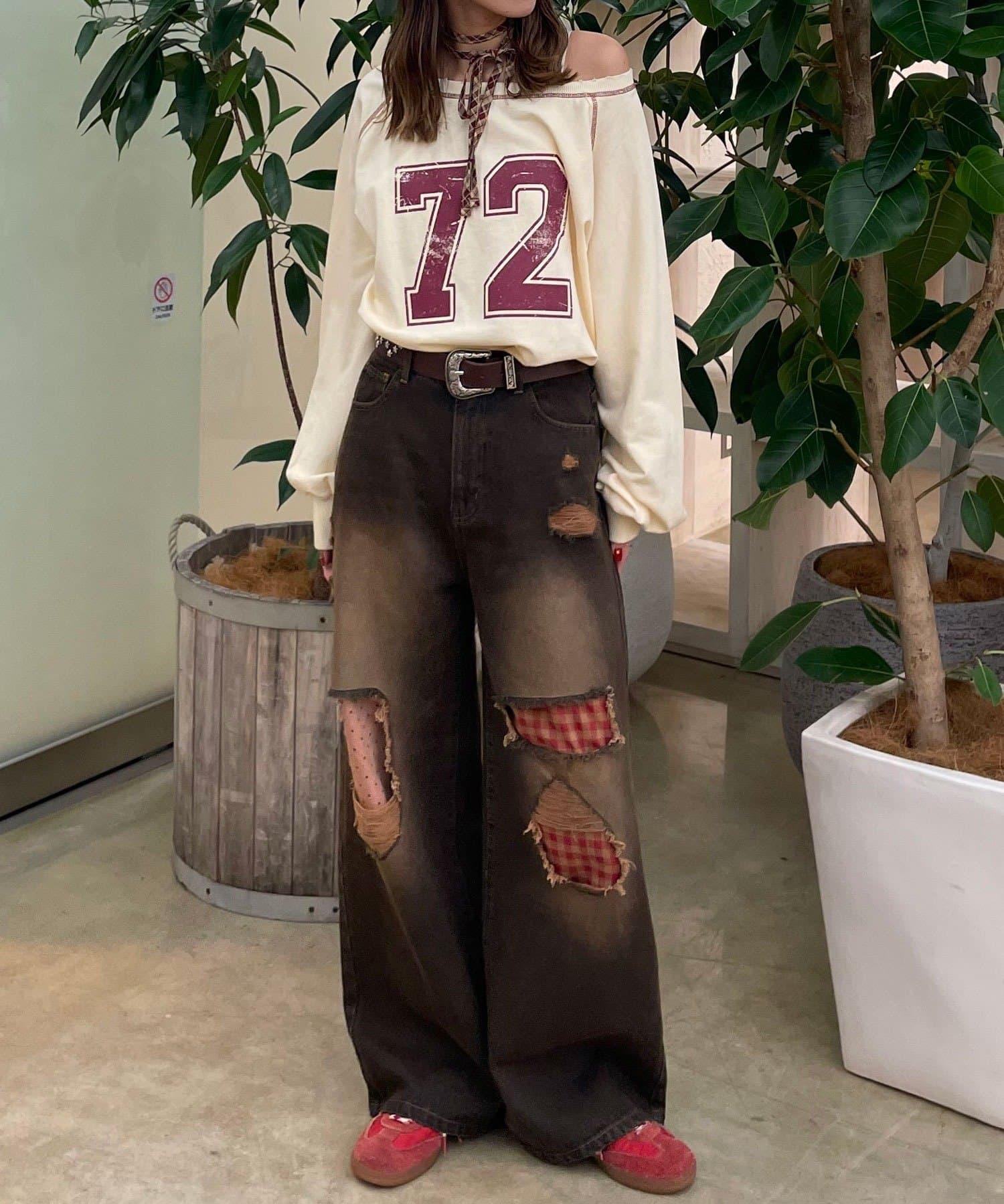 寬幅牛仔布採用大膽、醒目的破損處理。