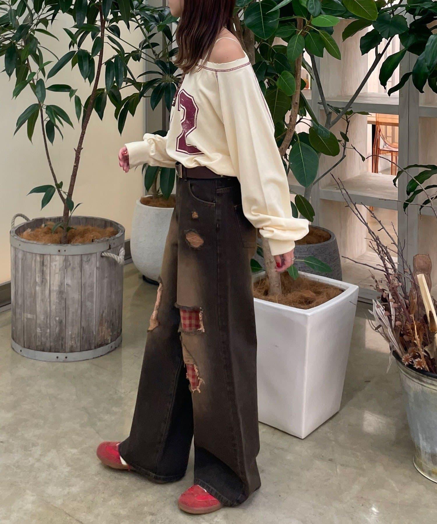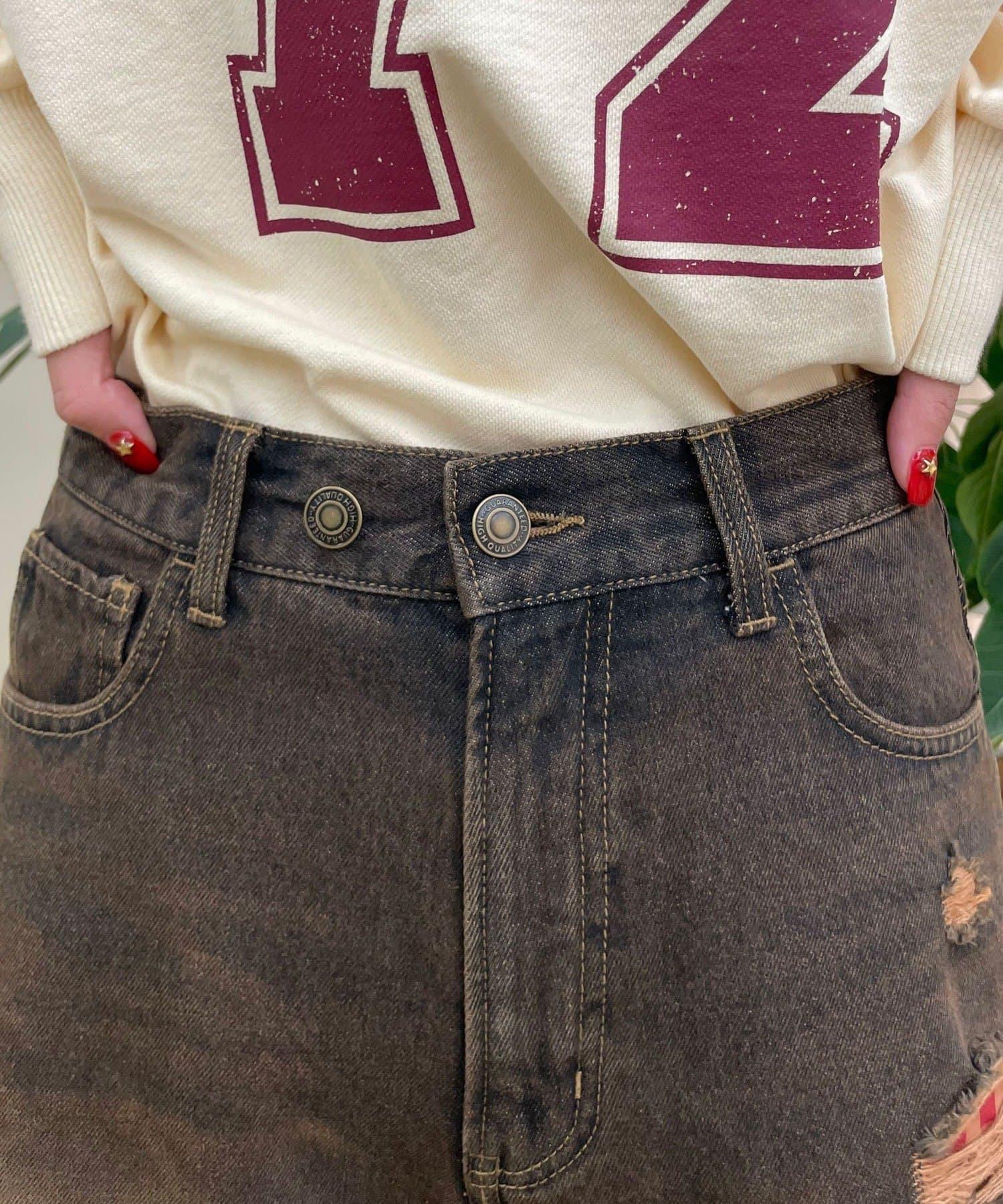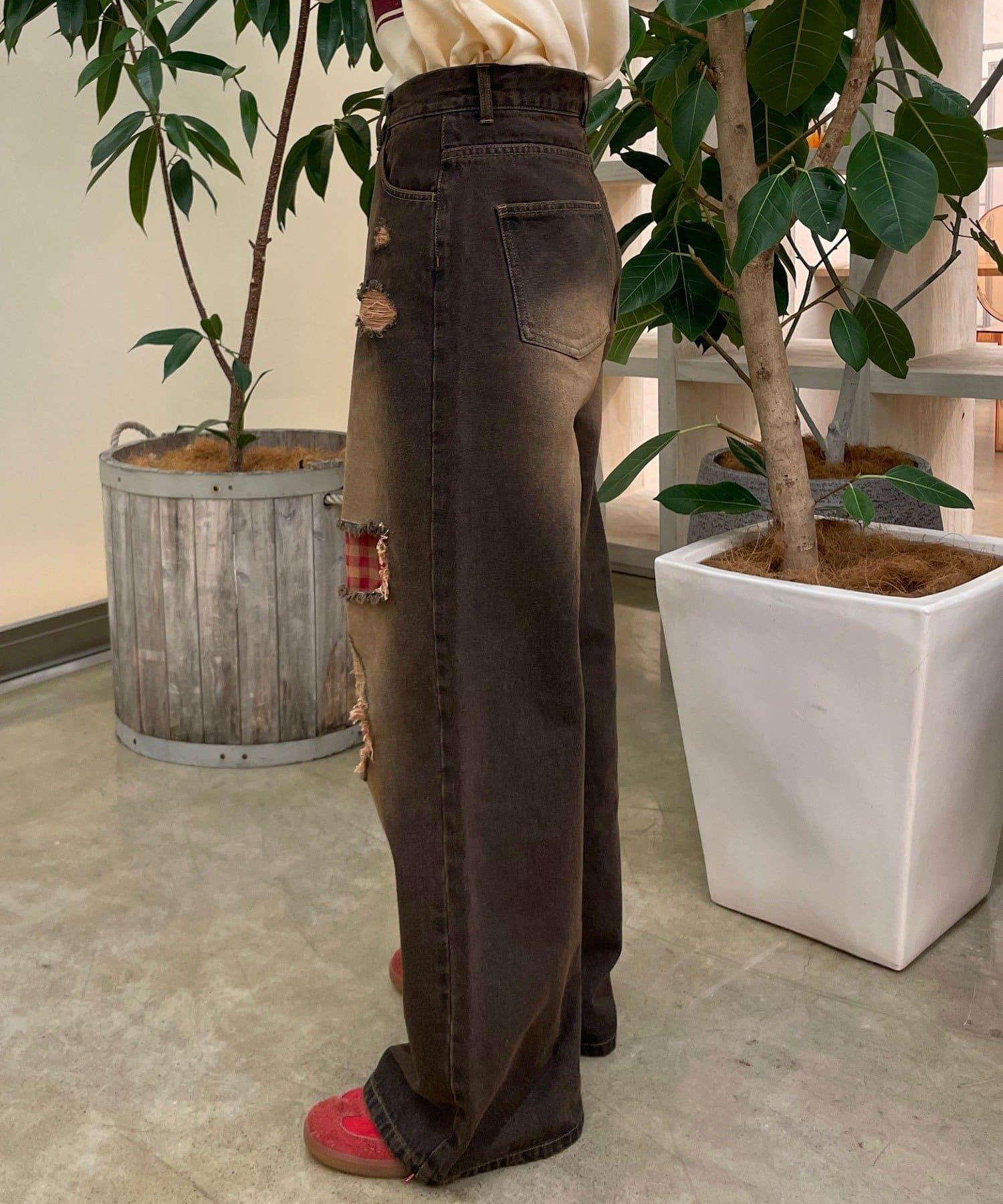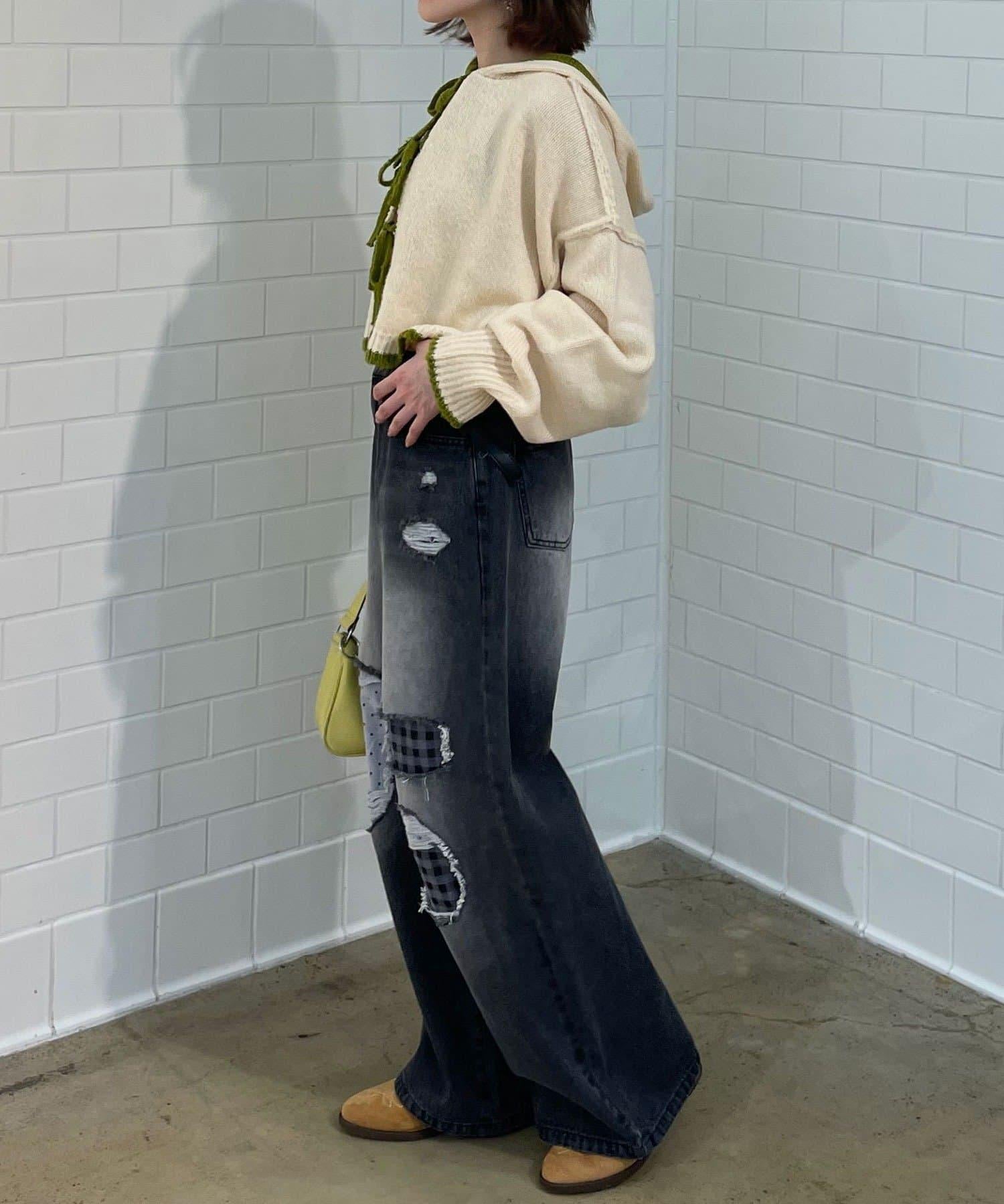寬幅牛仔布採用大膽、醒目的破損處理。
