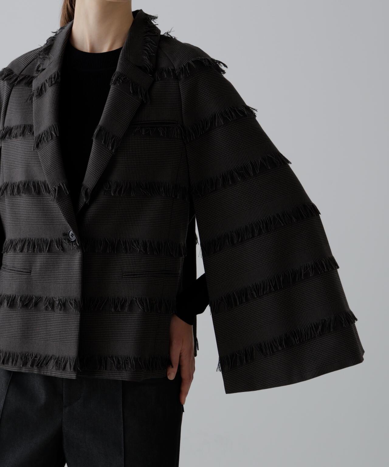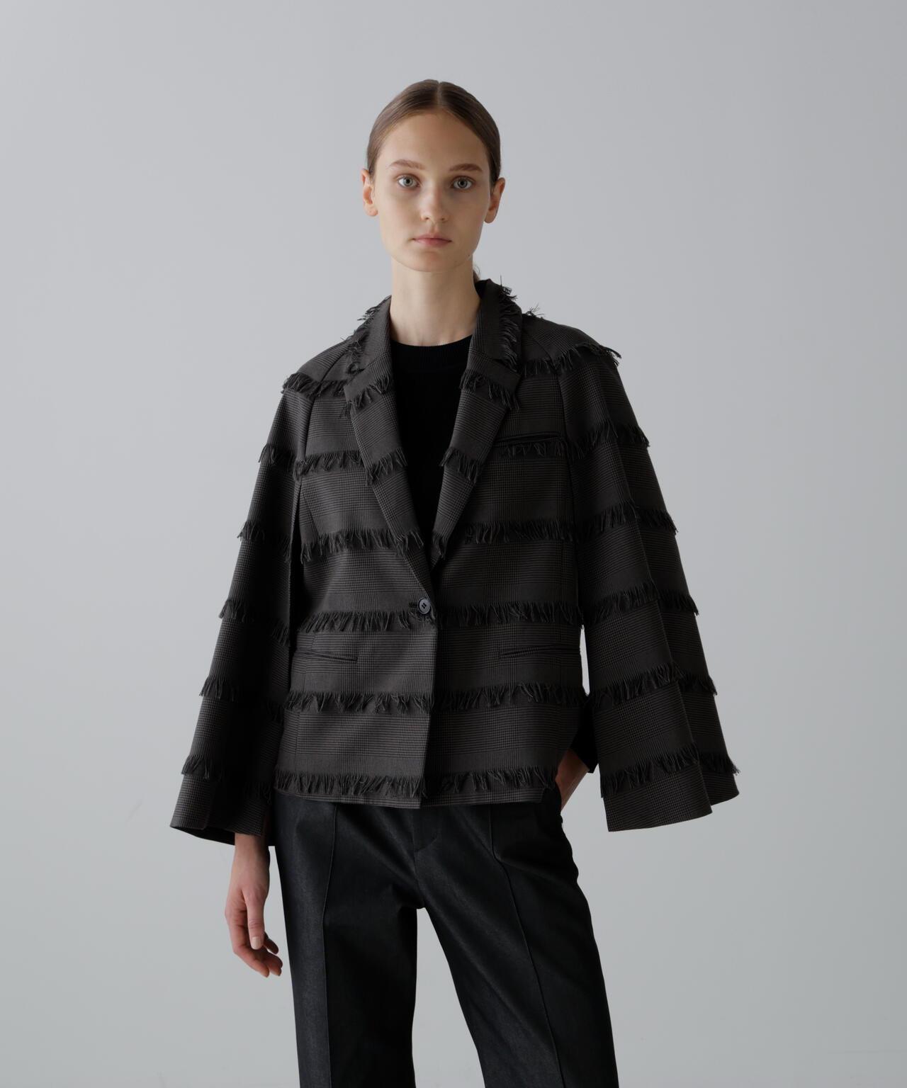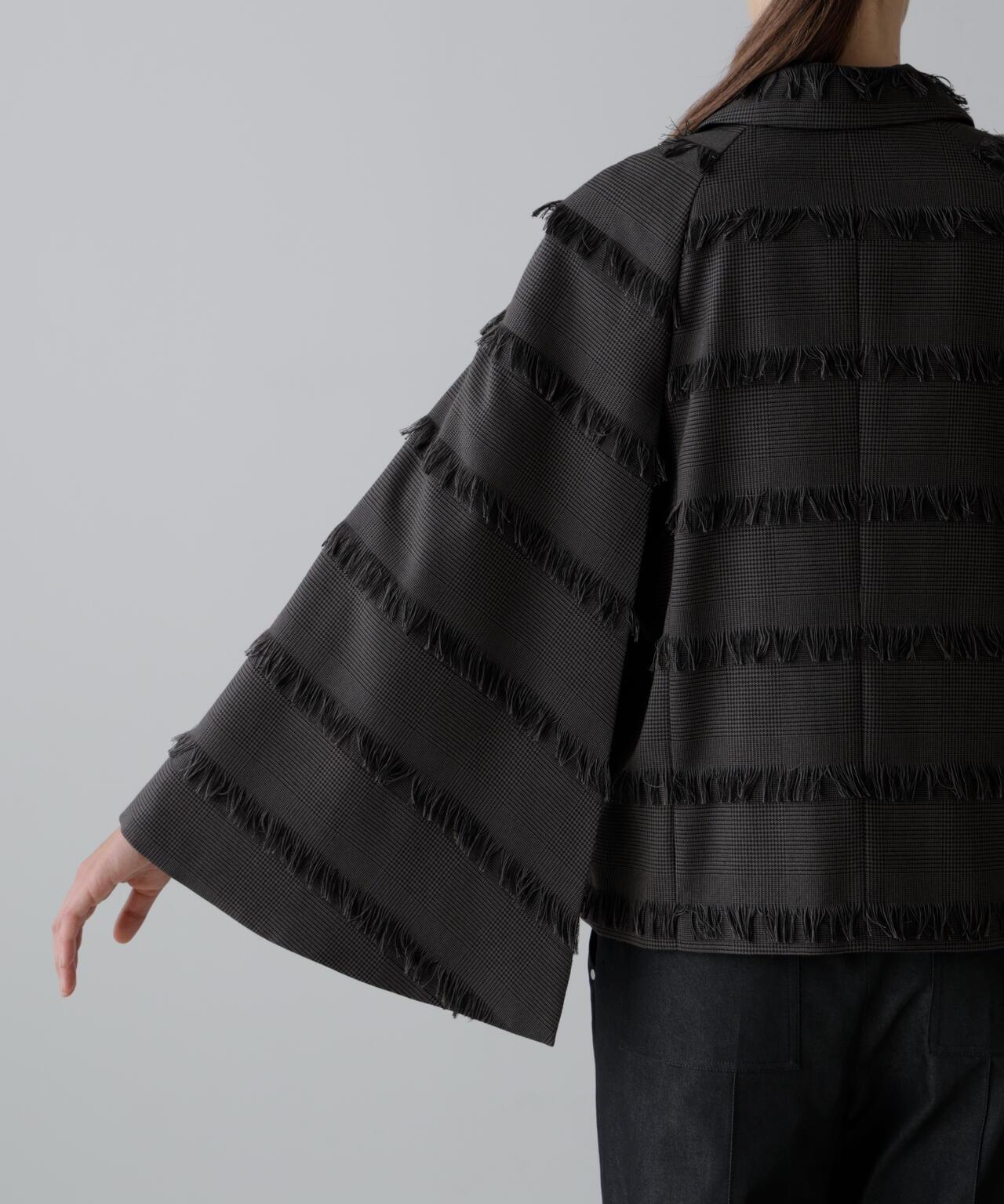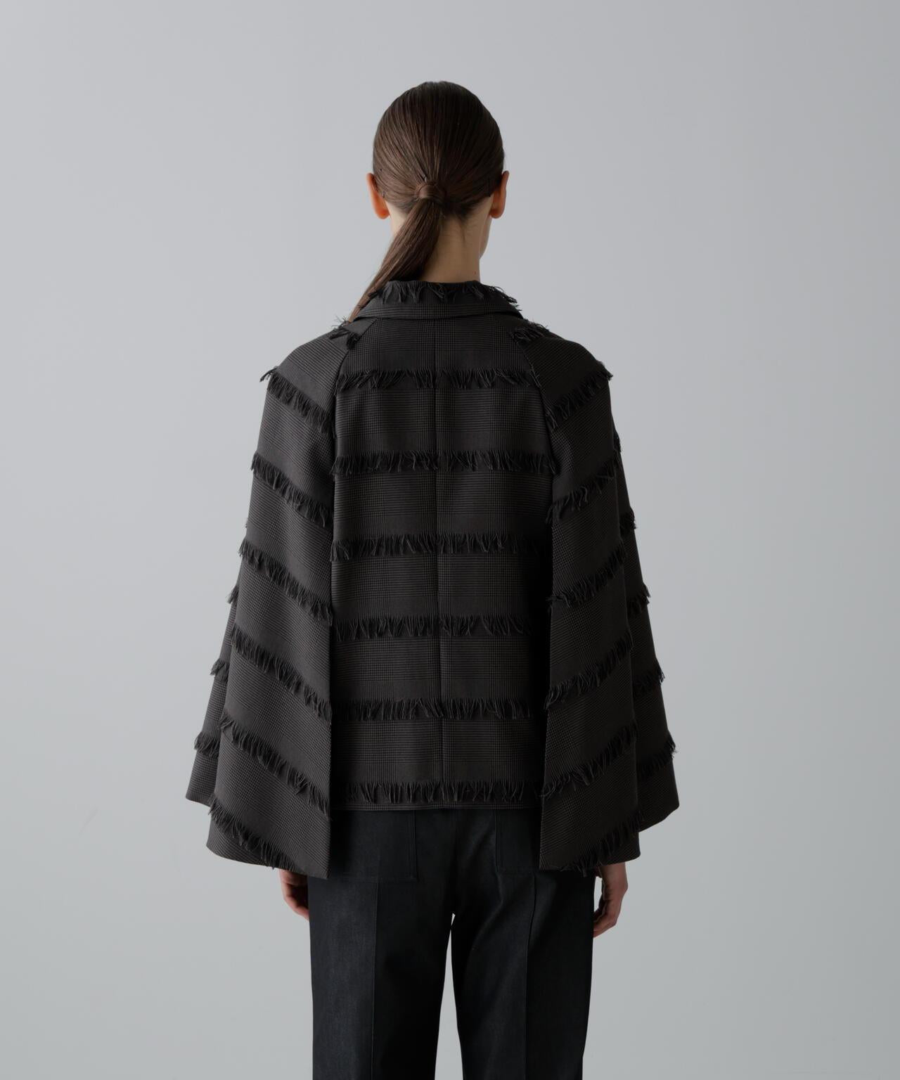 流蘇格紋夾克,採用特殊提花面料裁製這款夾克採用日本精心編織的流蘇面料製成。底色是帶有流蘇邊飾的格紋圖案。剪裁得體的衣領和披肩式喇叭袖是這款夾克的一大特色。建議搭配同款裙子(貨號:531-5220907)。採用質地柔軟的滌綸-嫘祖混紡紗製成的特殊提花面料進行剪裁,通過部分剪切經線在面料上形成流蘇,使其浮於邊框形狀。