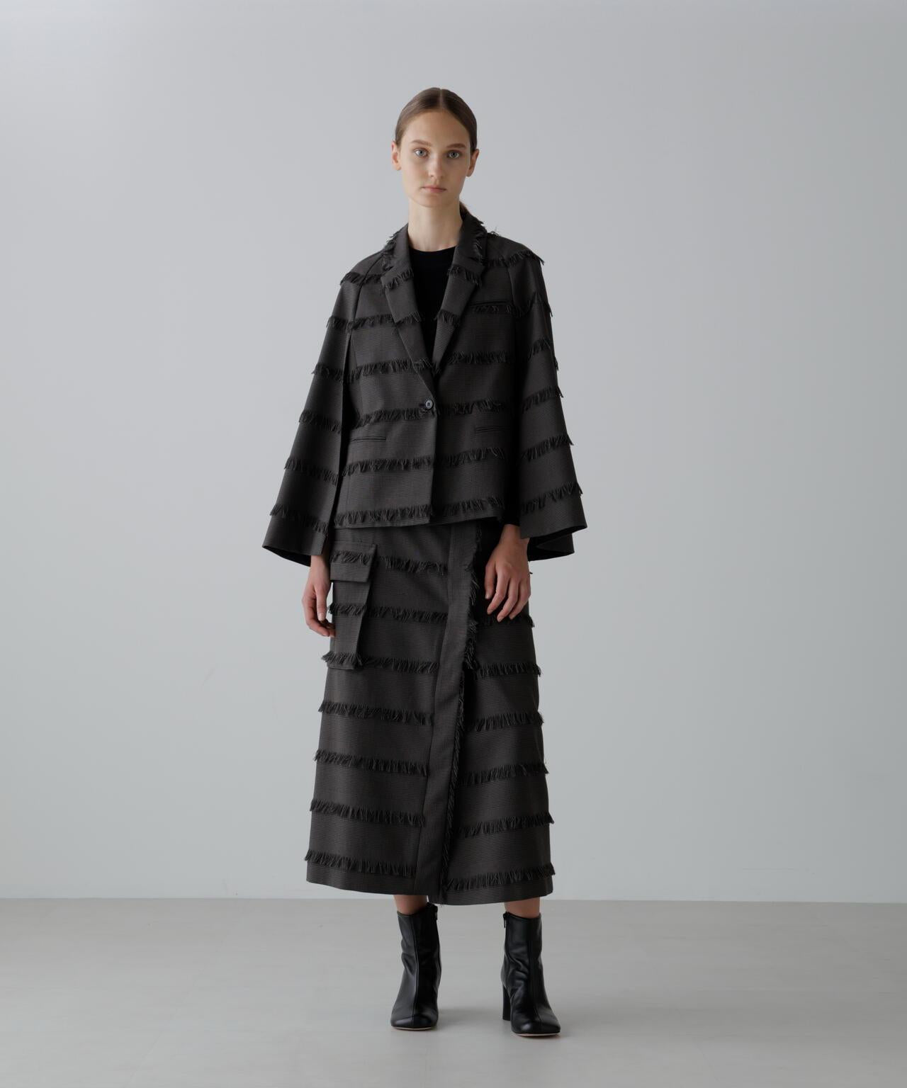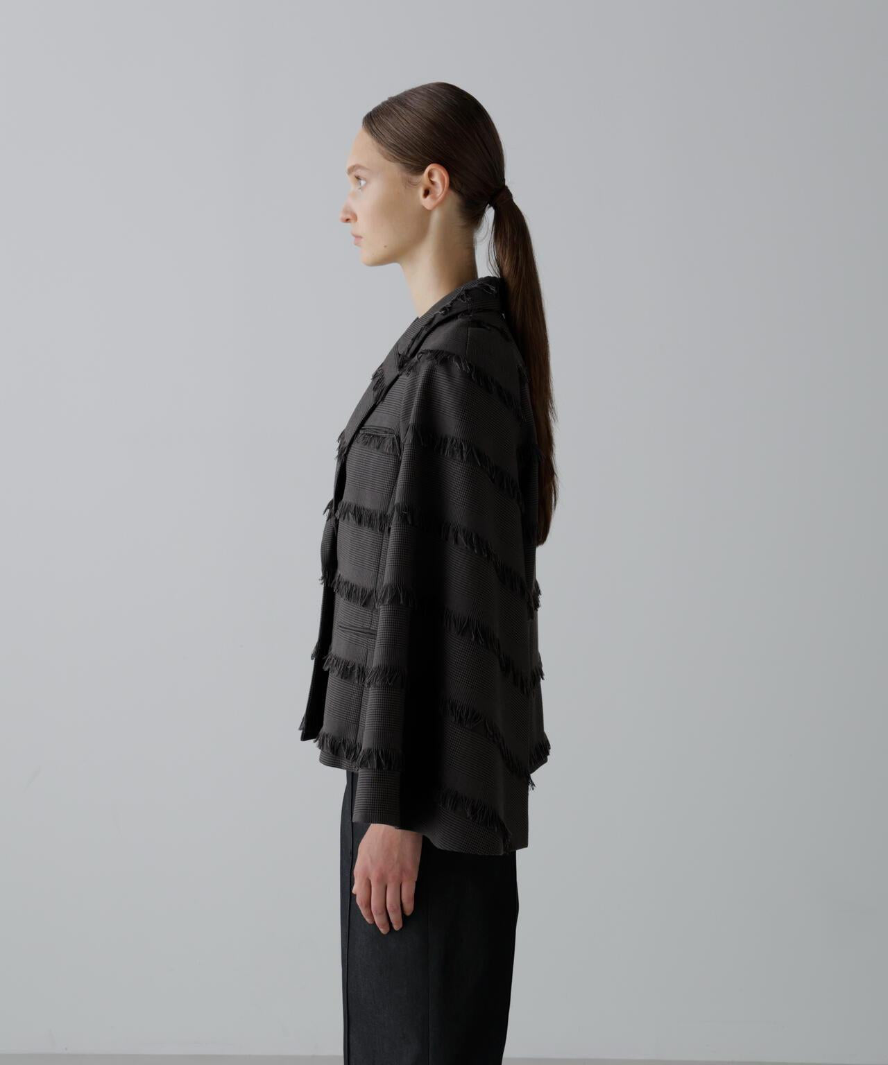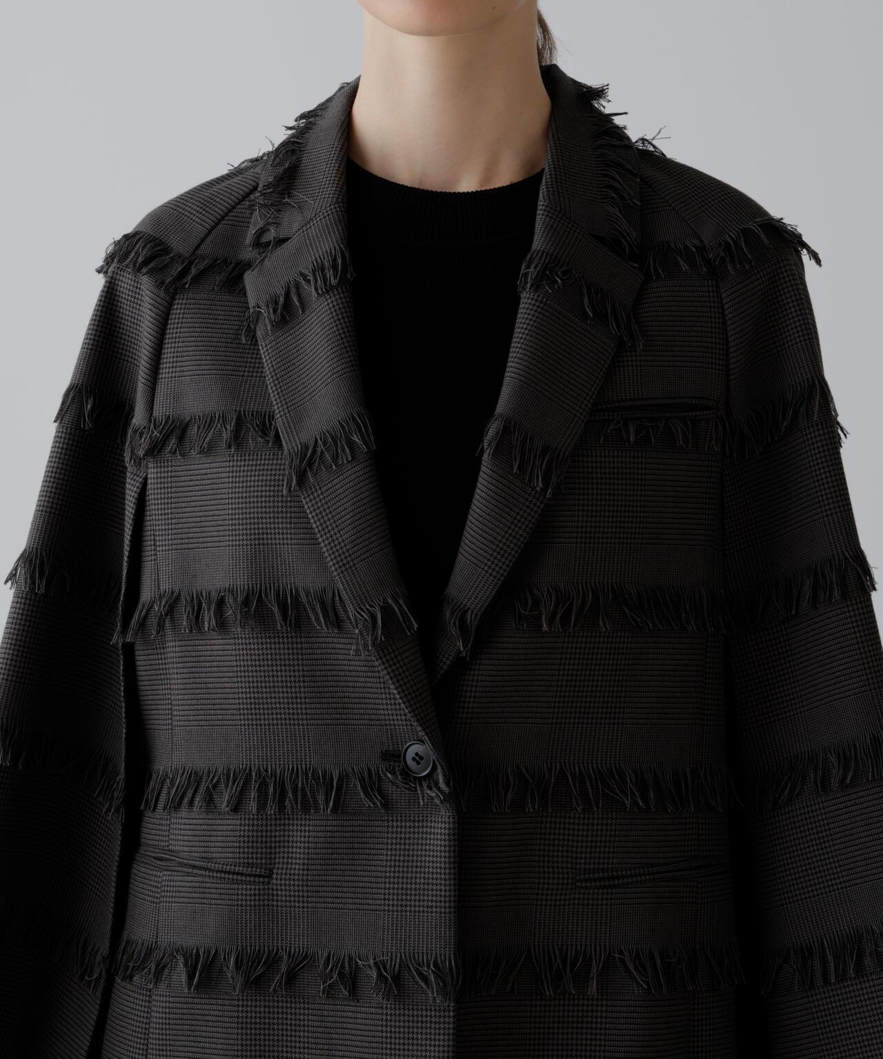 流蘇格紋夾克,採用特殊提花面料裁製這款夾克採用日本精心編織的流蘇面料製成。底色是帶有流蘇邊飾的格紋圖案。剪裁得體的衣領和披肩式喇叭袖是這款夾克的一大特色。建議搭配同款裙子(貨號:531-5220907)。採用質地柔軟的滌綸-嫘祖混紡紗製成的特殊提花面料進行剪裁,通過部分剪切經線在面料上形成流蘇,使其浮於邊框形狀。