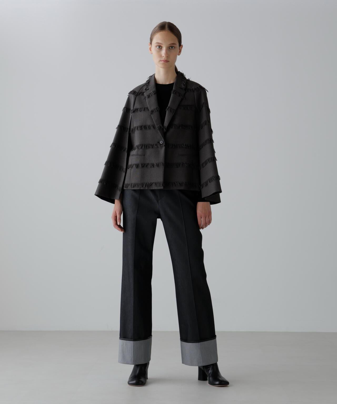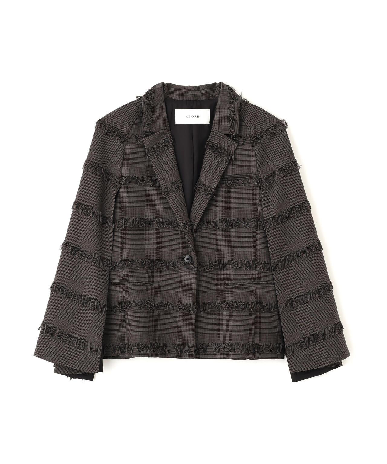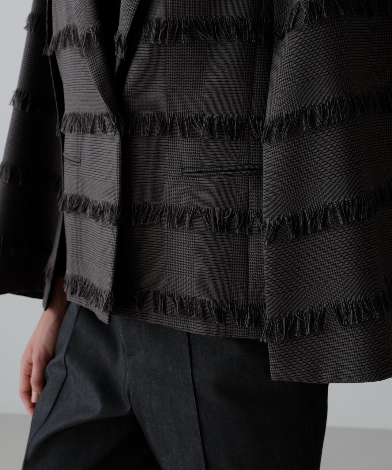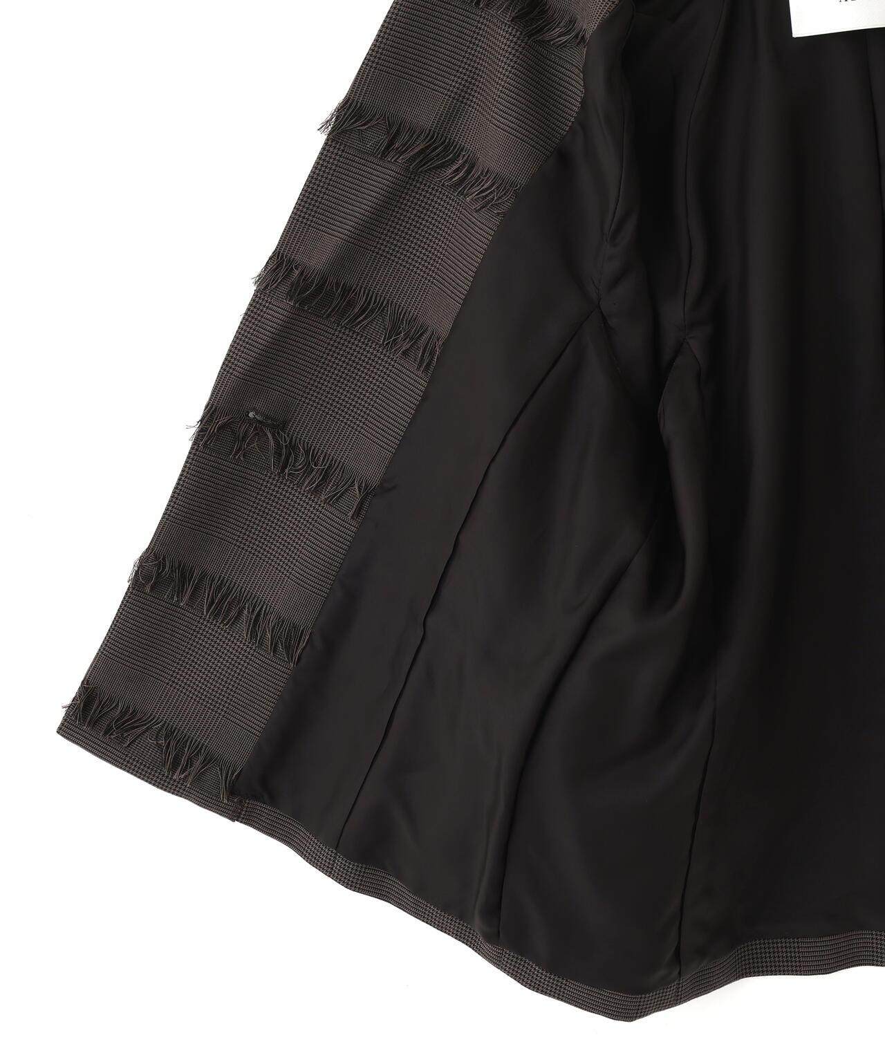流蘇格紋夾克,採用特殊提花面料裁製這款夾克採用日本精心編織的流蘇面料製成。底色是帶有流蘇邊飾的格紋圖案。剪裁得體的衣領和披肩式喇叭袖是這款夾克的一大特色。建議搭配同款裙子(貨號:531-5220907)。採用質地柔軟的滌綸-嫘祖混紡紗製成的特殊提花面料進行剪裁,通過部分剪切經線在面料上形成流蘇,使其浮於邊框形狀。