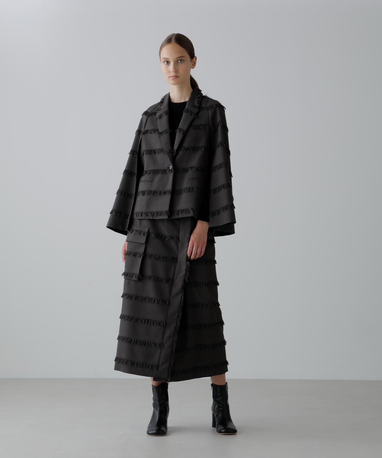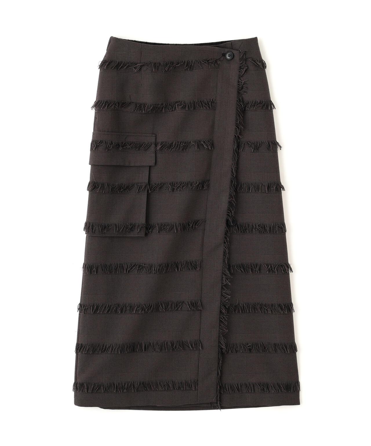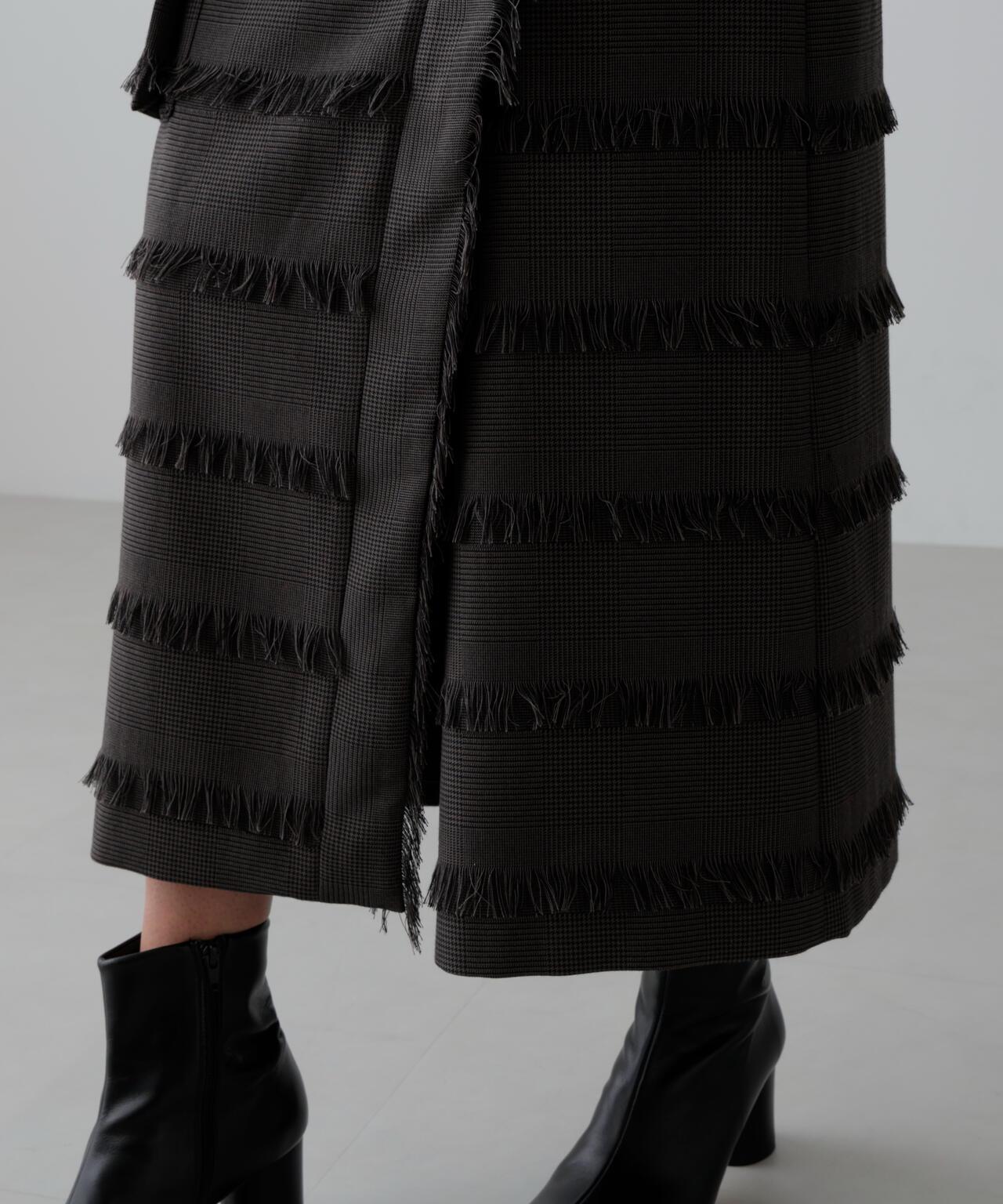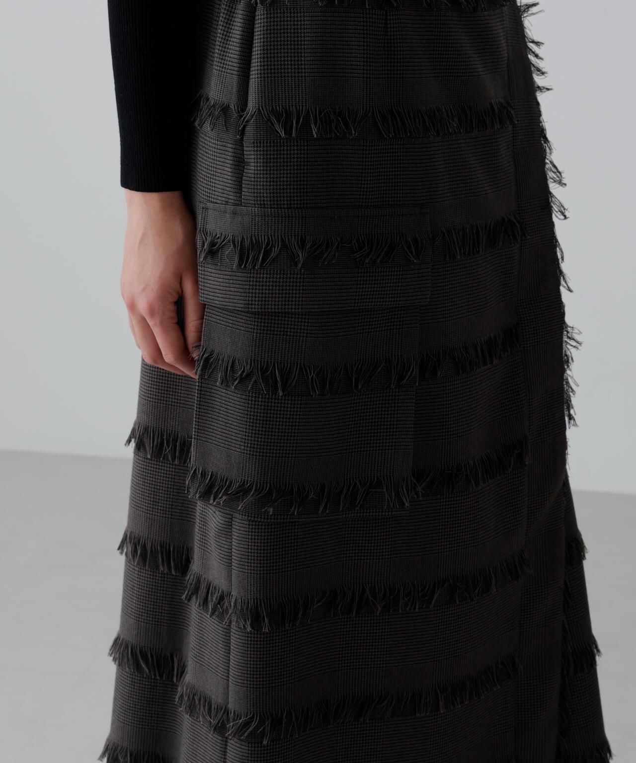 由特殊提花材料製成的流蘇格紋裙這條裙子由日本精心編織的流蘇材料製成。底色為格紋圖案,邊飾為流蘇。裙子的輪廓略呈 A 字形,裙襬捲起,一側有一個大口袋。可搭配同款外套(貨號:531-5250907)或上衣(貨號:531-5210907)。採用質地柔軟的滌綸-嫘祖混紡紗製成,經紗的部分紗線被切割成浮邊形狀,在面料上形成流蘇,並採用特殊的提花面料進行剪裁。