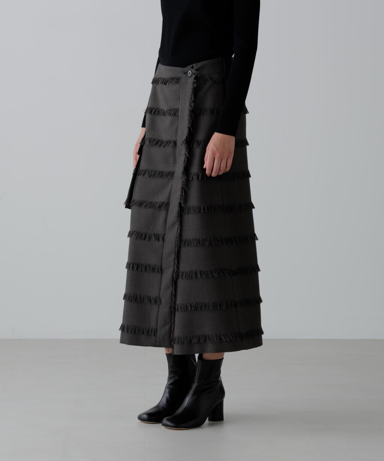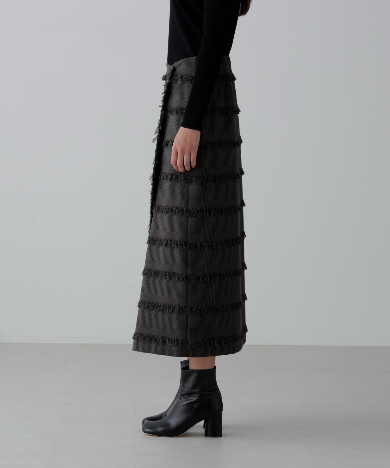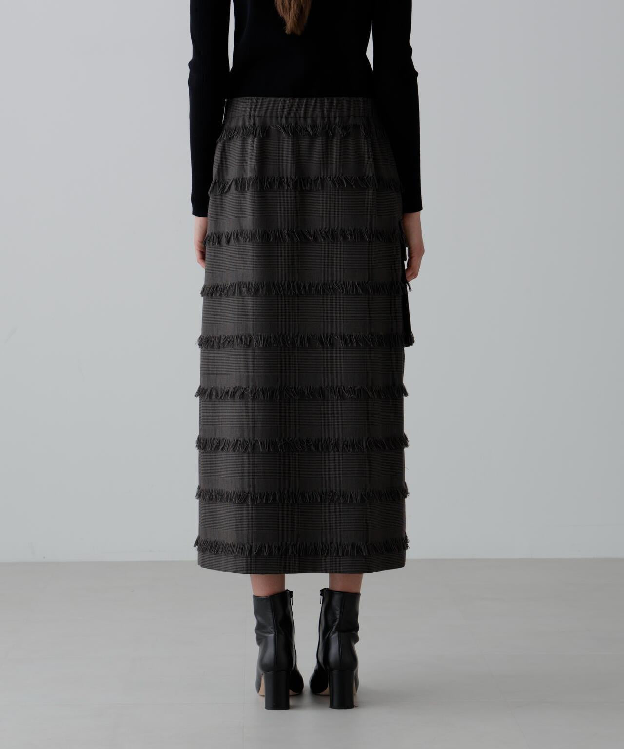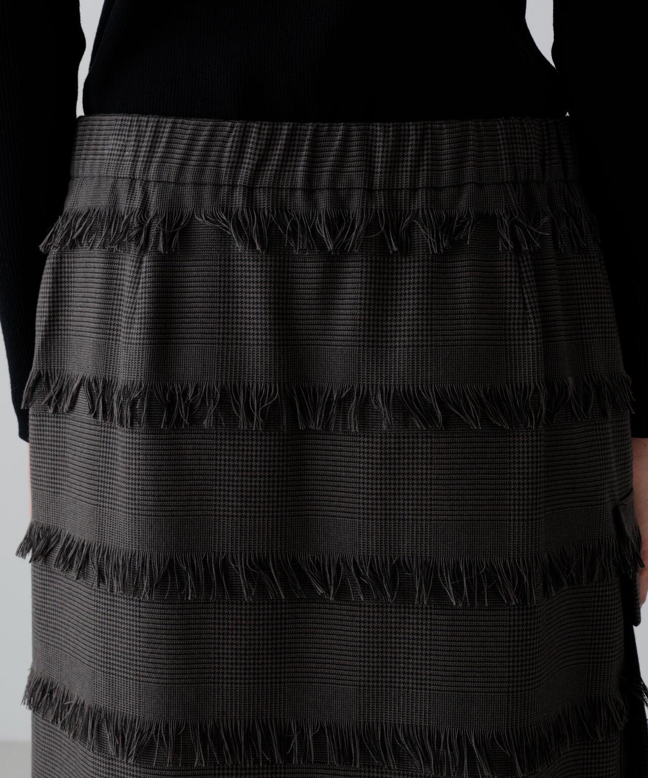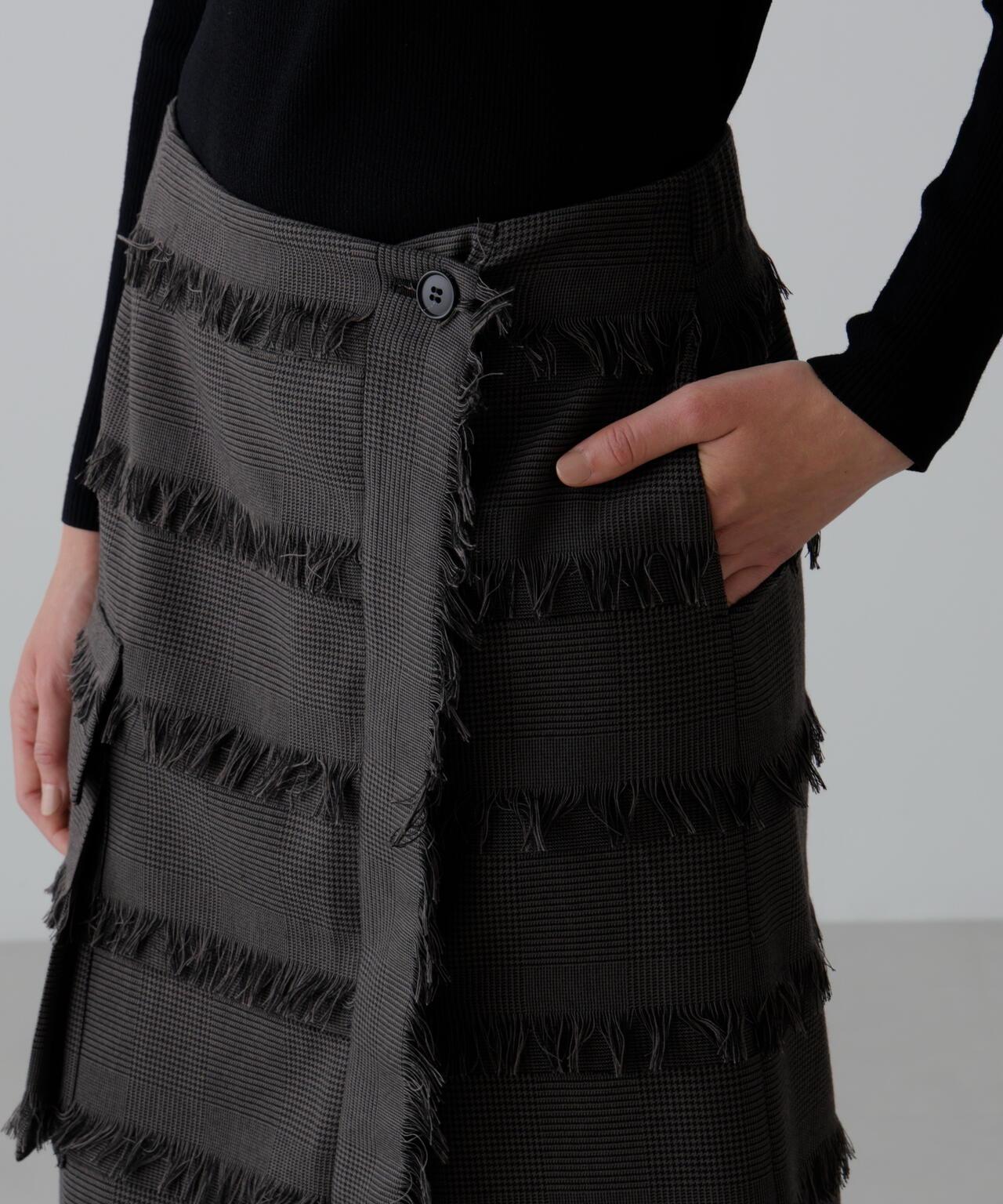 由特殊提花材料製成的流蘇格紋裙這條裙子由日本精心編織的流蘇材料製成。底色為格紋圖案,邊飾為流蘇。裙子的輪廓略呈 A 字形,裙襬捲起,一側有一個大口袋。可搭配同款外套(貨號:531-5250907)或上衣(貨號:531-5210907)。採用質地柔軟的滌綸-嫘祖混紡紗製成,經紗的部分紗線被切割成浮邊形狀,在面料上形成流蘇,並採用特殊的提花面料進行剪裁。