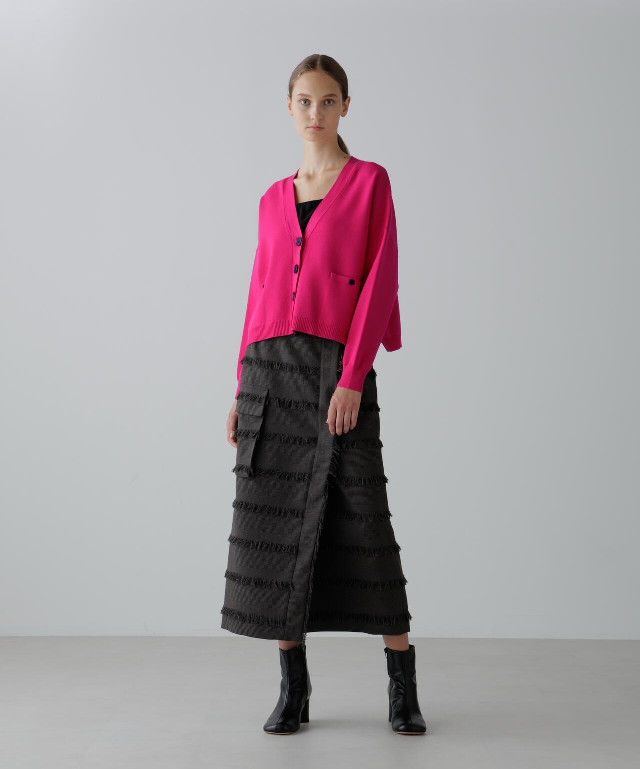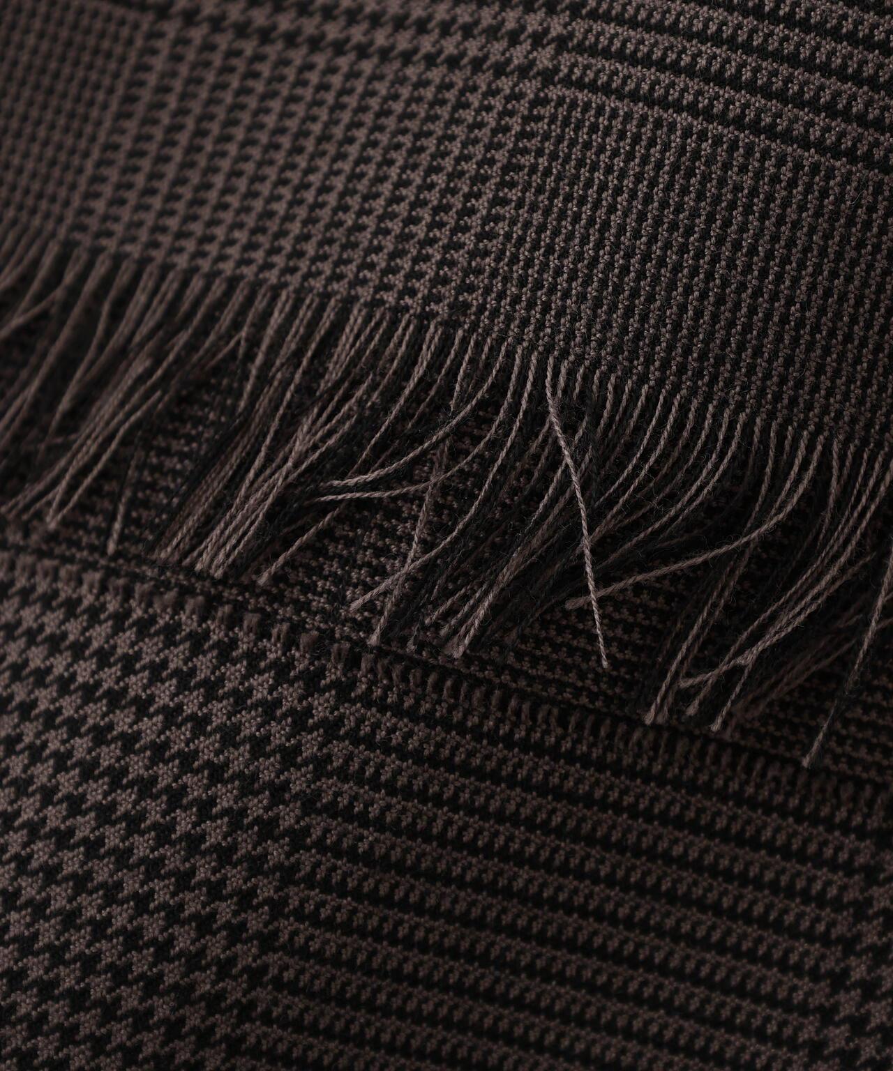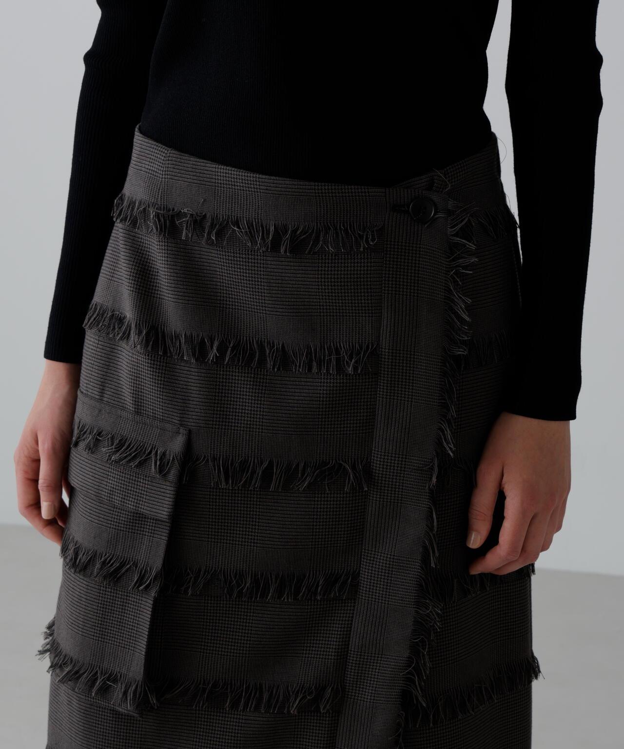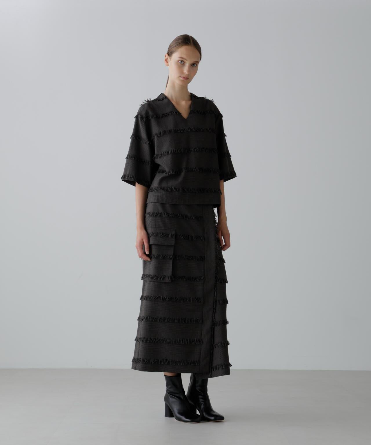 由特殊提花材料製成的流蘇格紋裙這條裙子由日本精心編織的流蘇材料製成。底色為格紋圖案,邊飾為流蘇。裙子的輪廓略呈 A 字形,裙襬捲起,一側有一個大口袋。可搭配同款外套(貨號:531-5250907)或上衣(貨號:531-5210907)。採用質地柔軟的滌綸-嫘祖混紡紗製成,經紗的部分紗線被切割成浮邊形狀,在面料上形成流蘇,並採用特殊的提花面料進行剪裁。