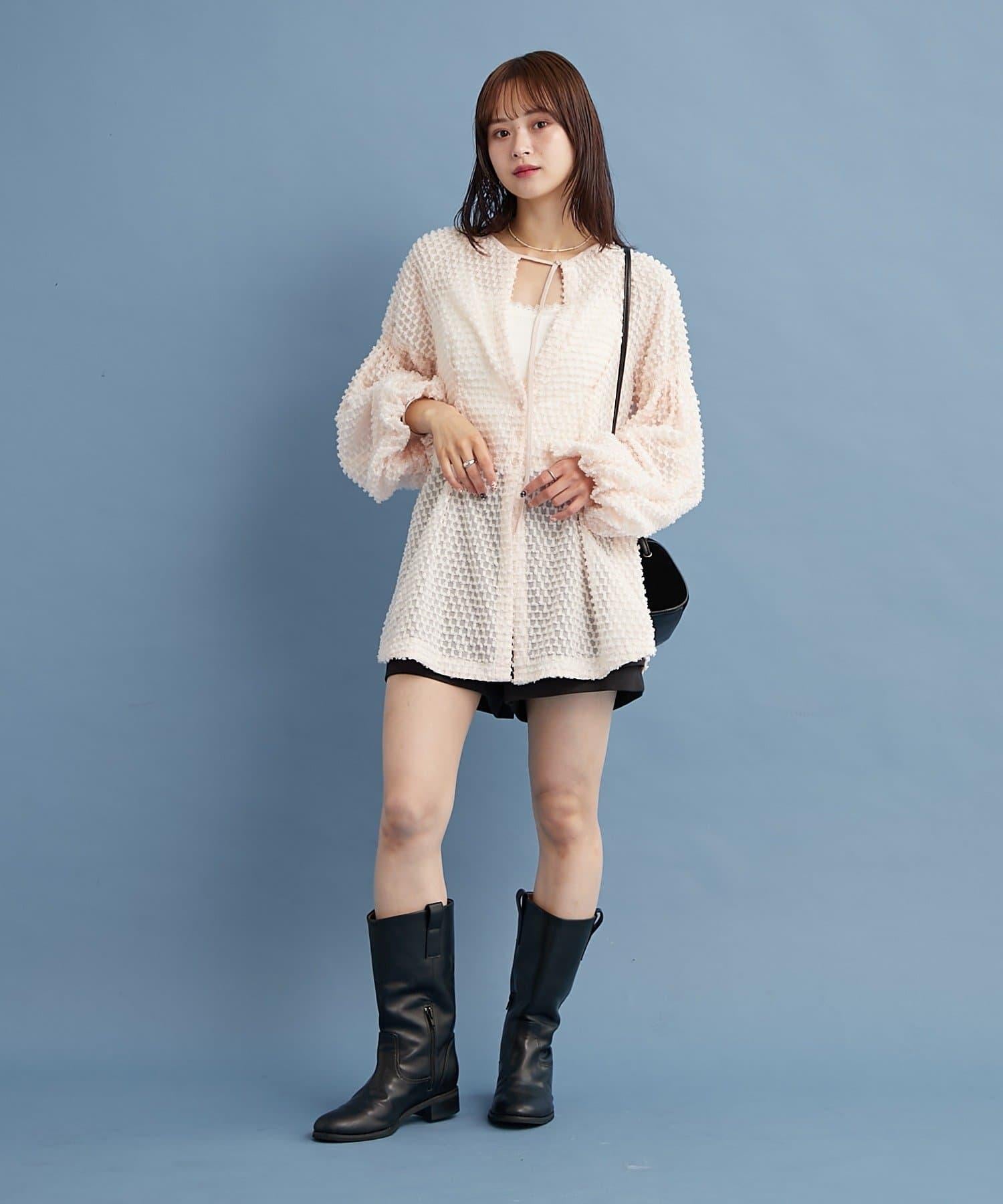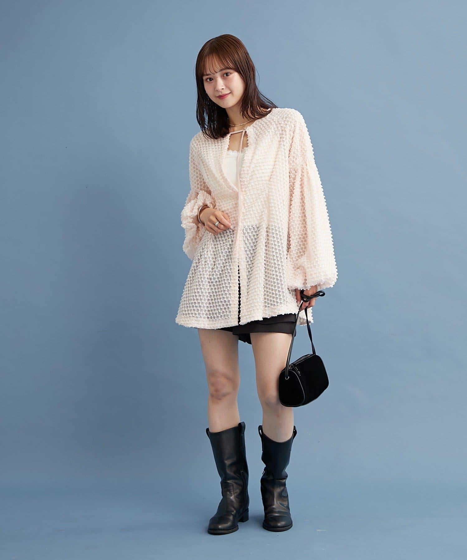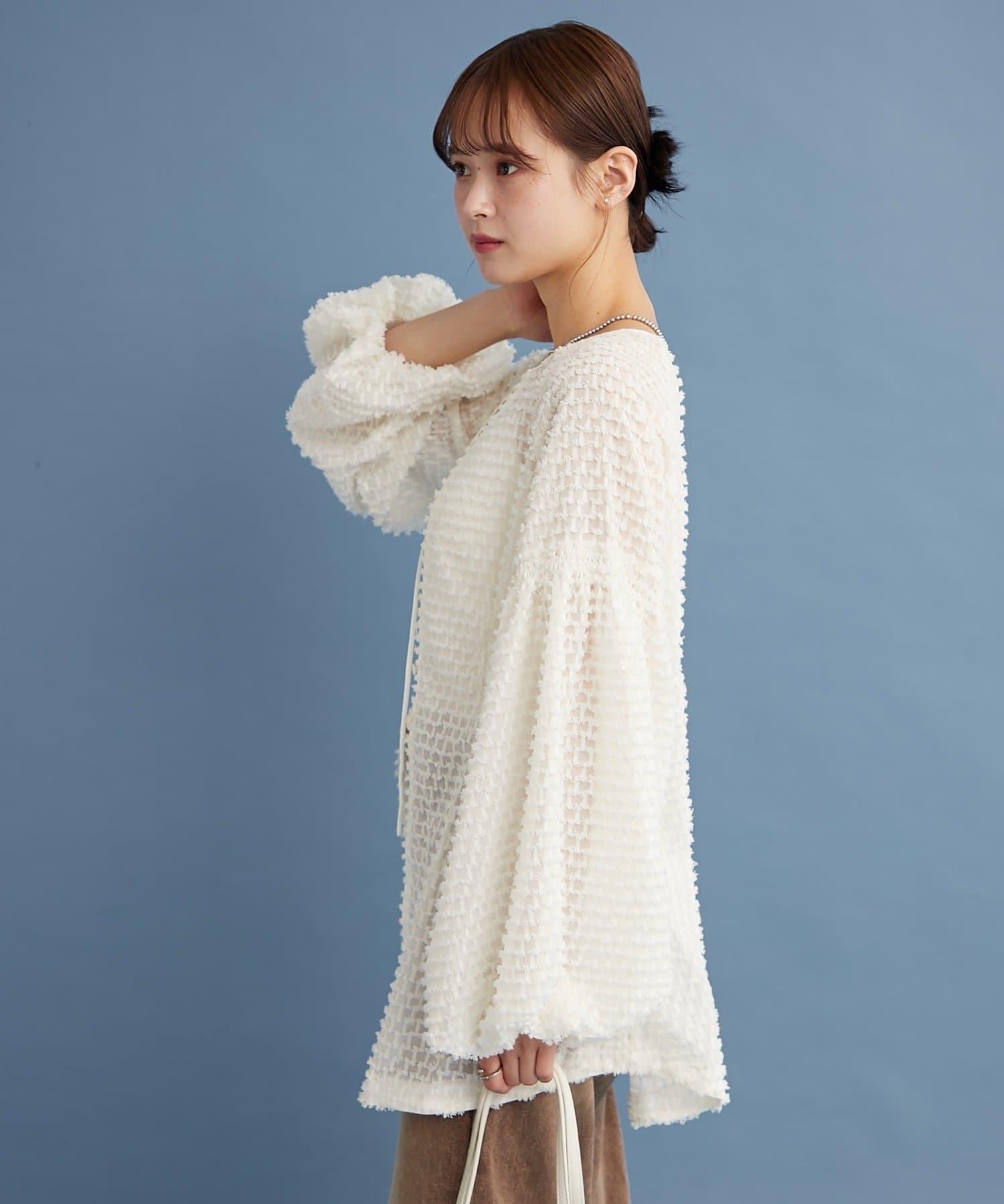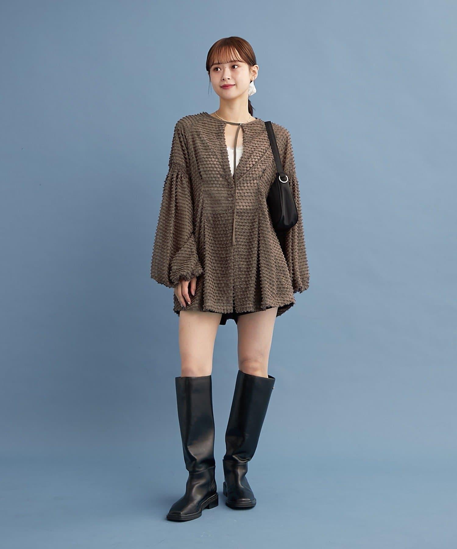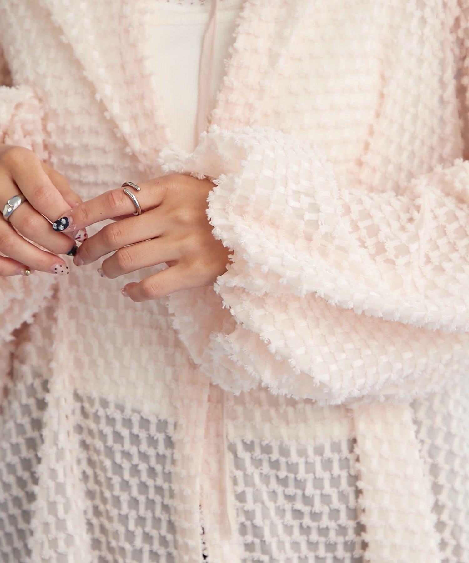 具有表面感的流蘇和蓬鬆的袖子給人柔美的女性印象。