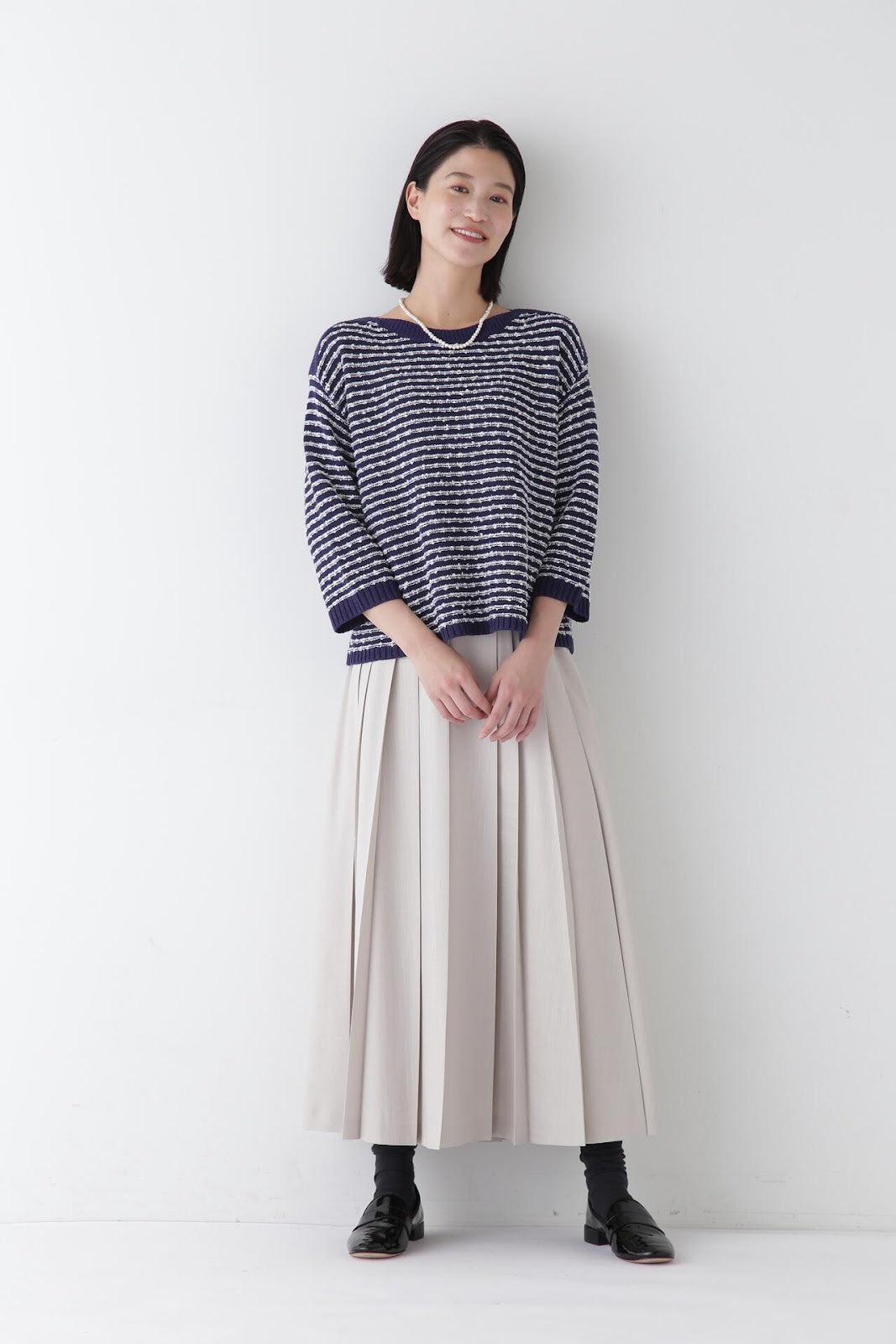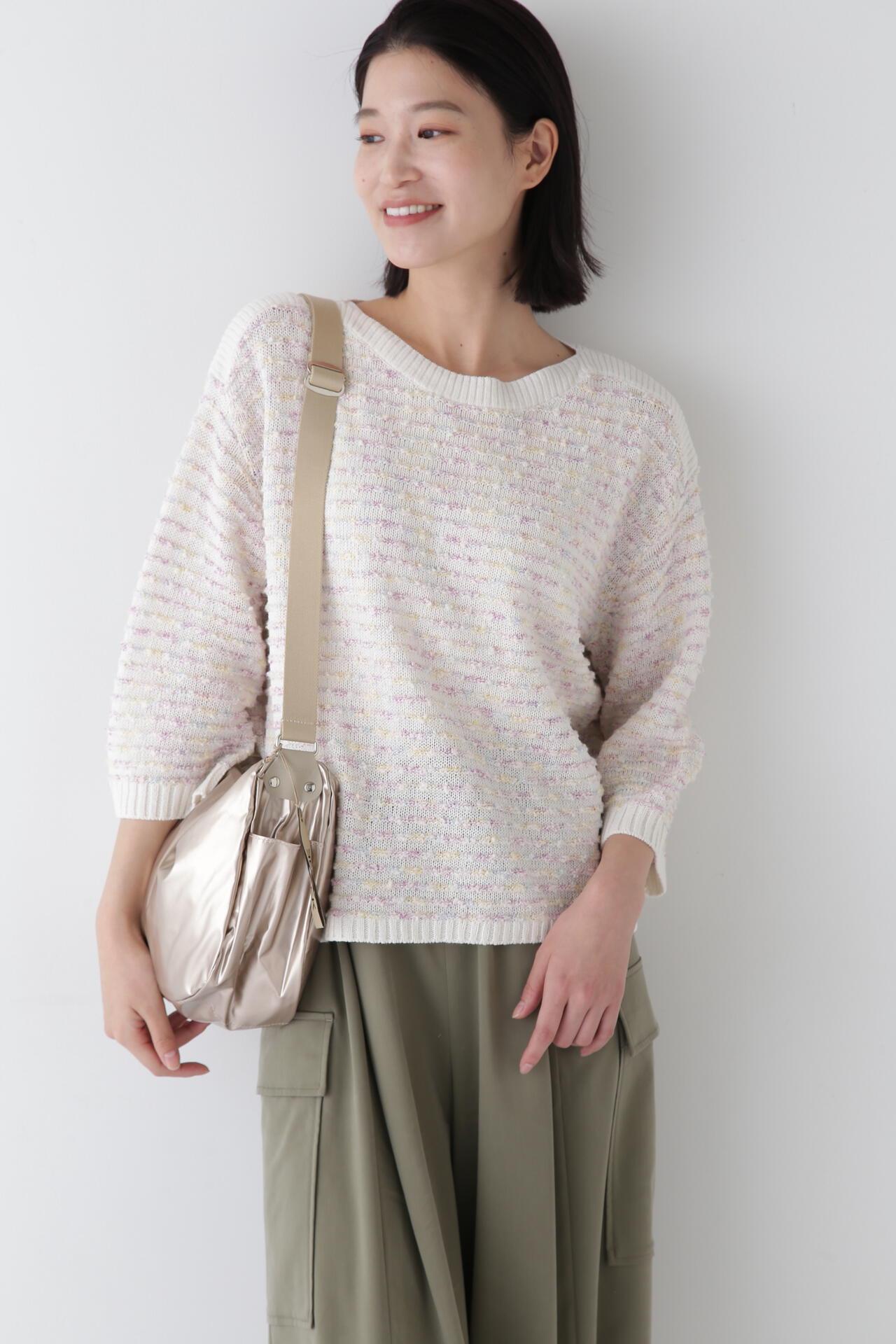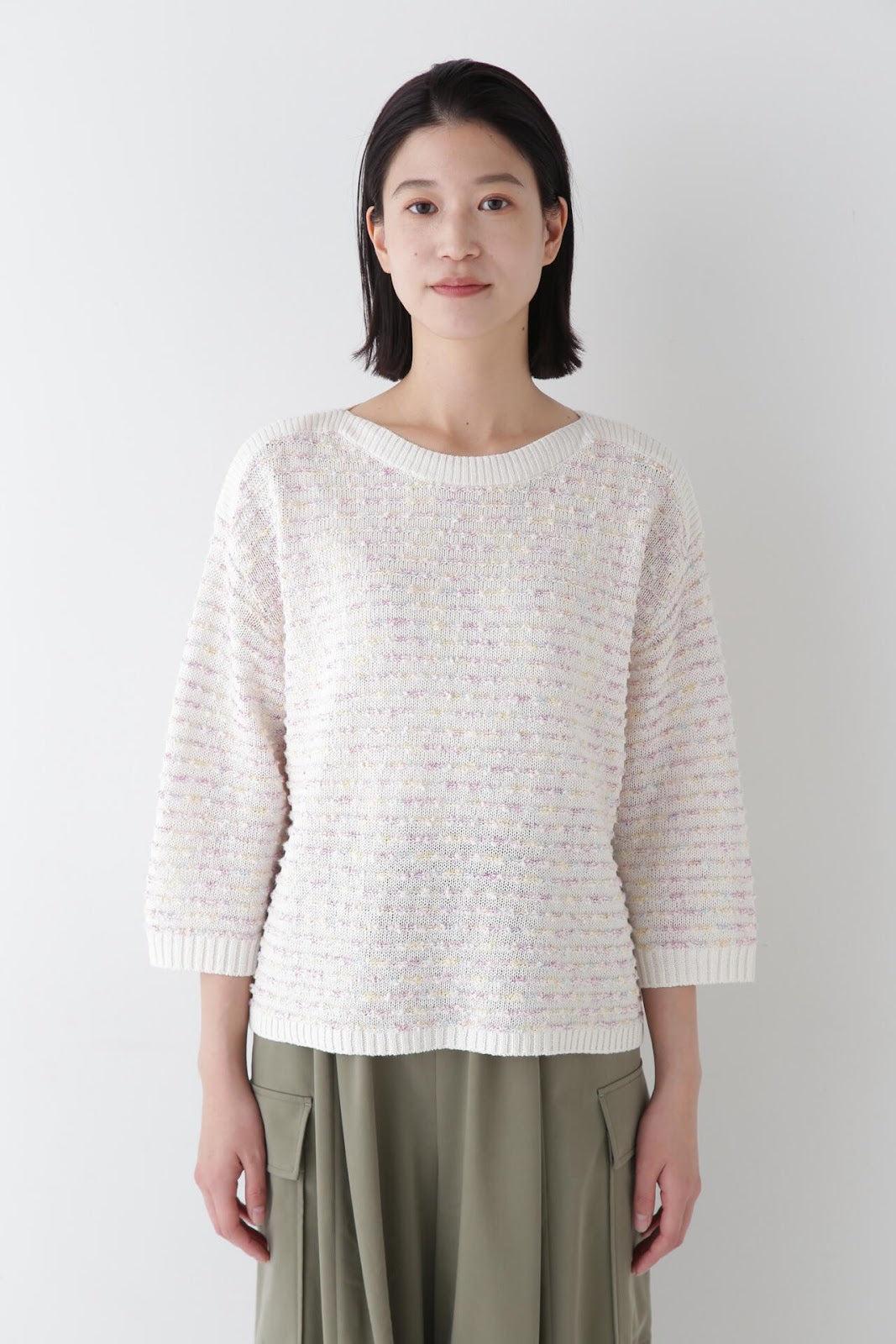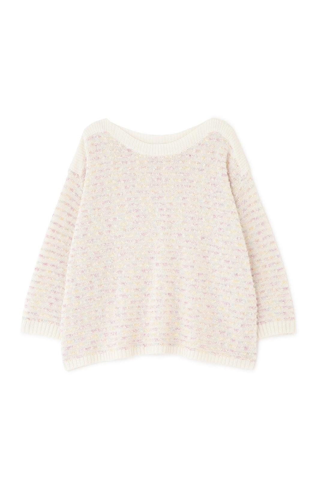 船領套頭衫,充滿趣味的多色外觀 [設計要點] 船領套頭衫由混合紗線和直筒紗線編織而成,採用鉤織圖案,呈現出鑲邊的外觀。它的編織也很寬鬆,具有輕盈的效果。色彩搭配也是一種有趣的方式。由於針織面料的特性,衣服的長度在穿著時會拉伸 5 厘米。柔軟的質地是面料的一大特色。在基本色系的基礎上,搭配其他顏色的紗線,完成了俏皮的搭配。推薦座標] 單穿也很好看的針織上衣。方形輪廓易於平衡,可與多種下裝搭配。