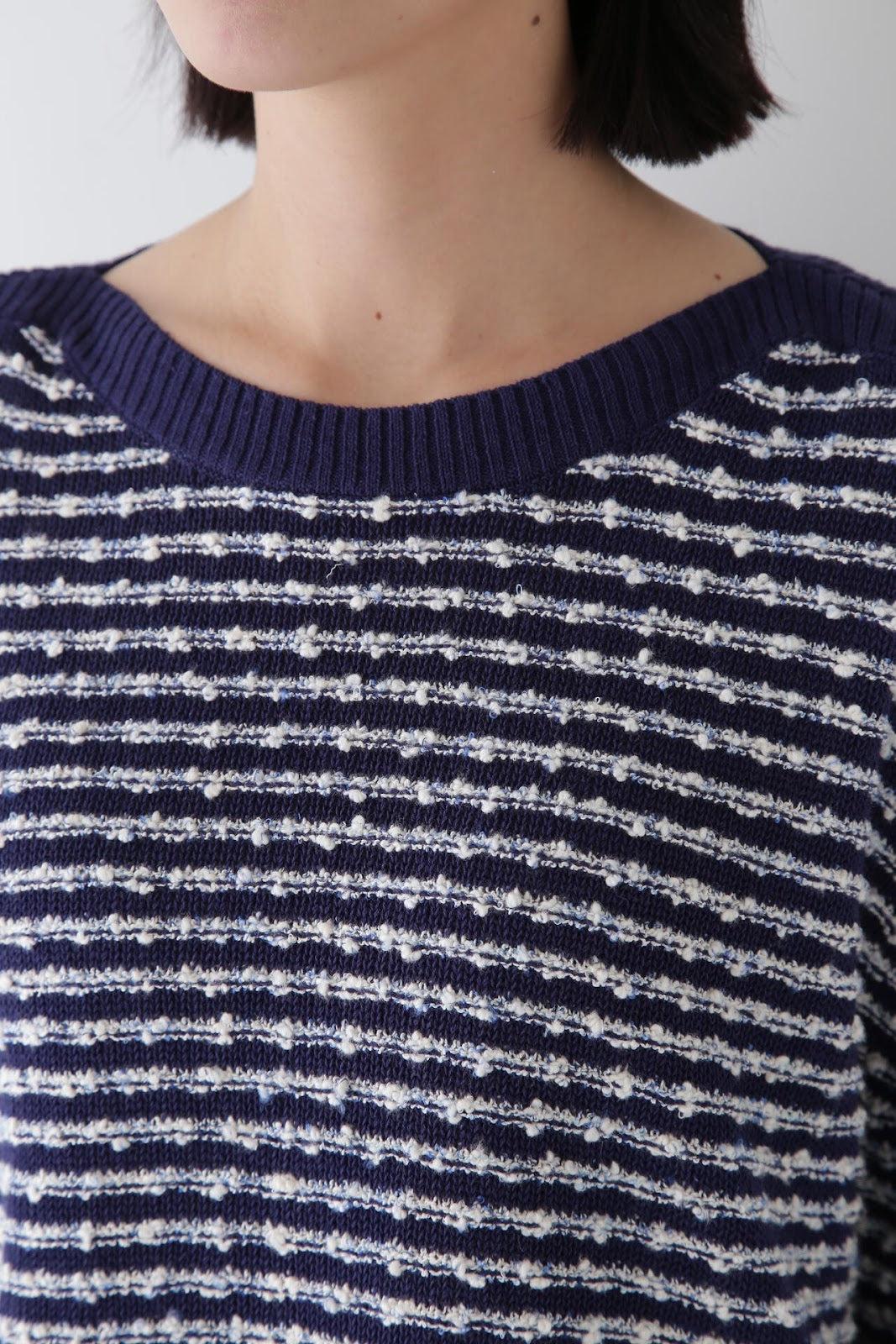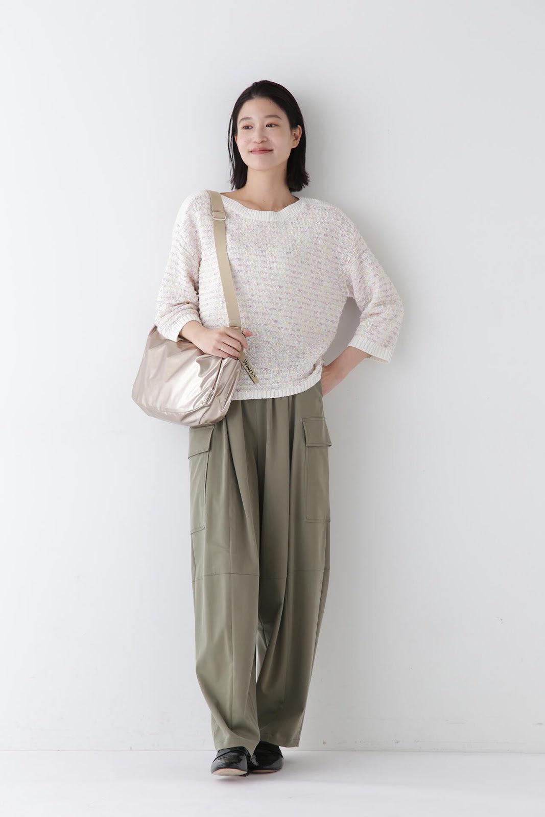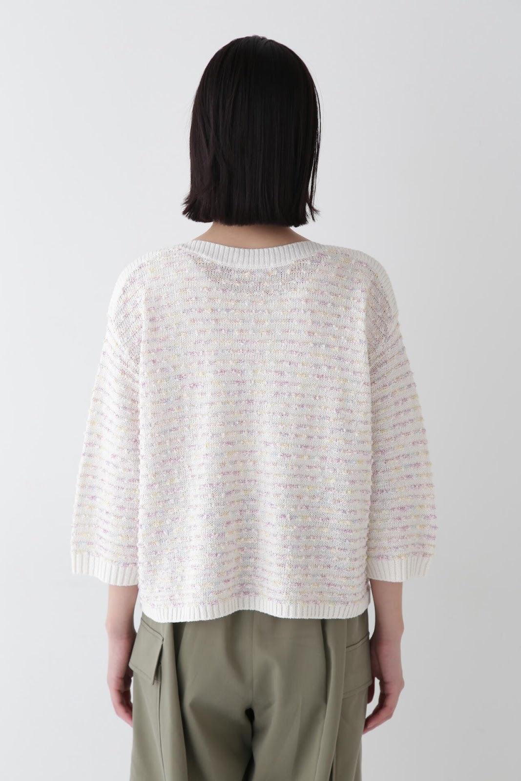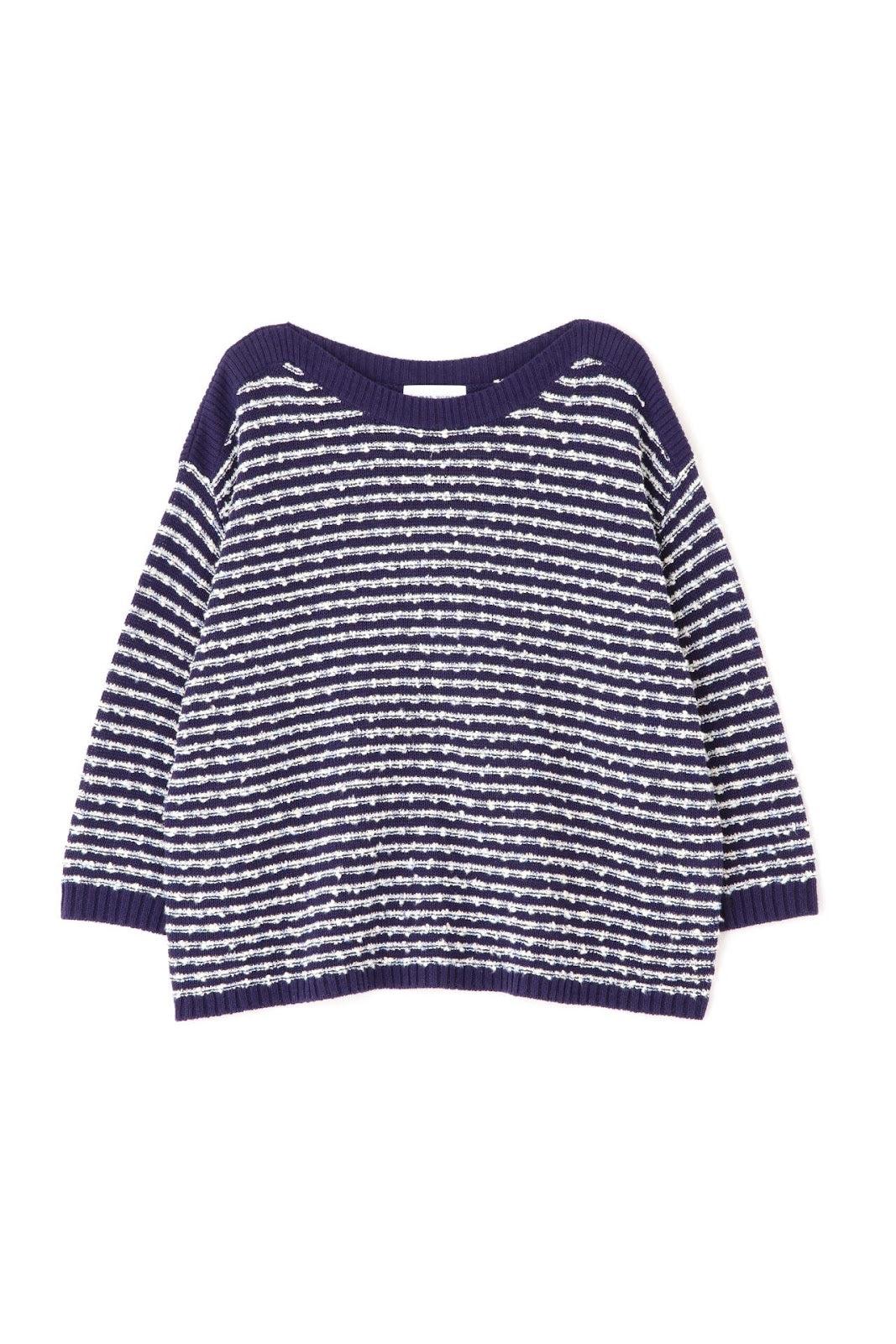 船領套頭衫,充滿趣味的多色外觀 [設計要點] 船領套頭衫由混合紗線和直筒紗線編織而成,採用鉤織圖案,呈現出鑲邊的外觀。它的編織也很寬鬆,具有輕盈的效果。色彩搭配也是一種有趣的方式。由於針織面料的特性,衣服的長度在穿著時會拉伸 5 厘米。柔軟的質地是面料的一大特色。在基本色系的基礎上,搭配其他顏色的紗線,完成了俏皮的搭配。推薦座標] 單穿也很好看的針織上衣。方形輪廓易於平衡,可與多種下裝搭配。