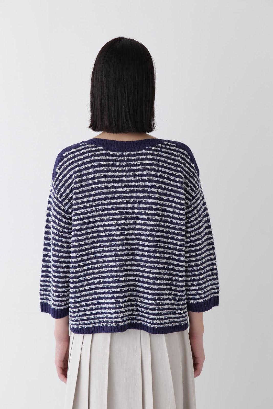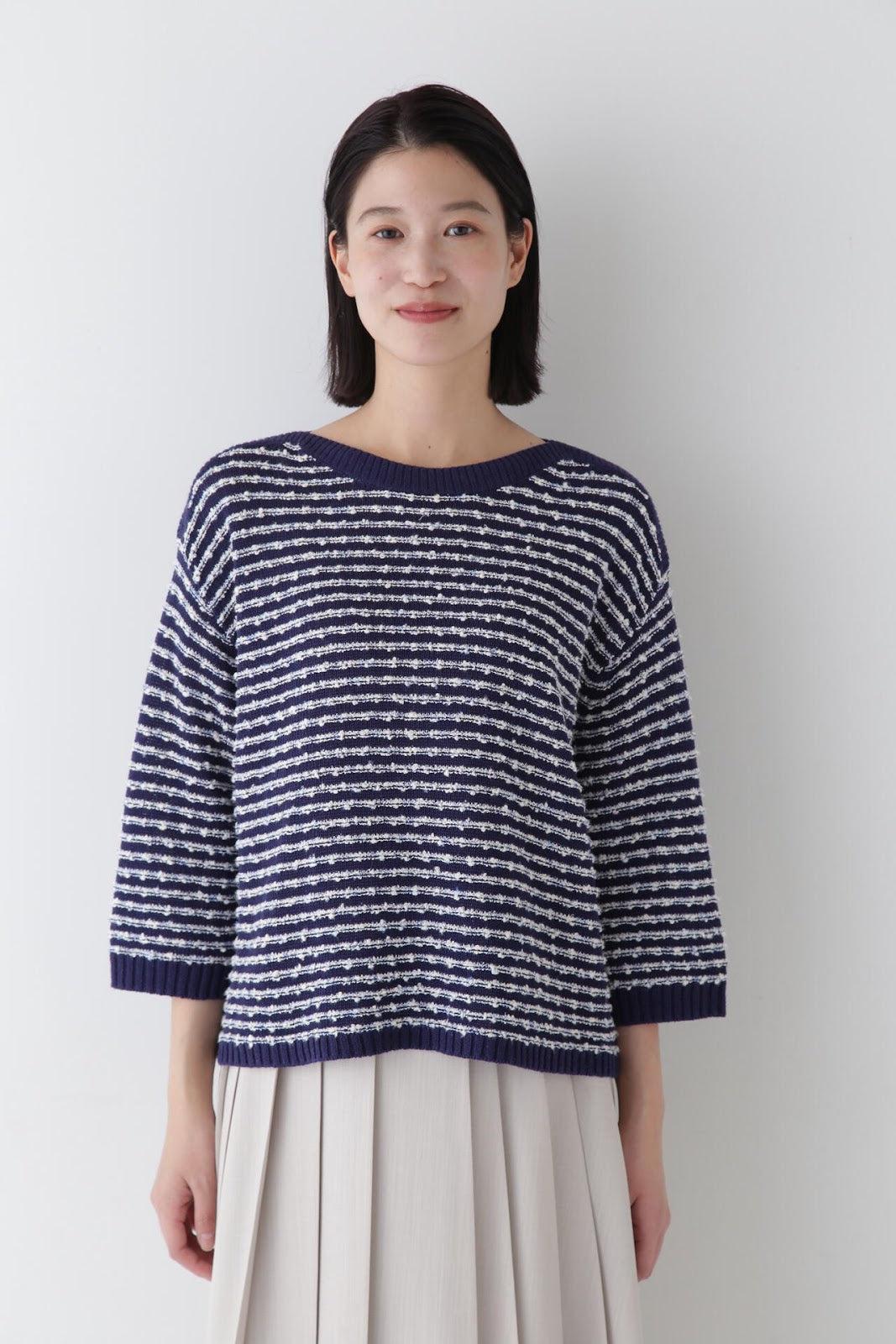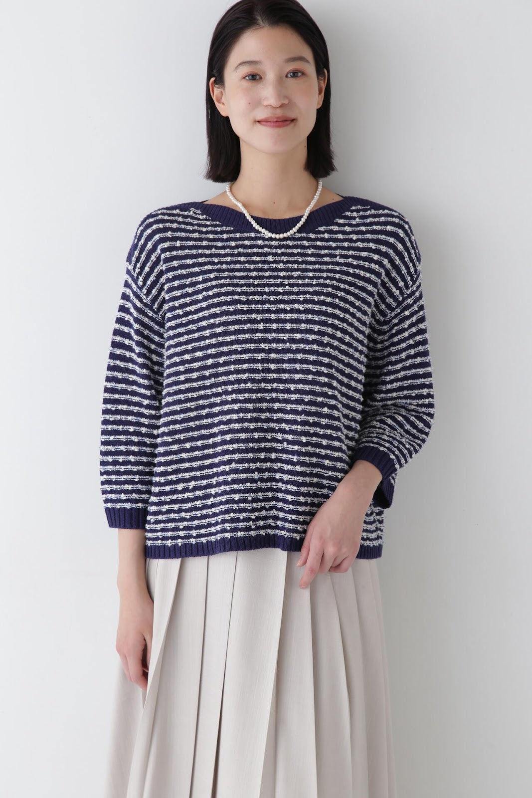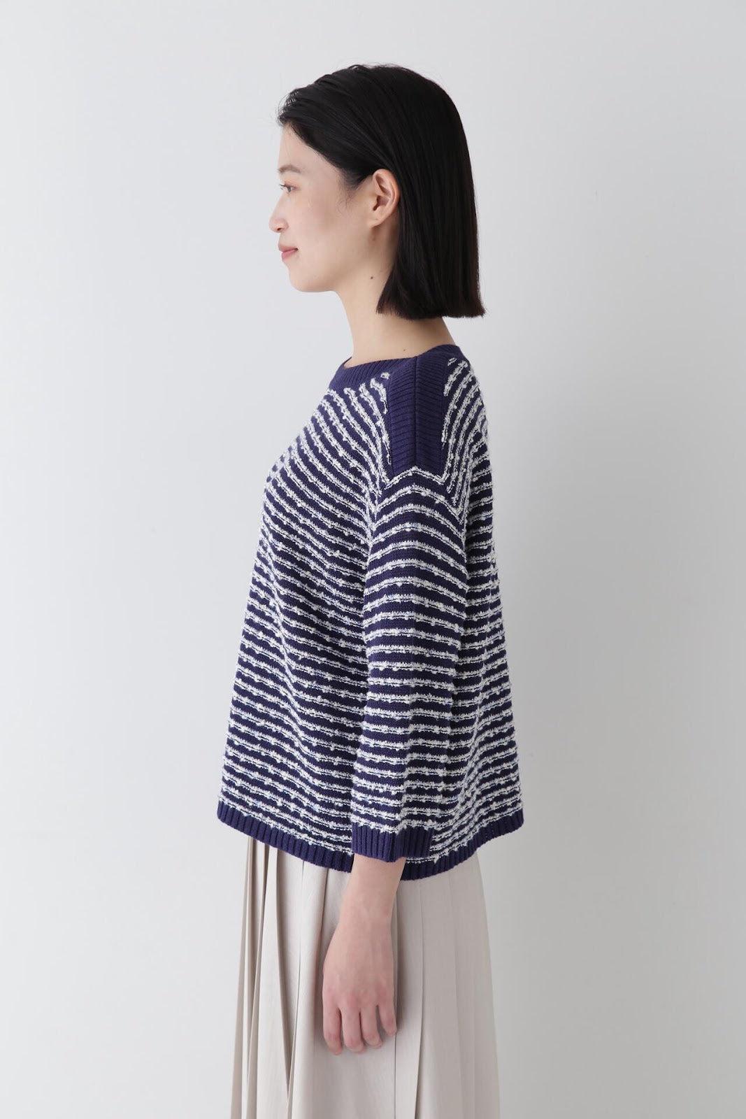 船領套頭衫,充滿趣味的多色外觀 [設計要點] 船領套頭衫由混合紗線和直筒紗線編織而成,採用鉤織圖案,呈現出鑲邊的外觀。它的編織也很寬鬆,具有輕盈的效果。色彩搭配也是一種有趣的方式。由於針織面料的特性,衣服的長度在穿著時會拉伸 5 厘米。柔軟的質地是面料的一大特色。在基本色系的基礎上,搭配其他顏色的紗線,完成了俏皮的搭配。推薦座標] 單穿也很好看的針織上衣。方形輪廓易於平衡,可與多種下裝搭配。