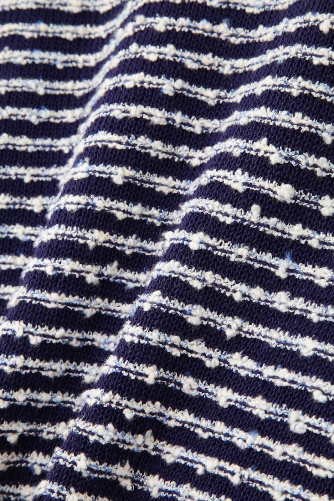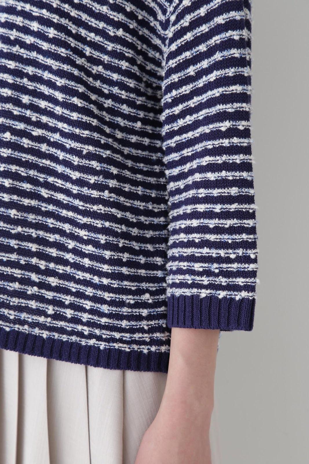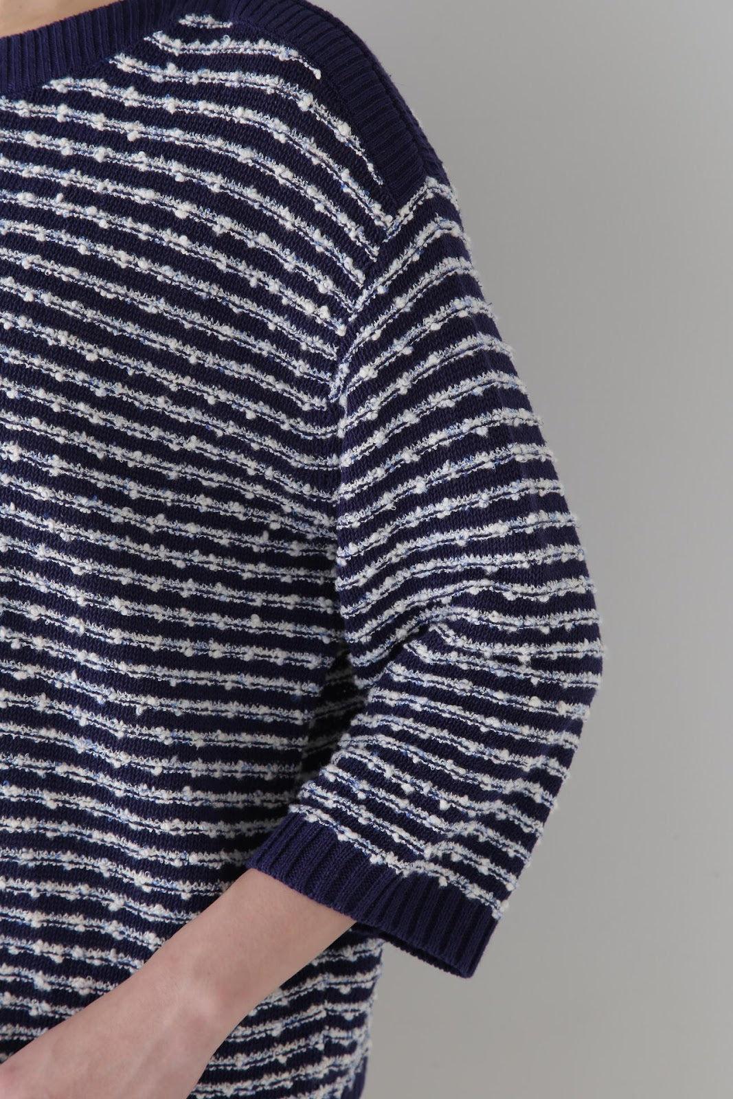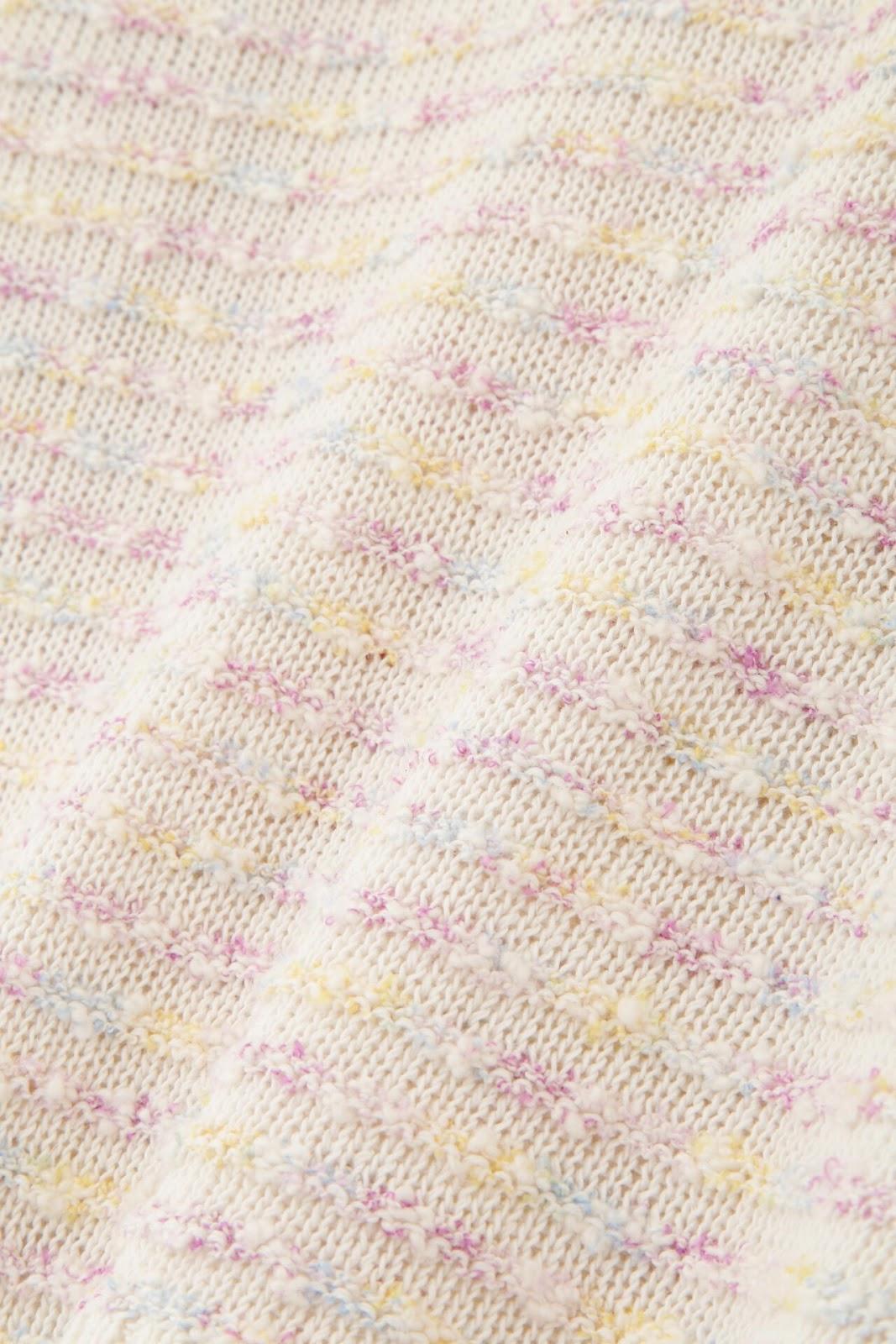 船領套頭衫,充滿趣味的多色外觀 [設計要點] 船領套頭衫由混合紗線和直筒紗線編織而成,採用鉤織圖案,呈現出鑲邊的外觀。它的編織也很寬鬆,具有輕盈的效果。色彩搭配也是一種有趣的方式。由於針織面料的特性,衣服的長度在穿著時會拉伸 5 厘米。柔軟的質地是面料的一大特色。在基本色系的基礎上,搭配其他顏色的紗線,完成了俏皮的搭配。推薦座標] 單穿也很好看的針織上衣。方形輪廓易於平衡,可與多種下裝搭配。