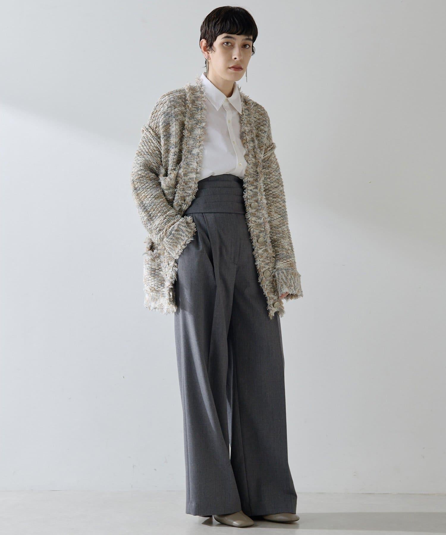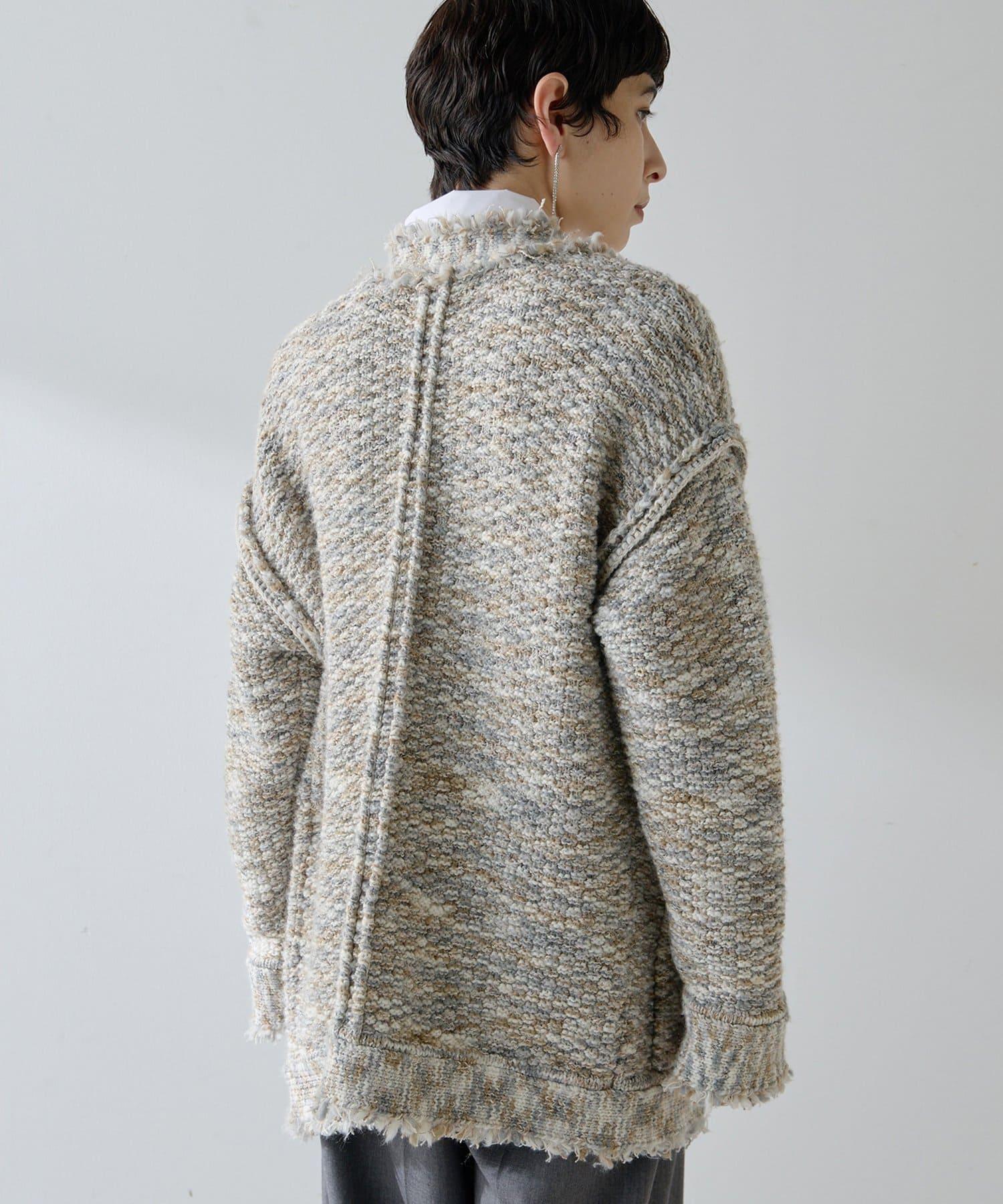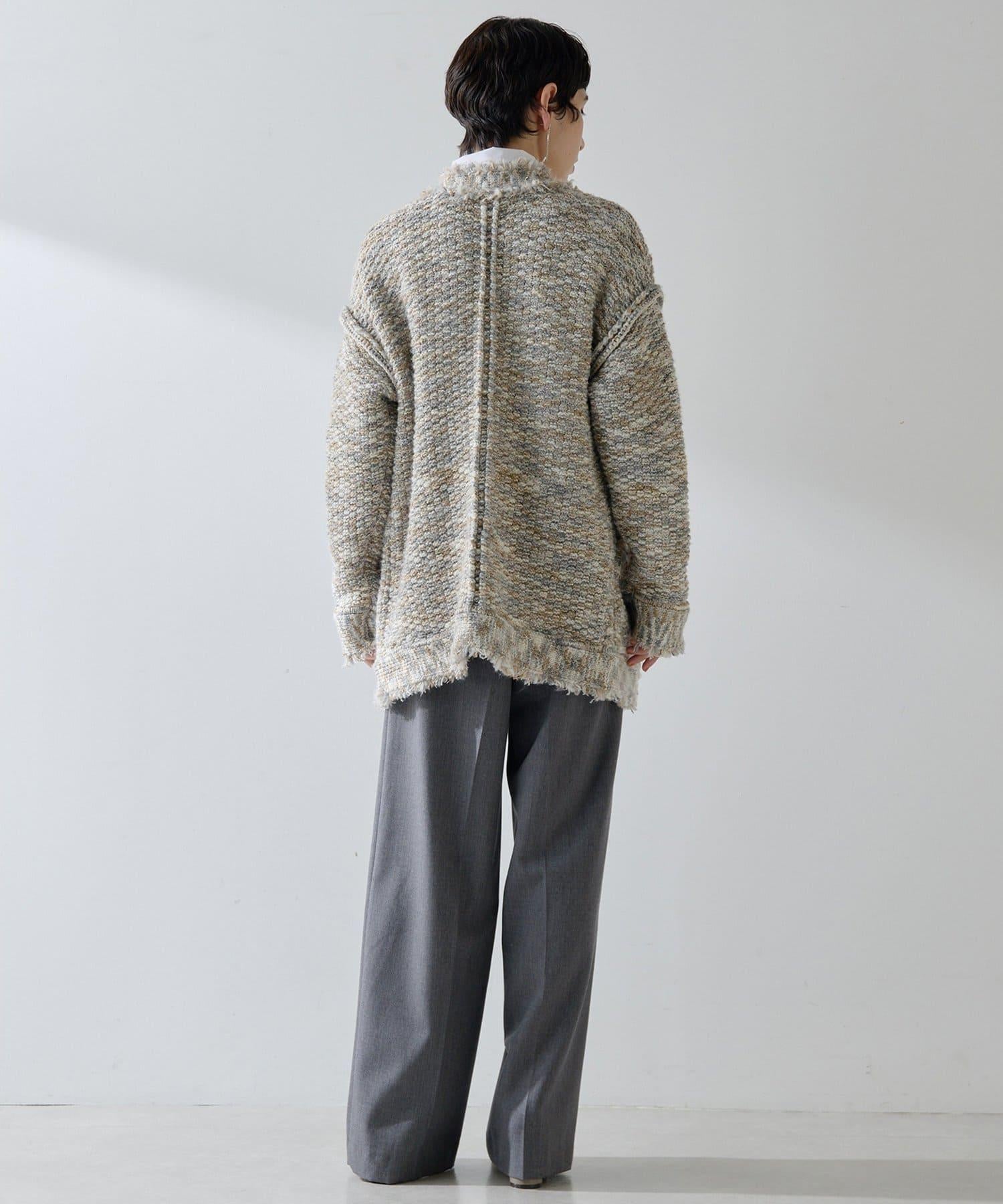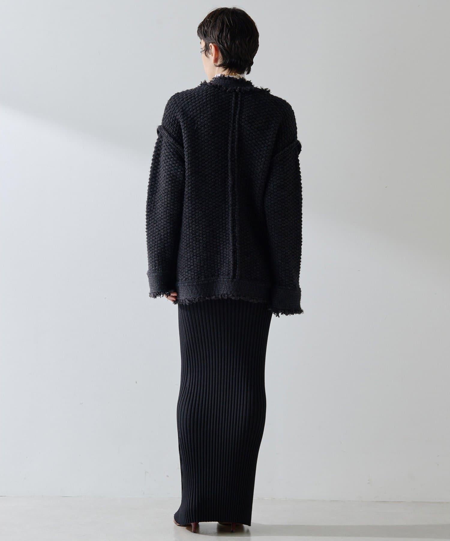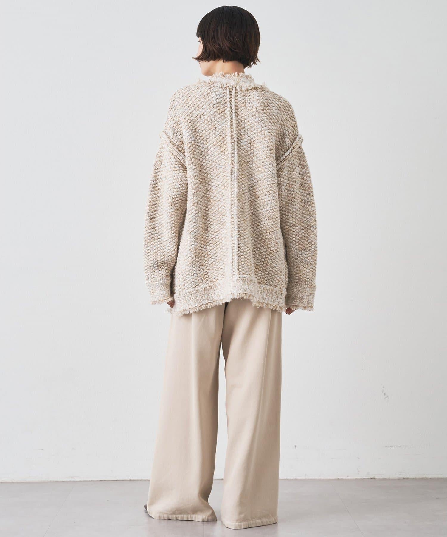 由兩種紗線組合而成的類似花呢的針織面料:粗大的腈綸紗線和經絣染工藝染色的粗絨紗線。