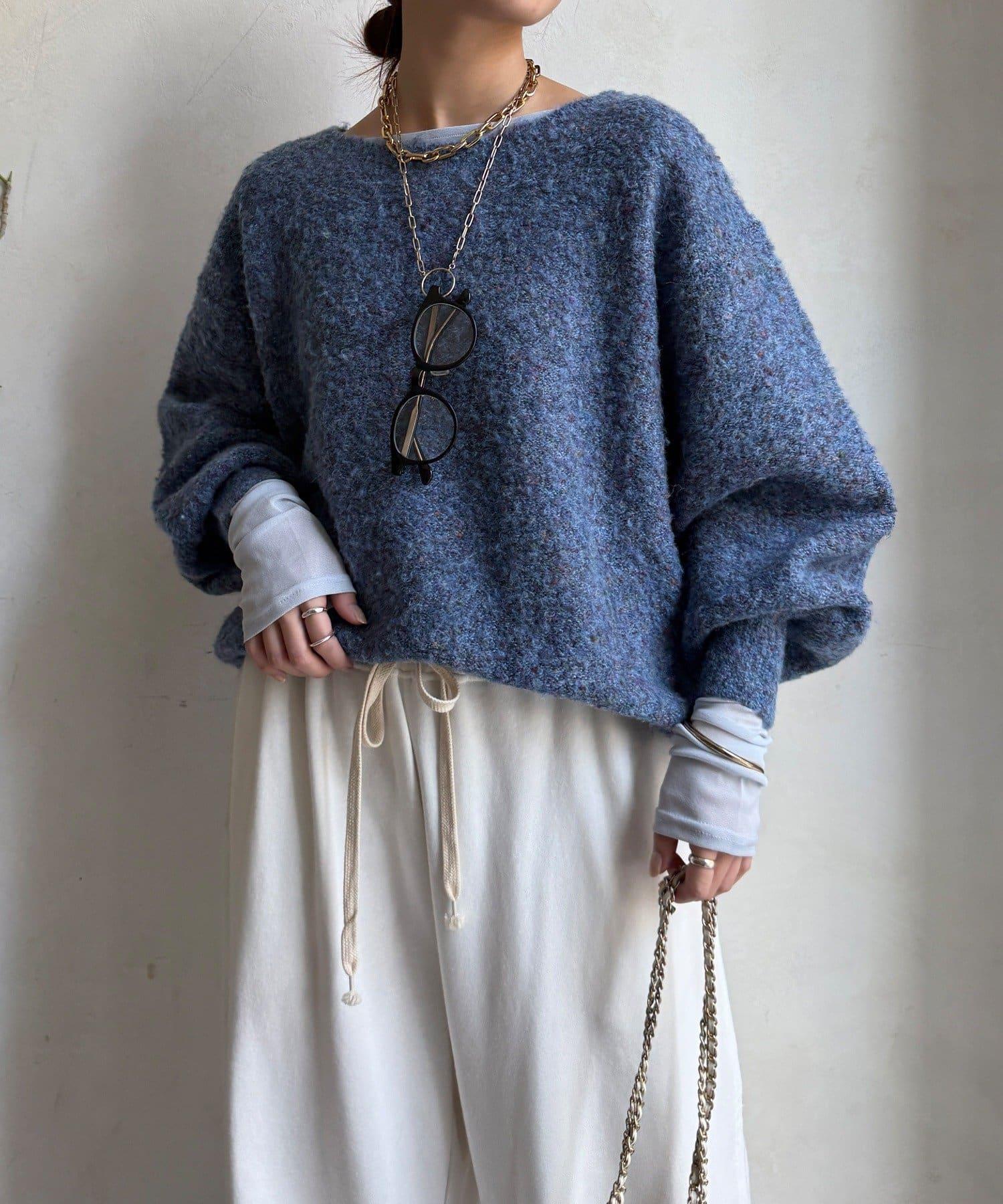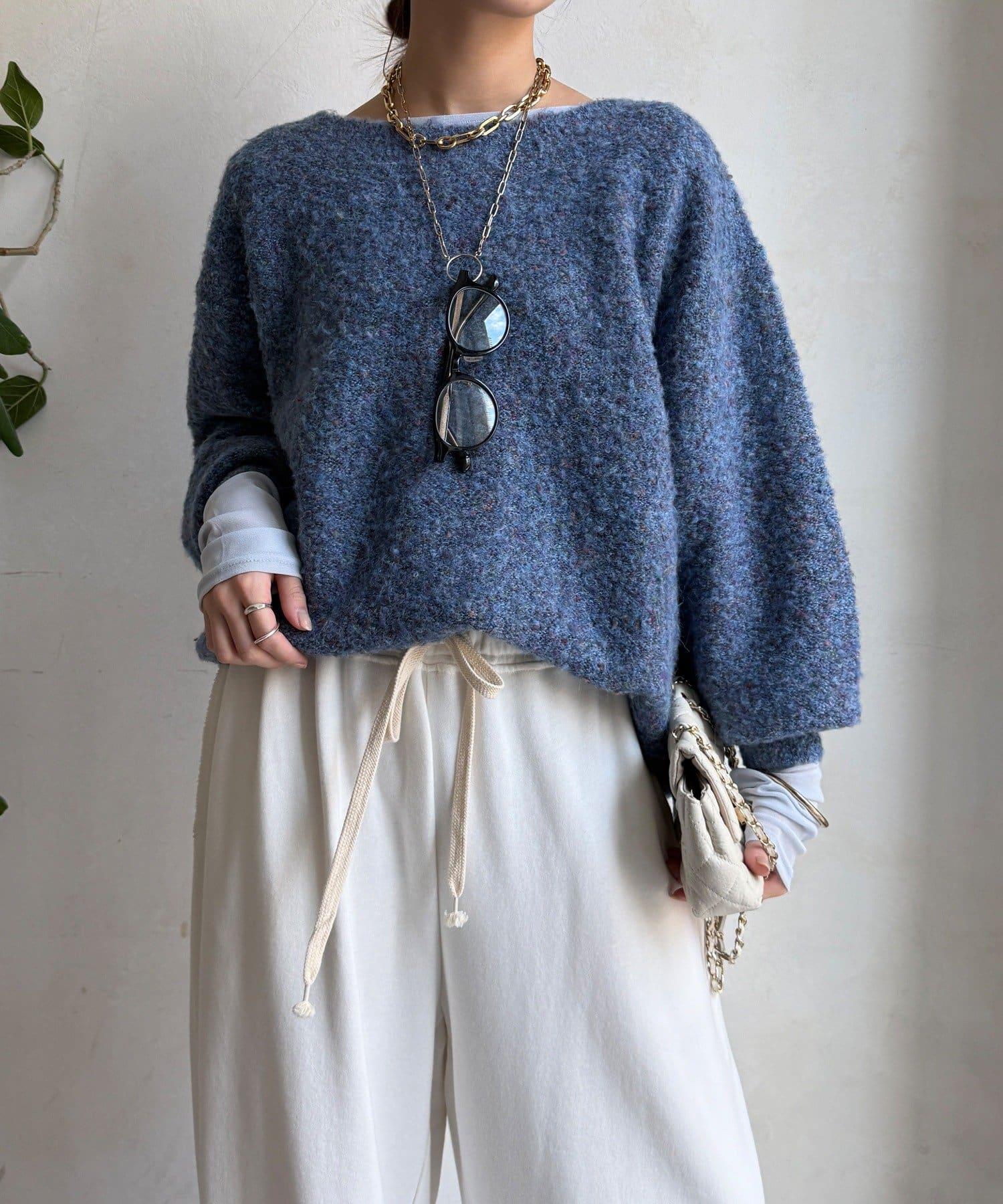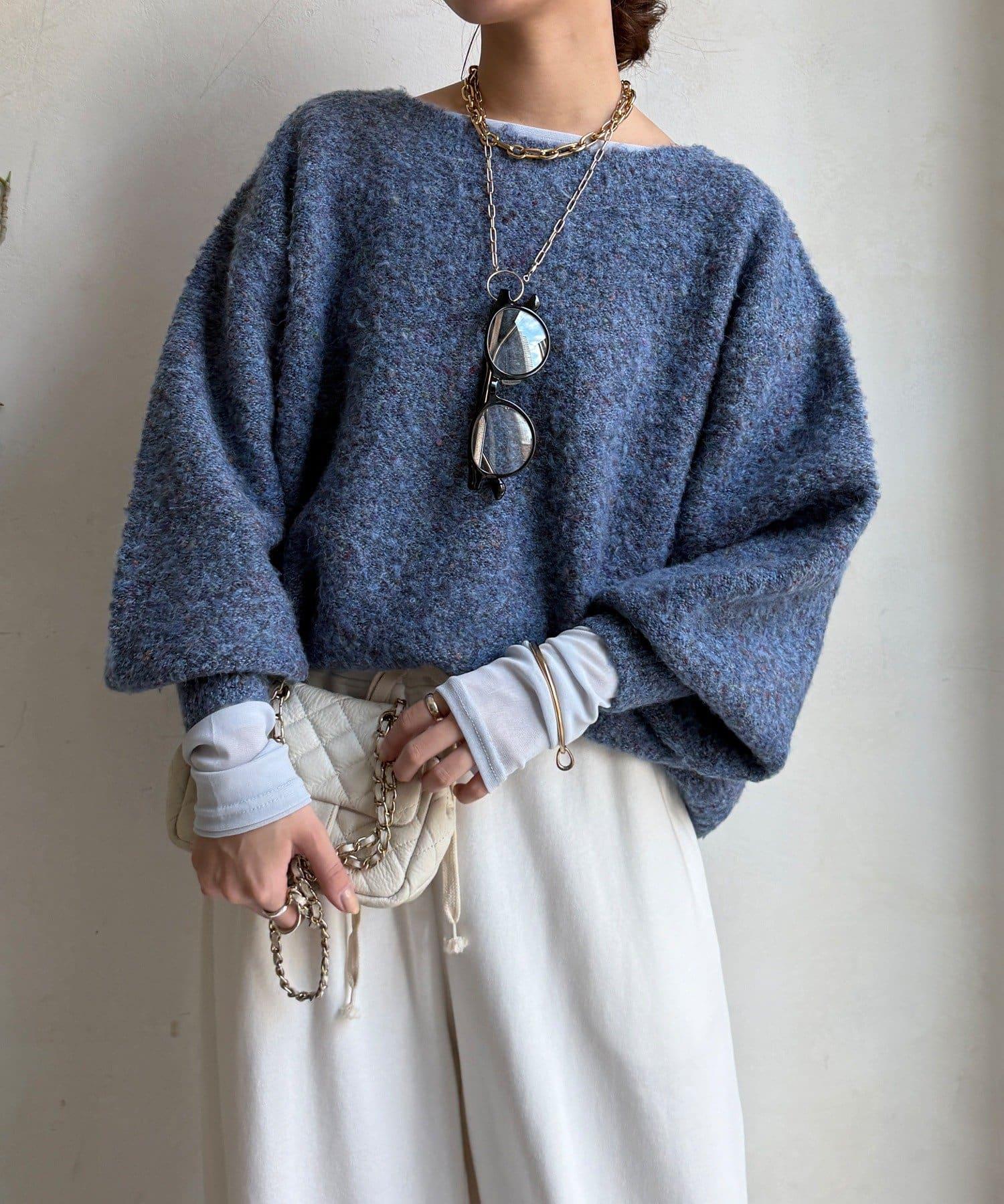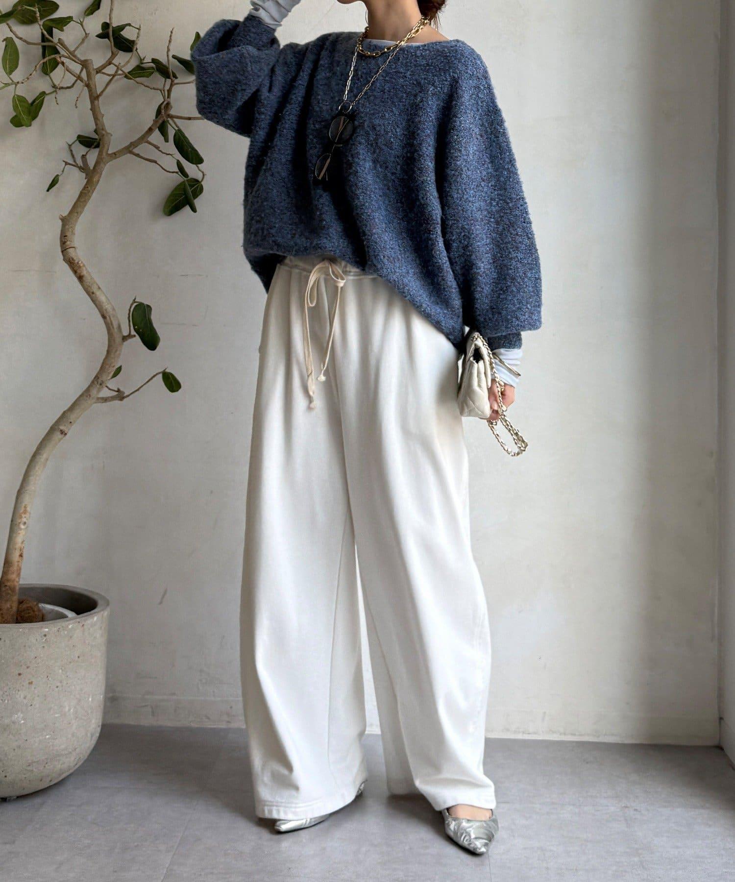 船形領口展現了女性的鎖骨。寬鬆的衣身和下垂的肩部營造出輕鬆愜意的感覺。
