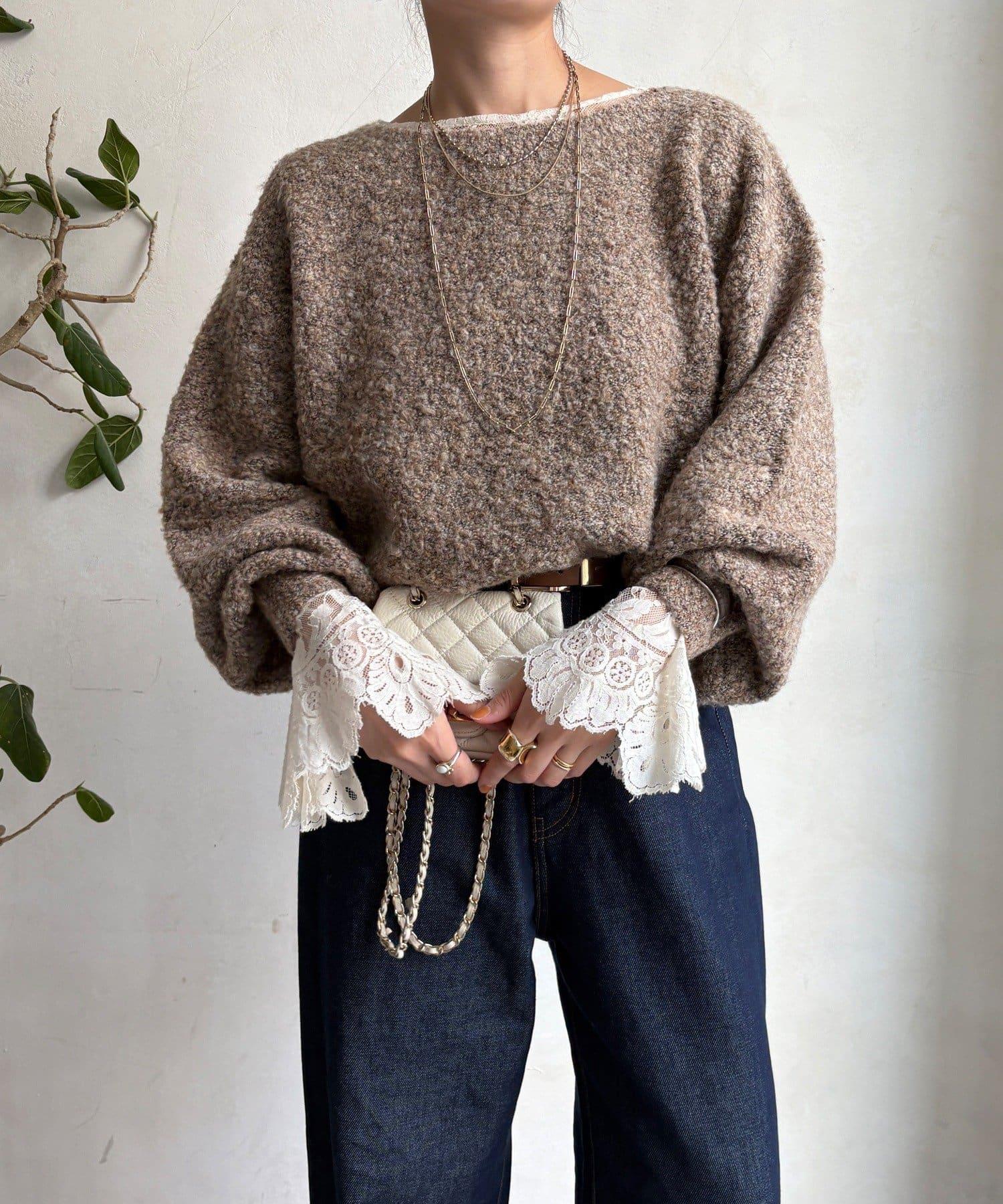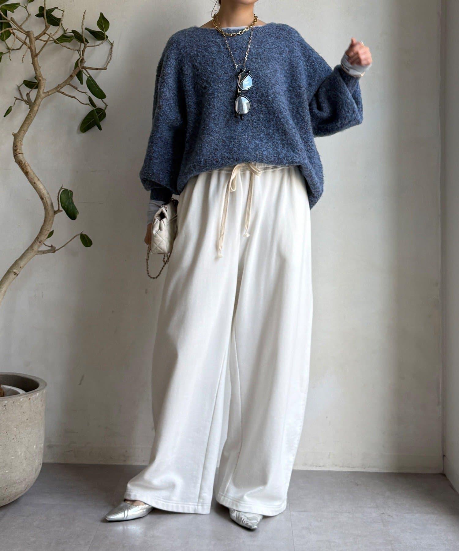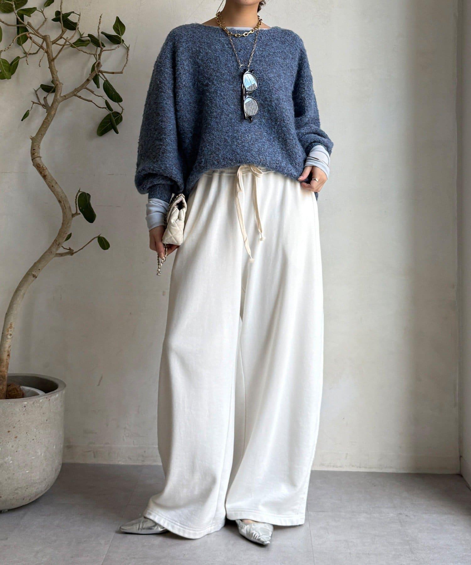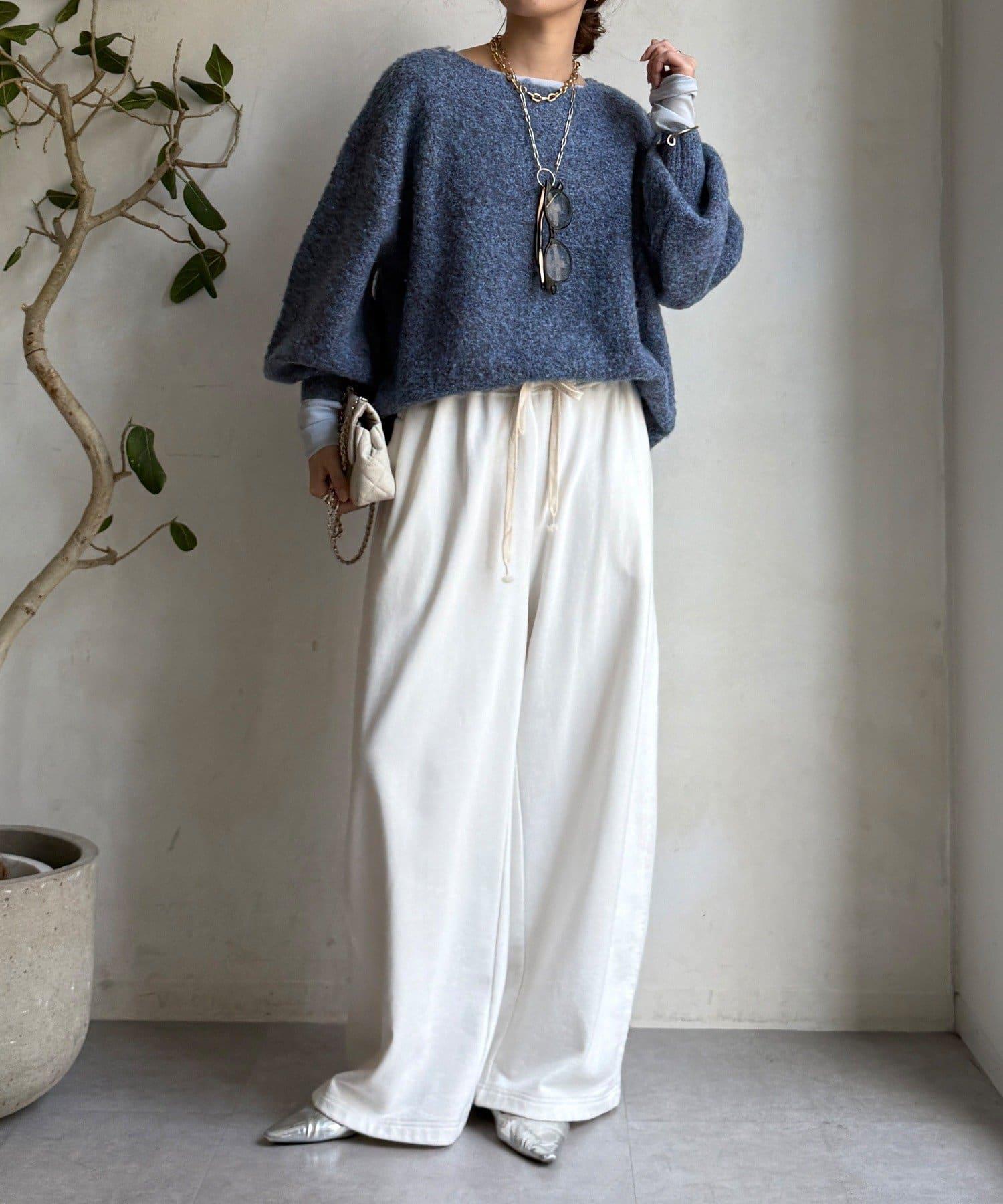 船形領口展現了女性的鎖骨。寬鬆的衣身和下垂的肩部營造出輕鬆愜意的感覺。