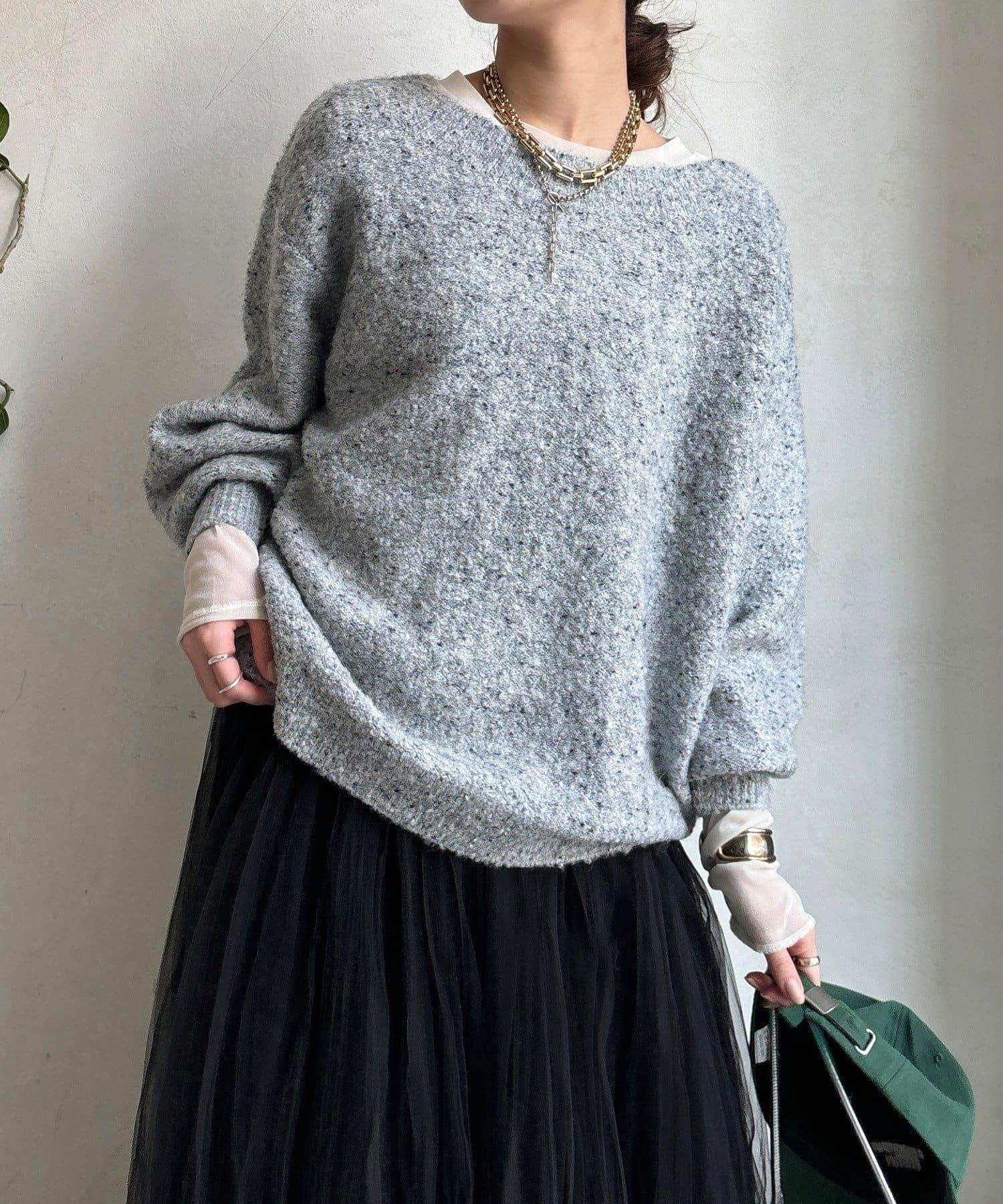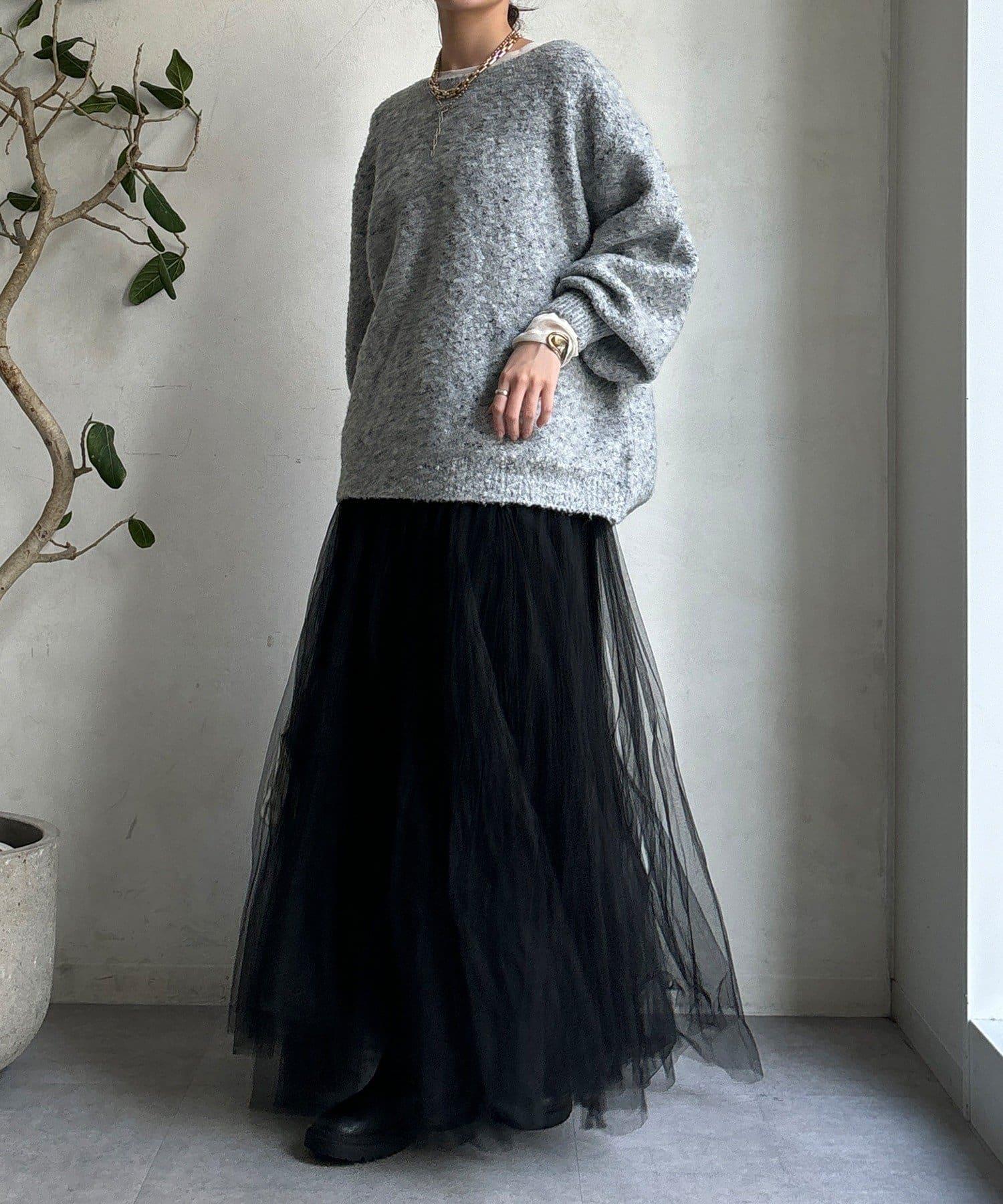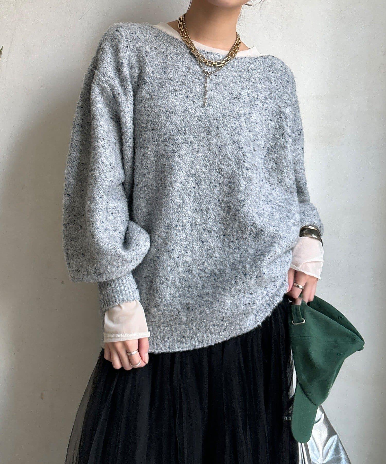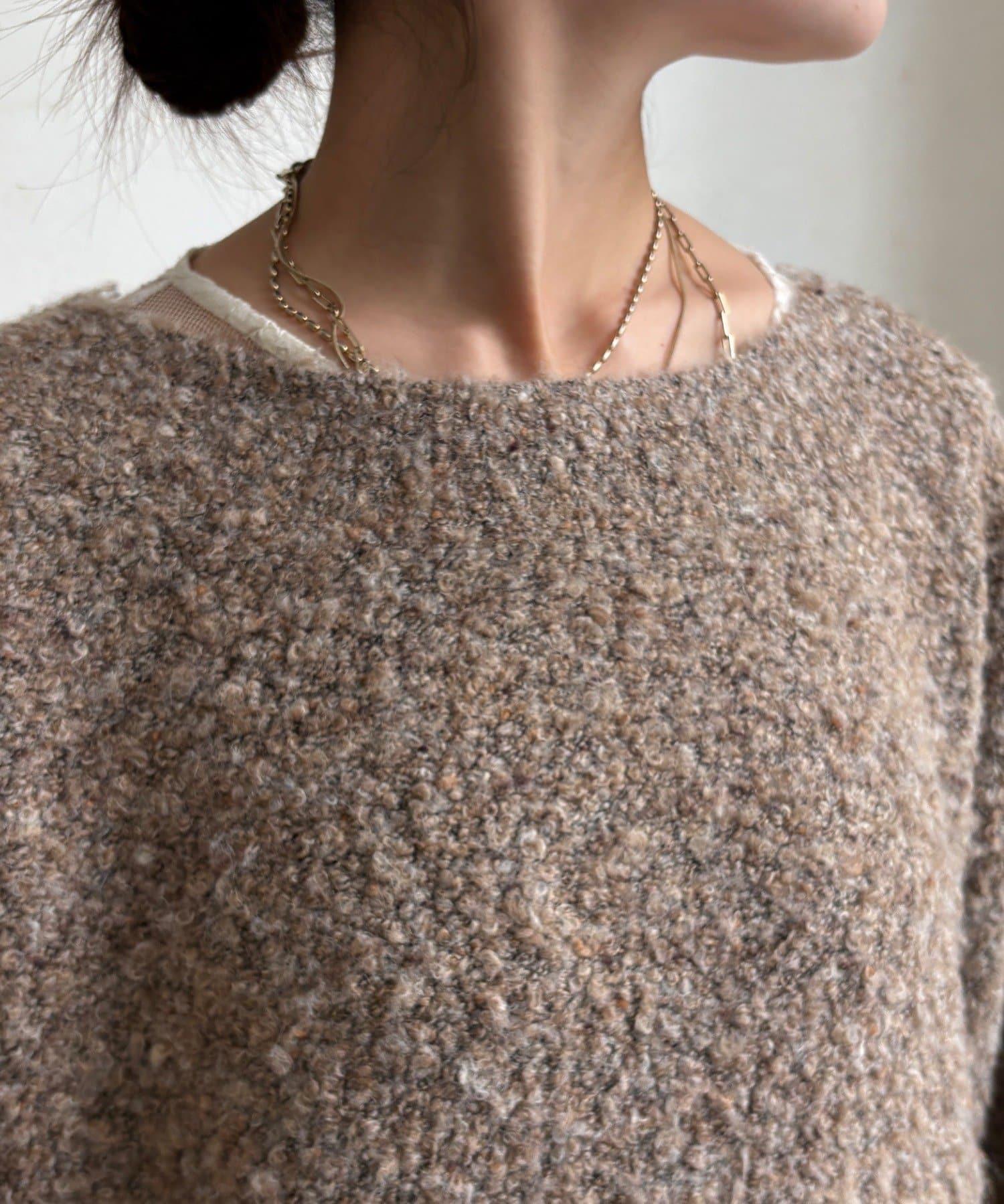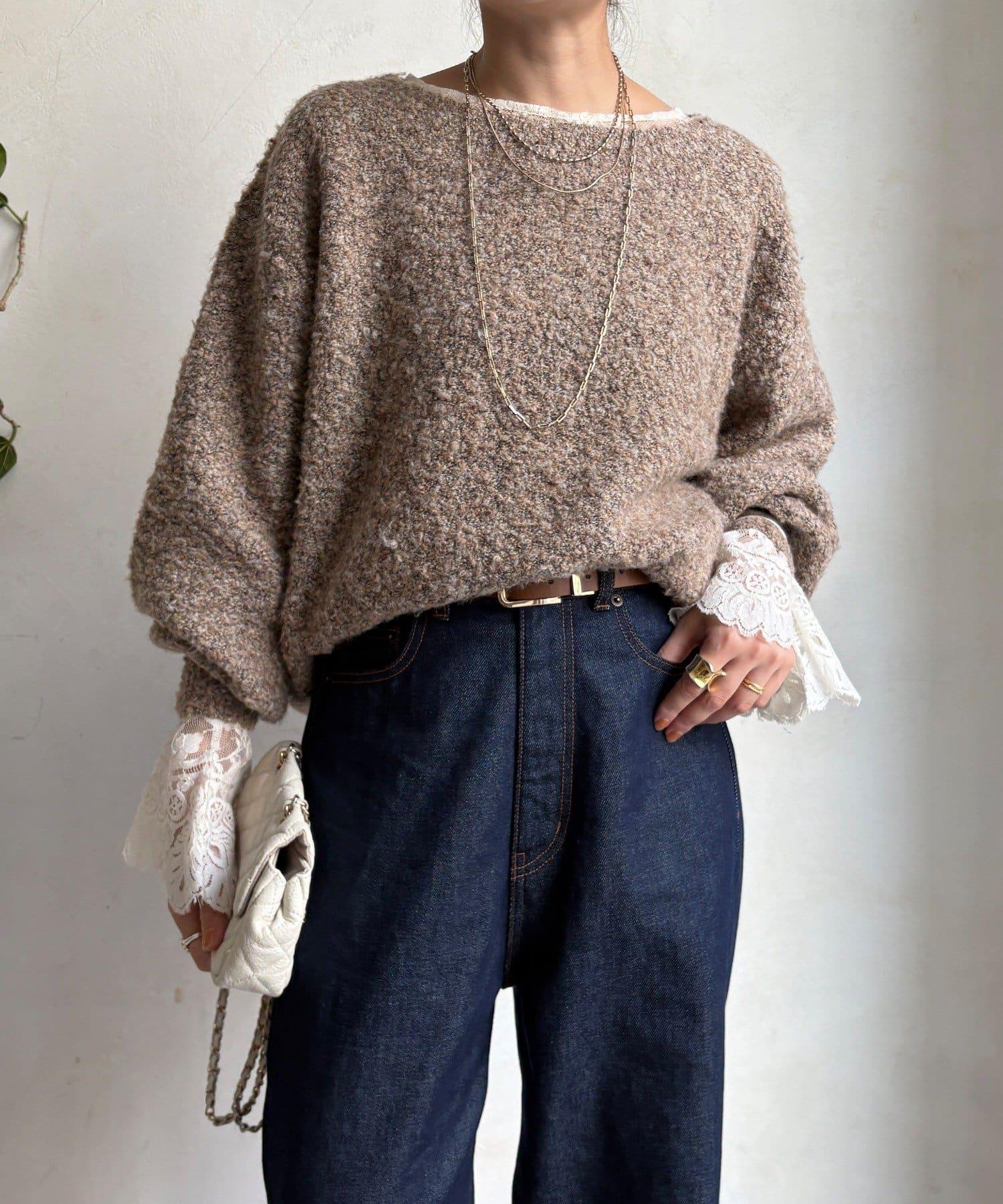 船形領口展現了女性的鎖骨。寬鬆的衣身和下垂的肩部營造出輕鬆愜意的感覺。