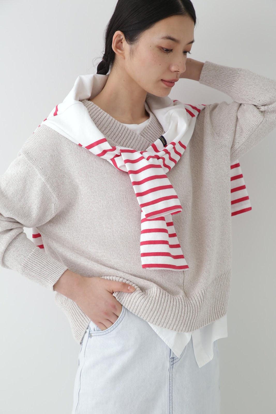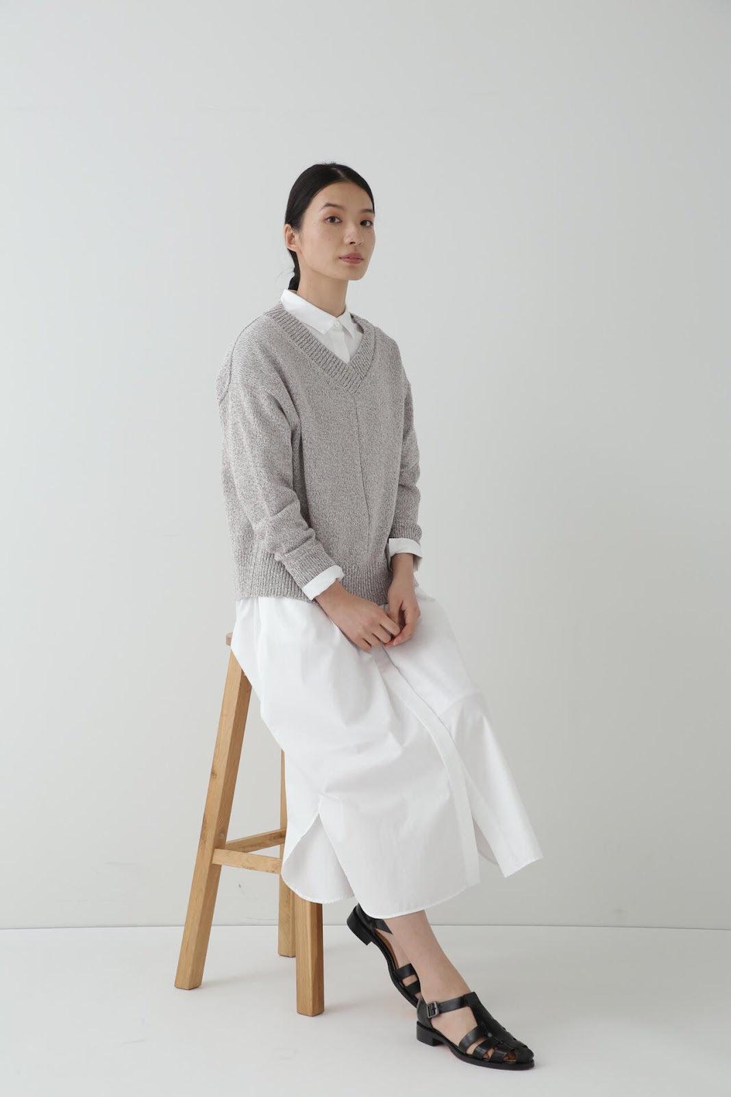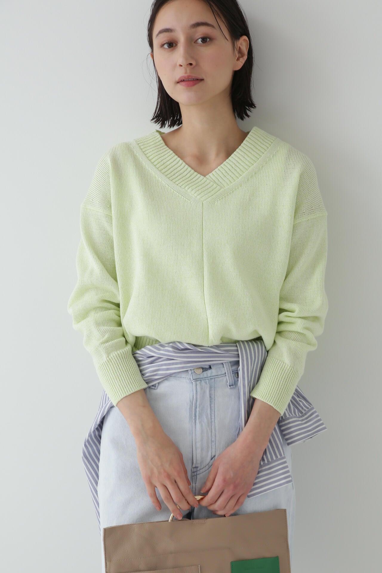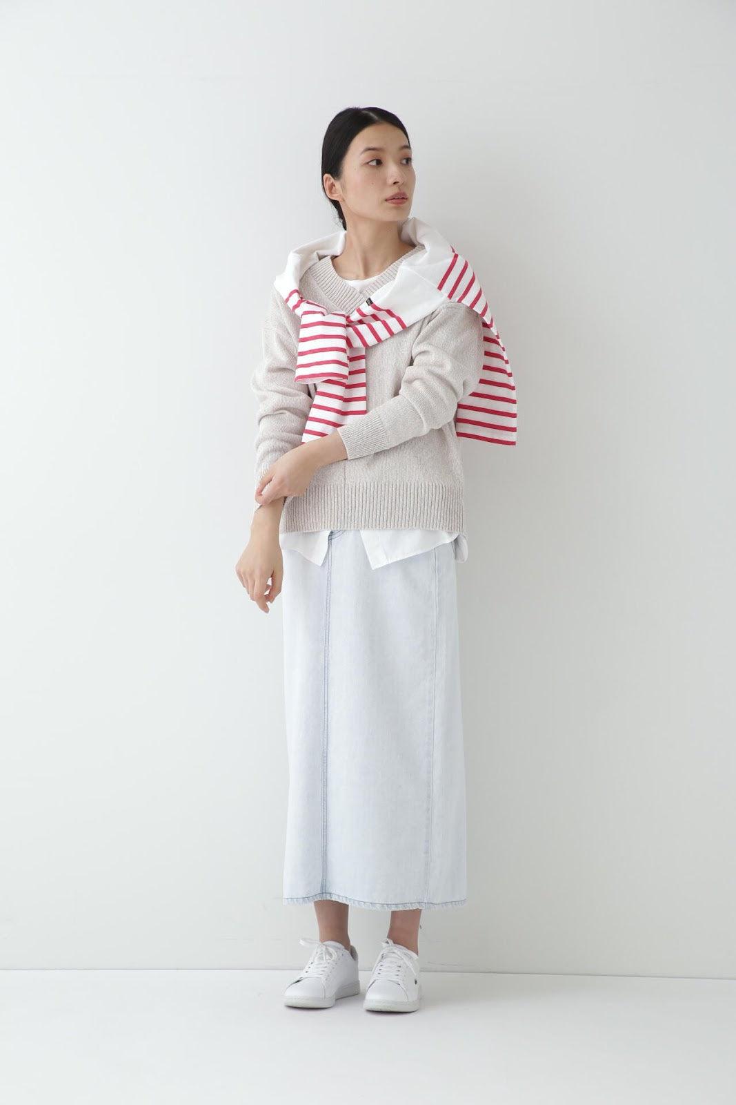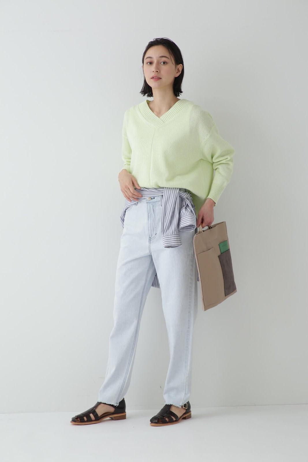 每季都大受歡迎的混色吉馬針織衫今年又有了新的顏色!V 領是成熟廓形的一大特色,具有體積感。這種設計的目的是在延長後長的情況下給人一種鬆弛感。面料具有涼爽的亞麻質感,由 100% 棉紗經特殊的 Gima 工藝製成。通過將三根紗線捻在一起,使顏色和編織達到平衡,從而呈現出木質外觀,並在白色的基礎上呈現出如春天般柔和的色調。顏色方面,本季流行色為棕色,主題色淺綠色也是粉色,給人溫和的印象。我們建議通過充分利用色彩來協調春季色彩。