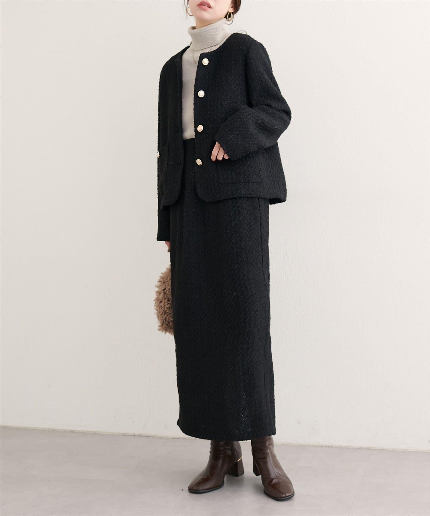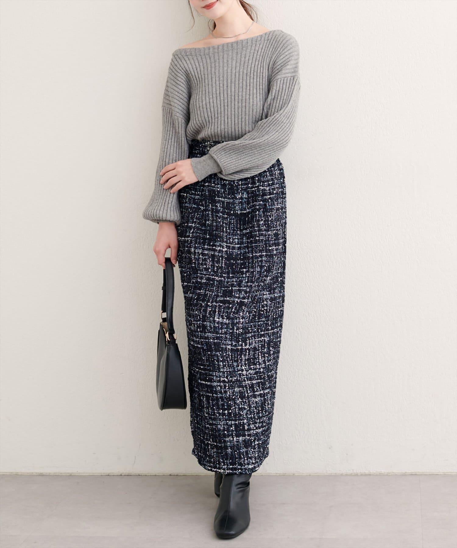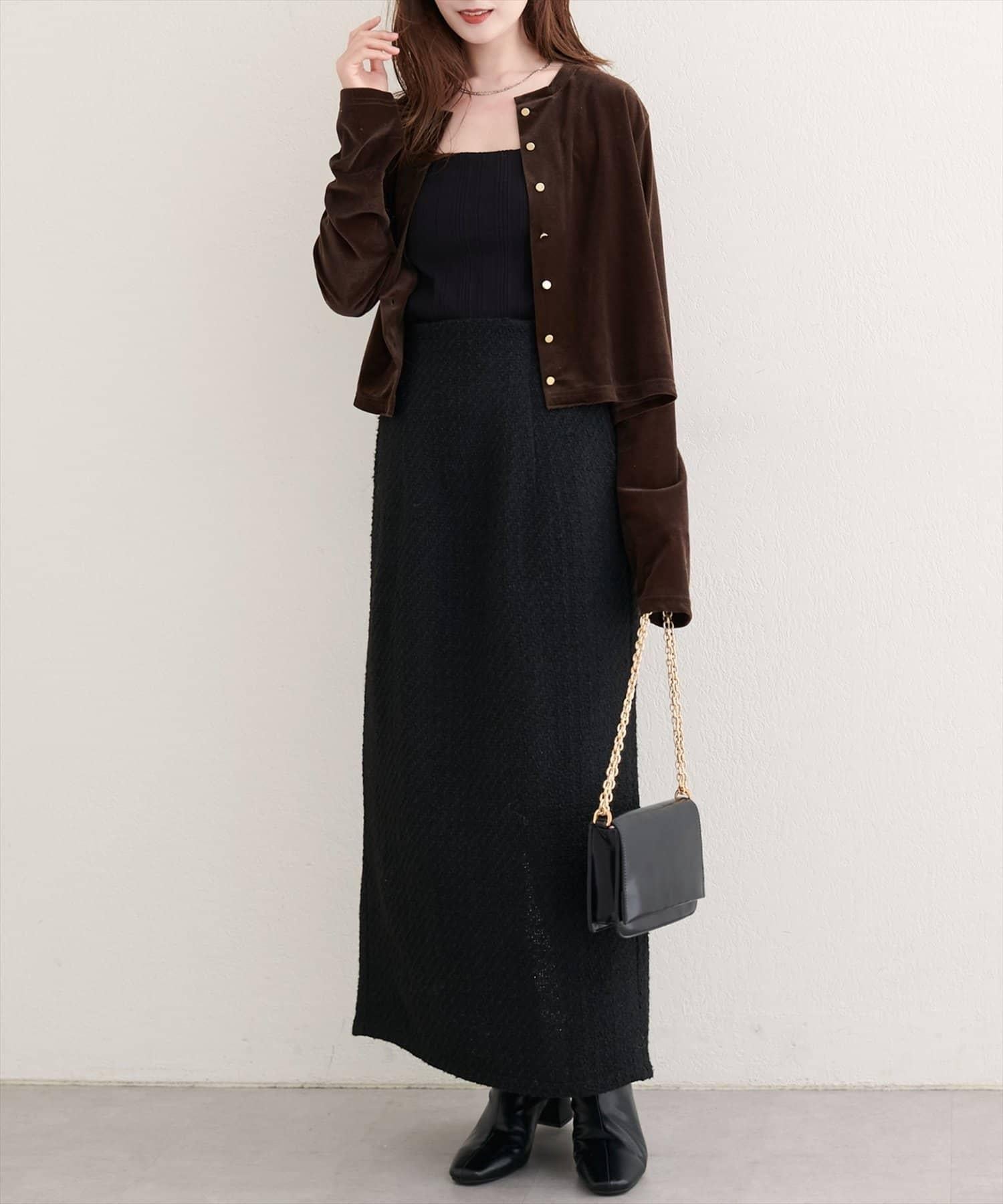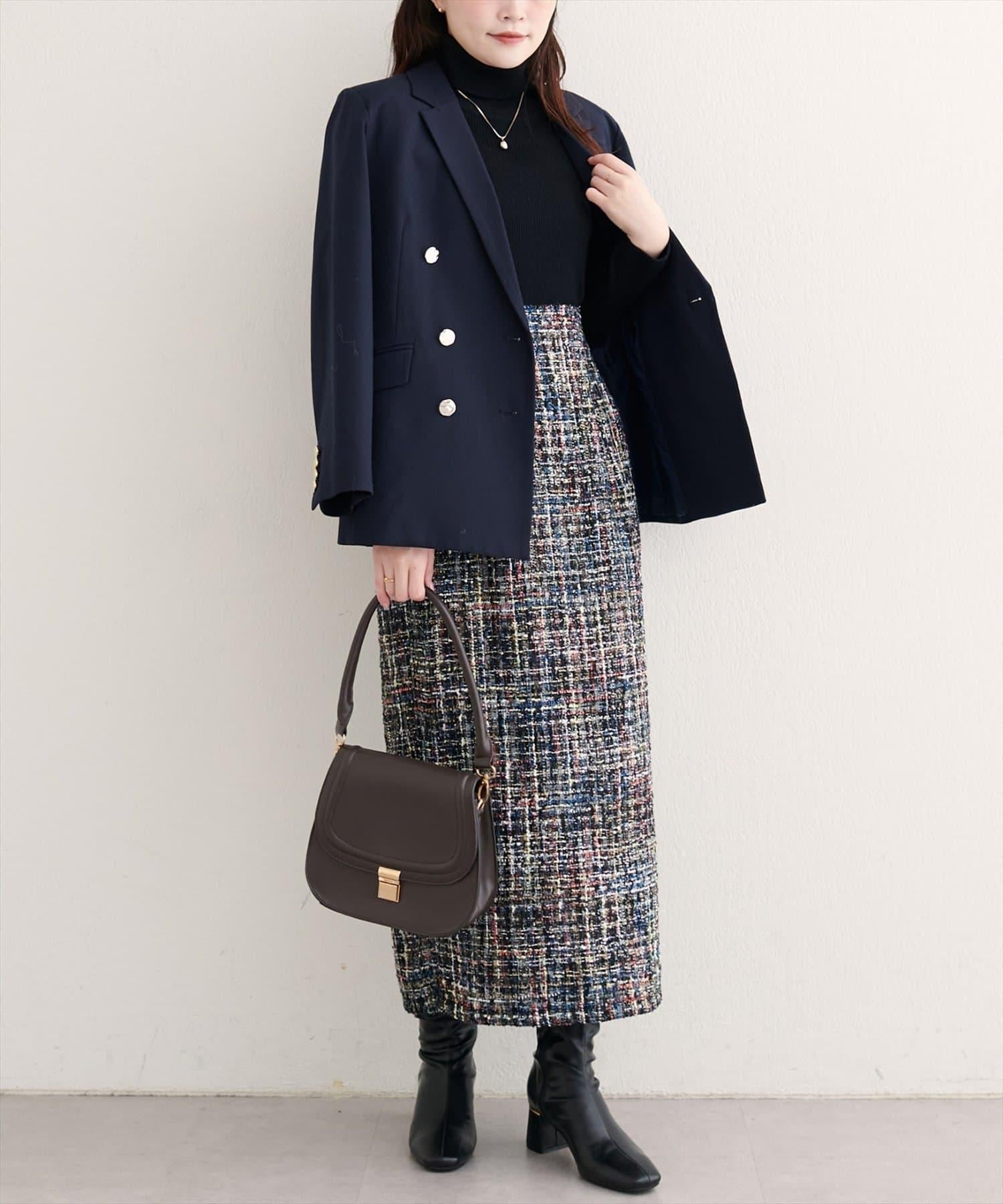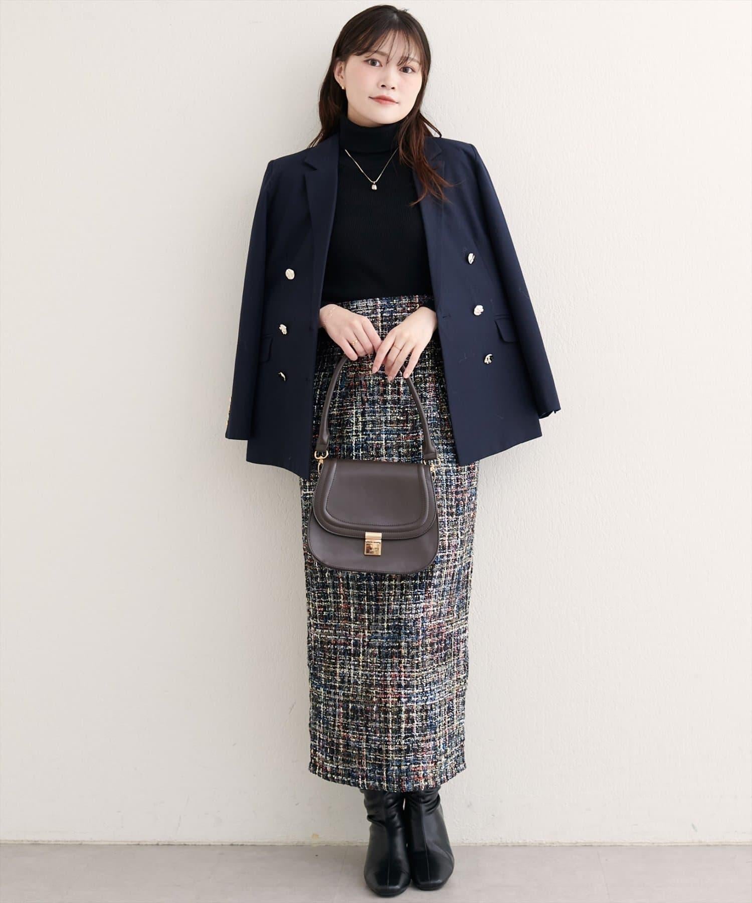 此外,建議將裙子上的斜紋軟呢顏色運用到上衣中。這樣可以營造出整體感和時尚感。