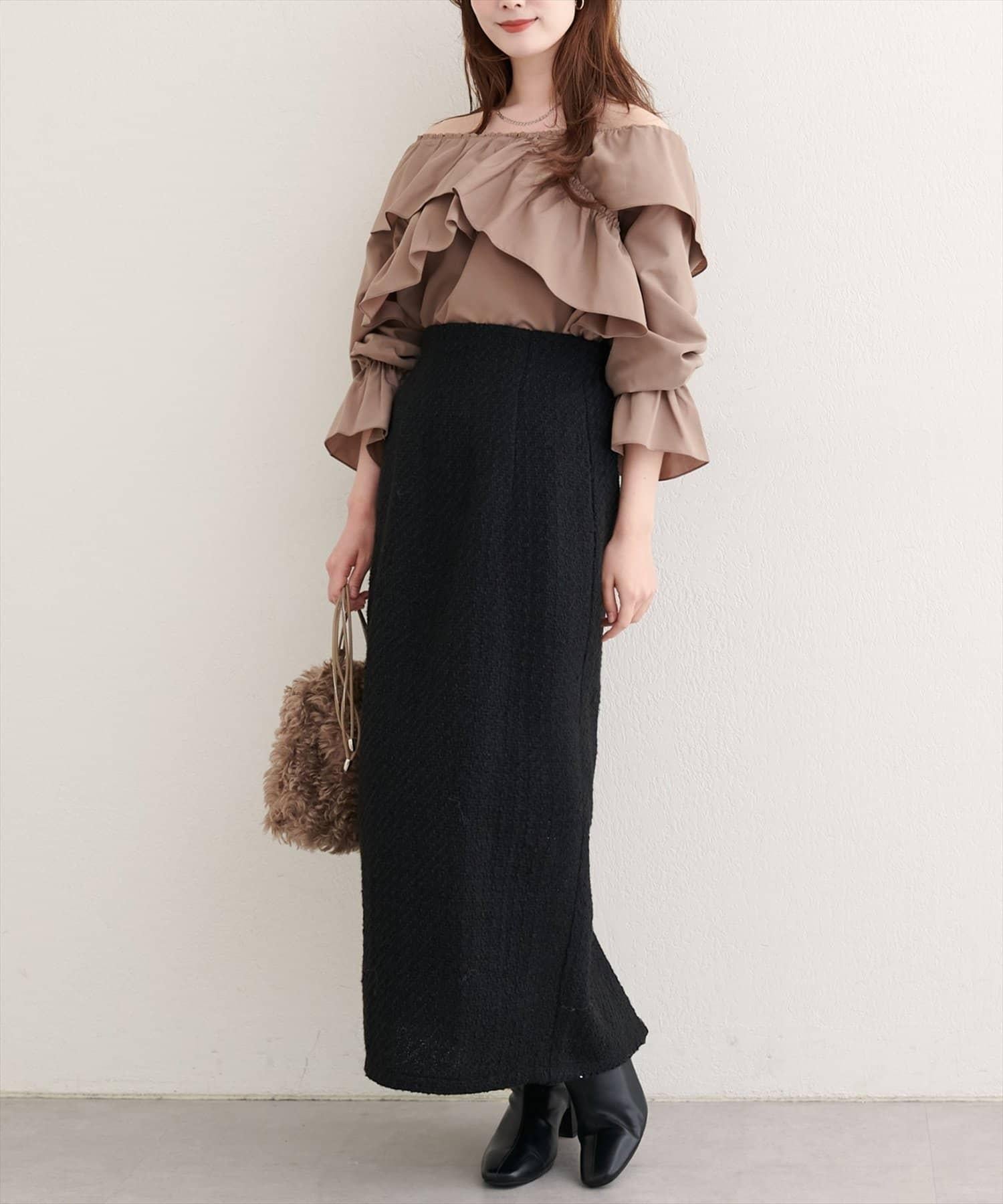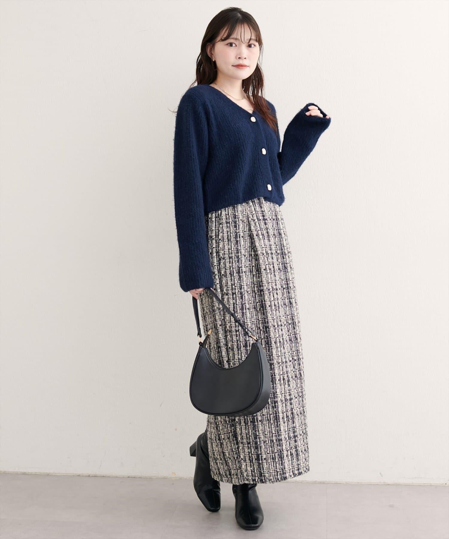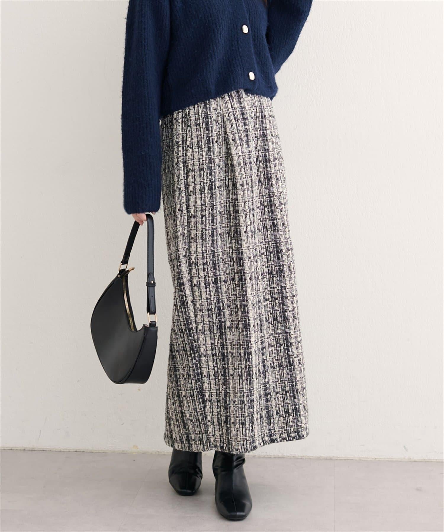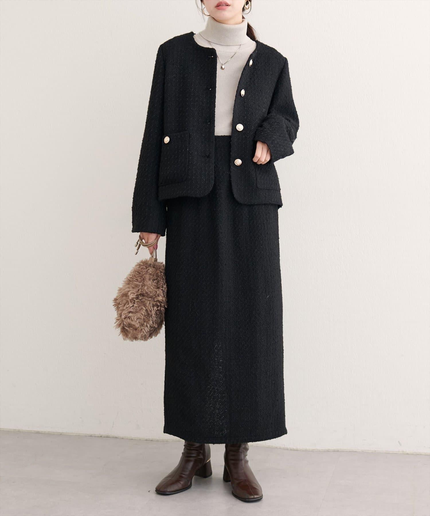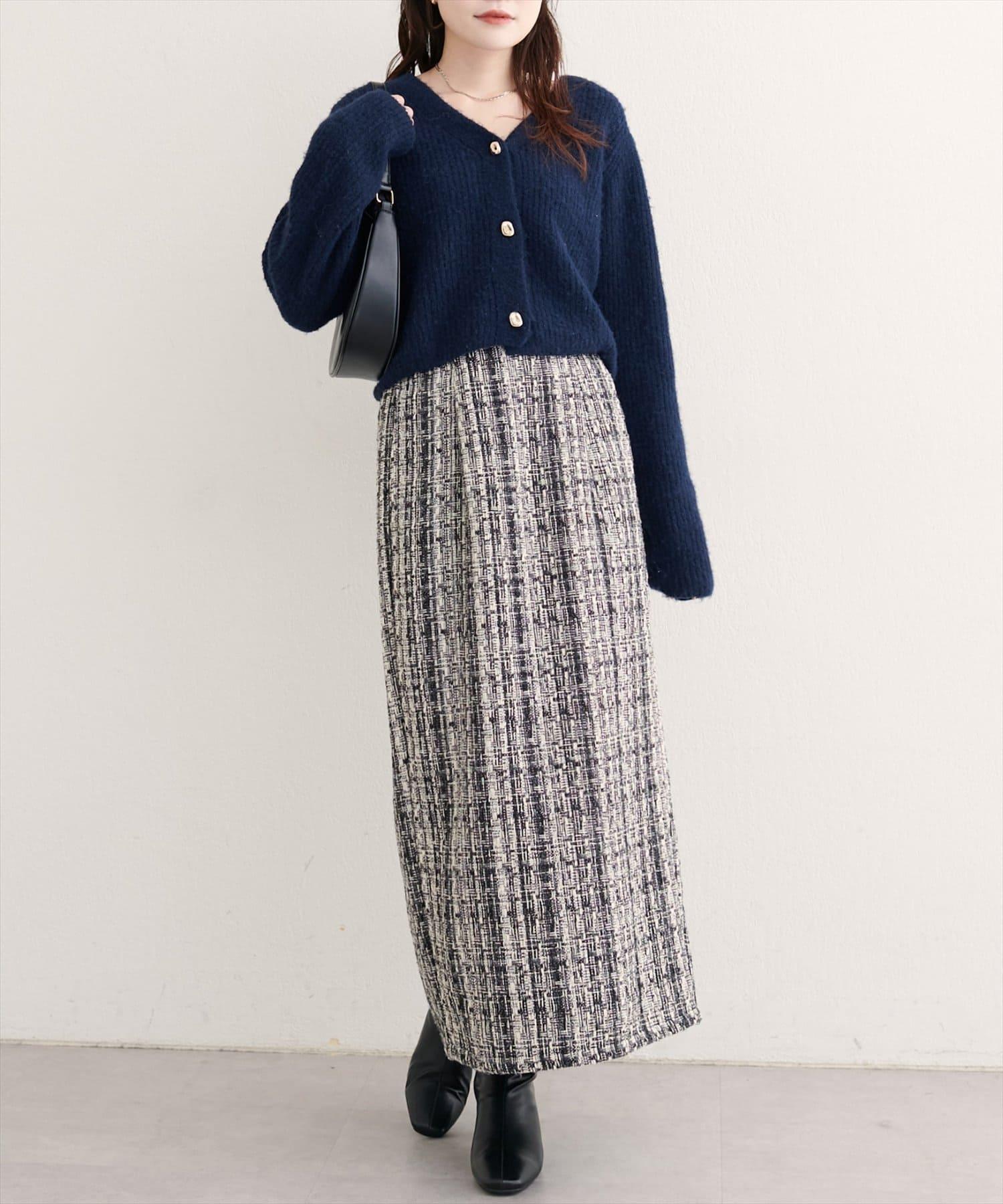 此外,建議將裙子上的斜紋軟呢顏色運用到上衣中。這樣可以營造出整體感和時尚感。