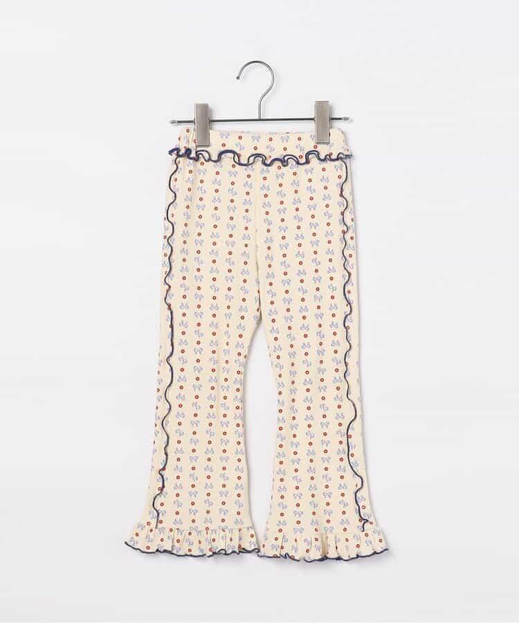 預約商品滿版圖案彈力華夫格下襬荷葉邊喇叭褲