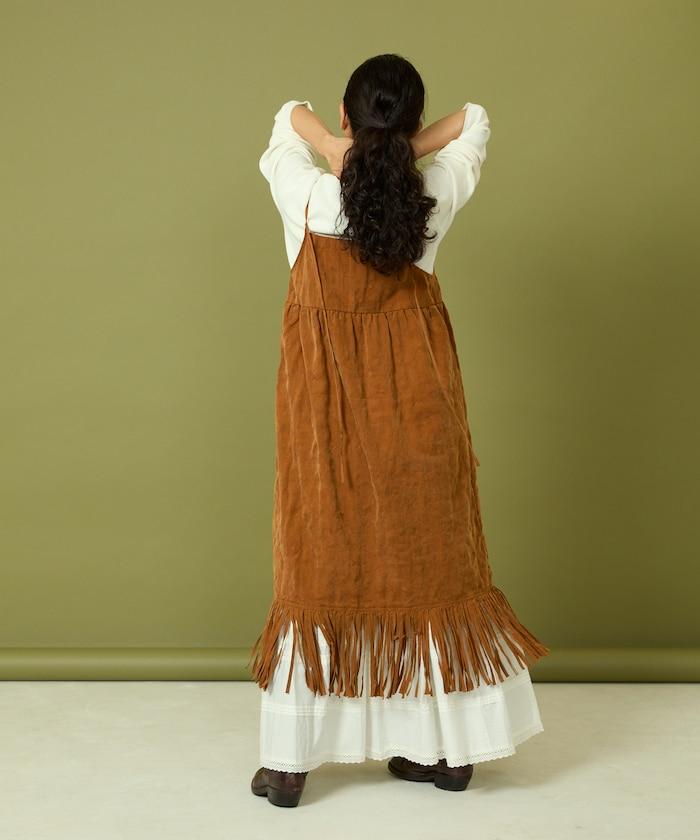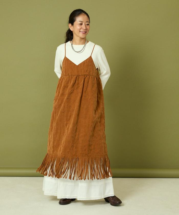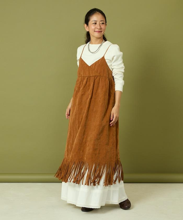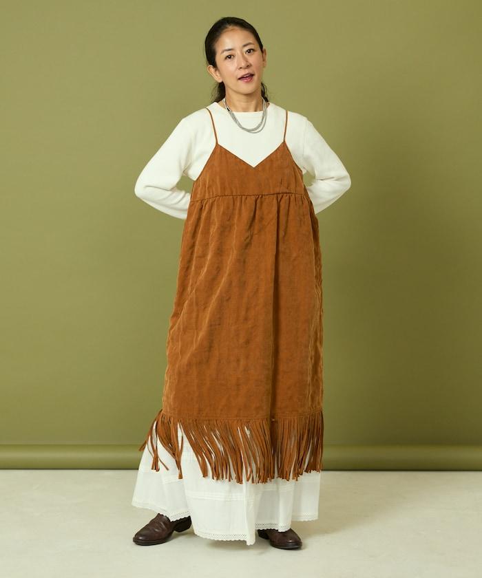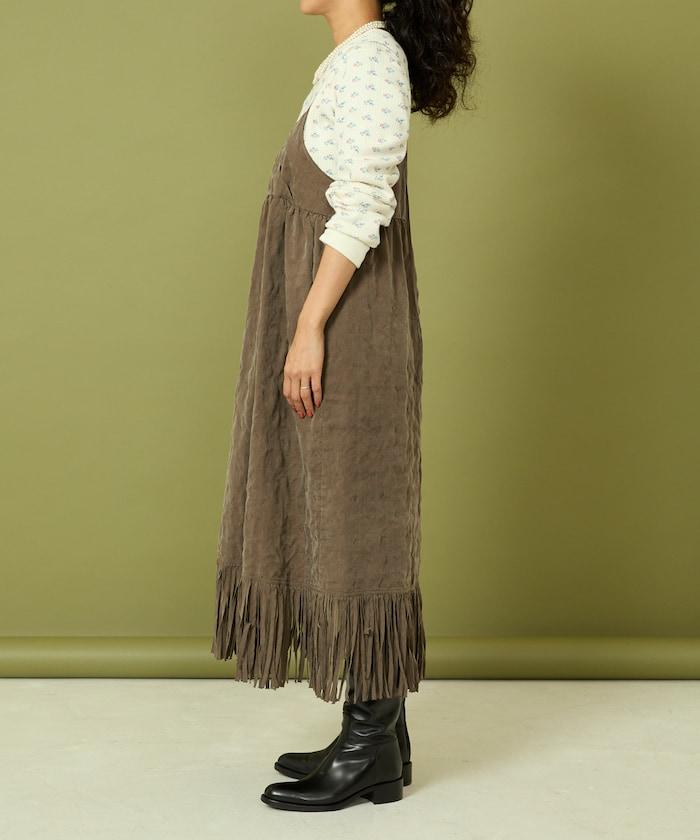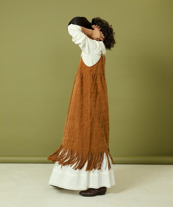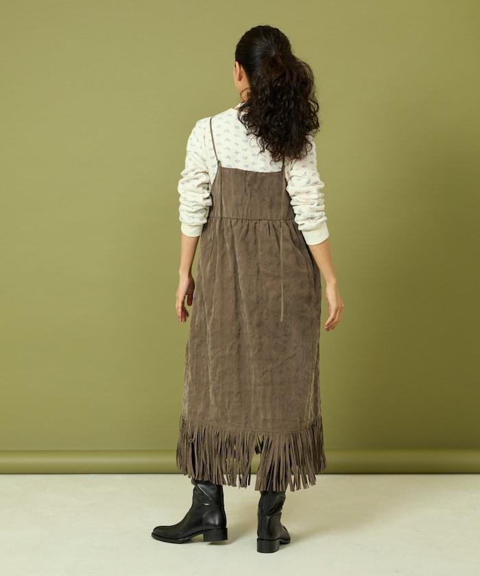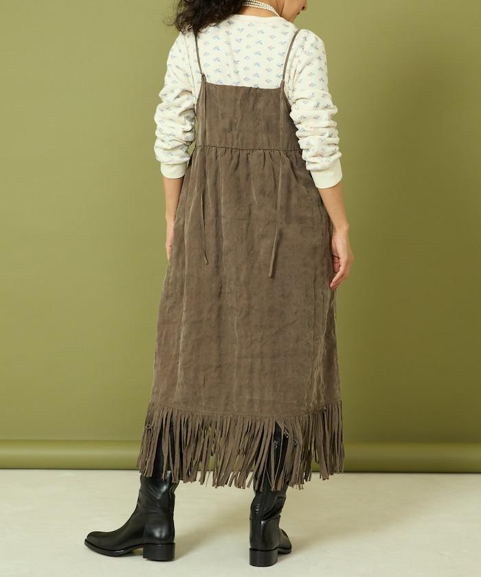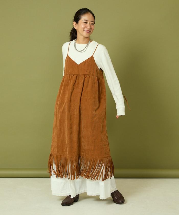 吊帶連衣裙,採用仿麂皮絨面料,打造時髦造型。