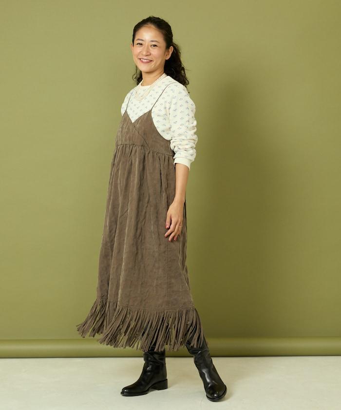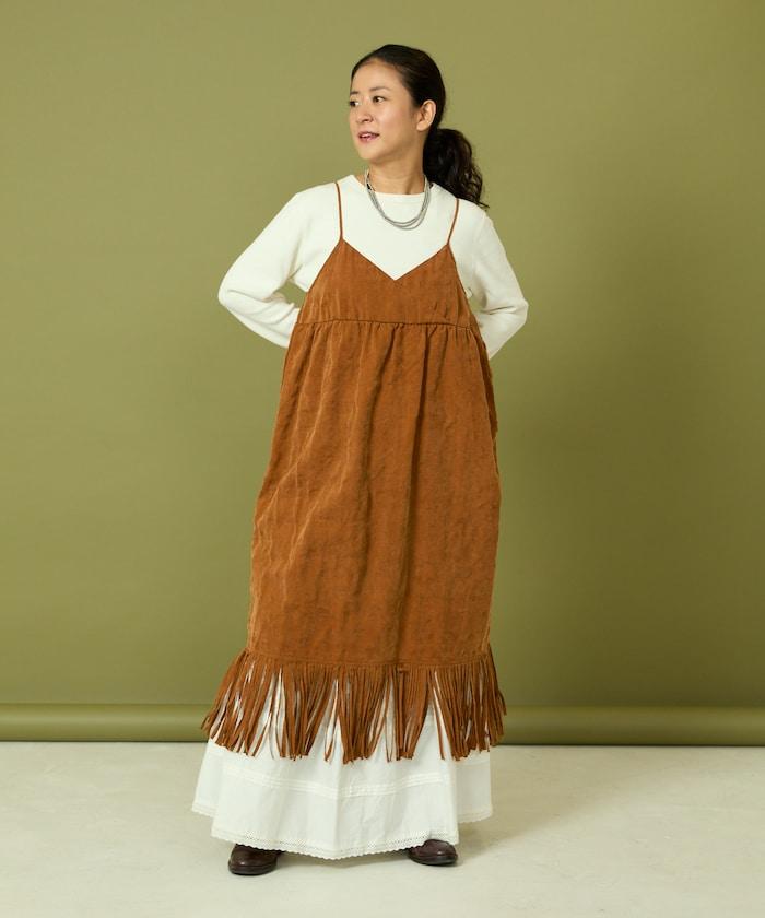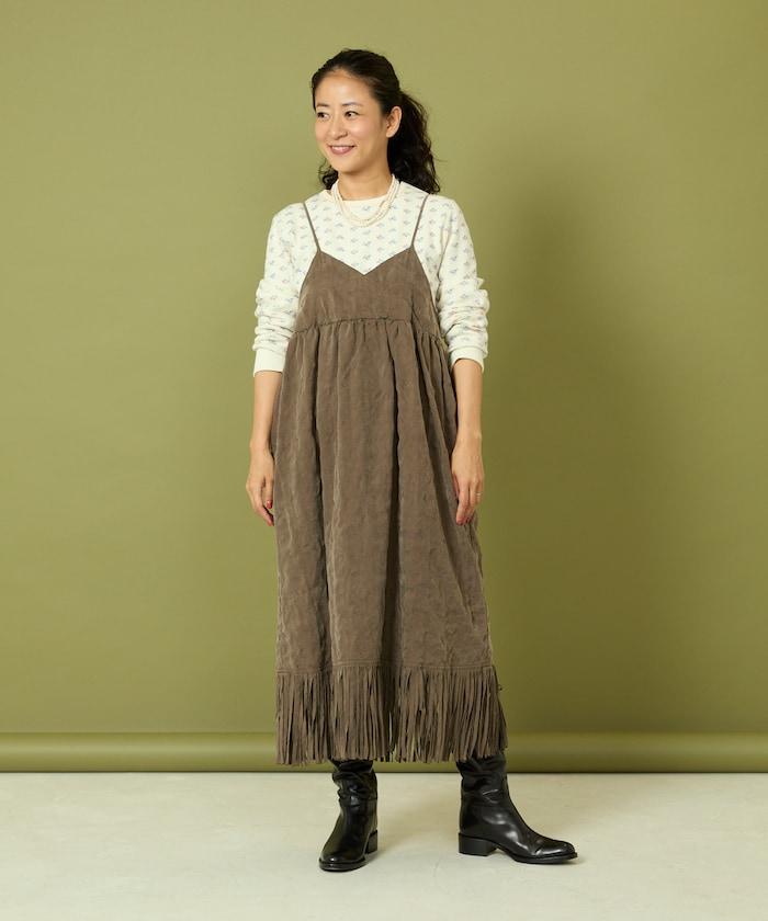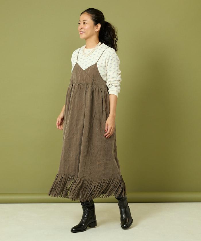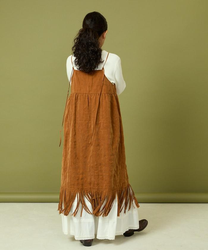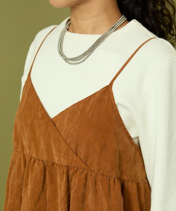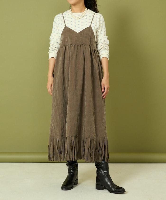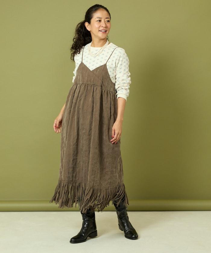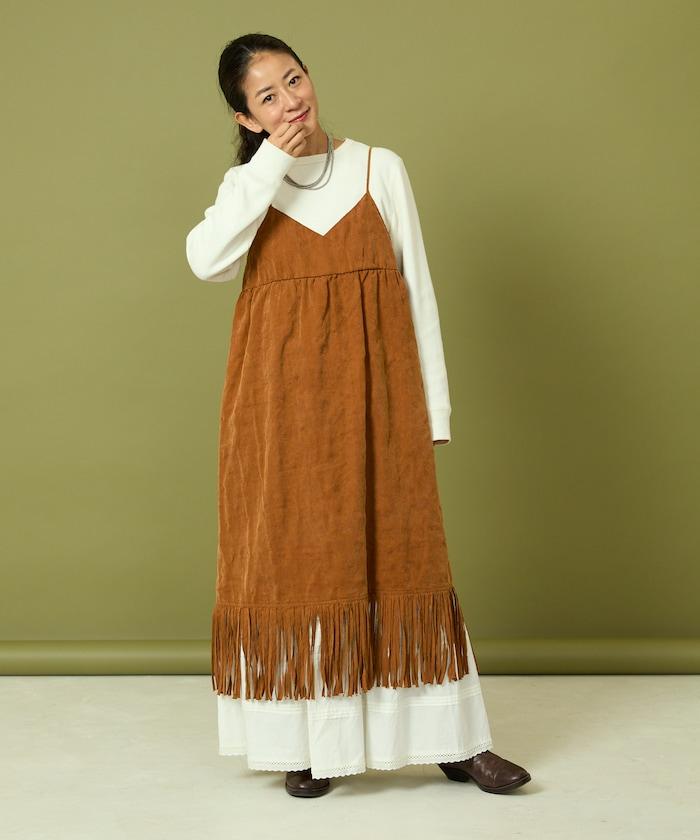吊帶連衣裙,採用仿麂皮絨面料,打造時髦造型。