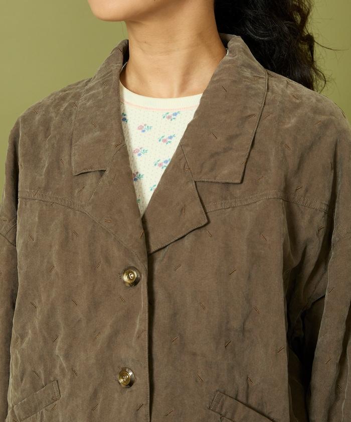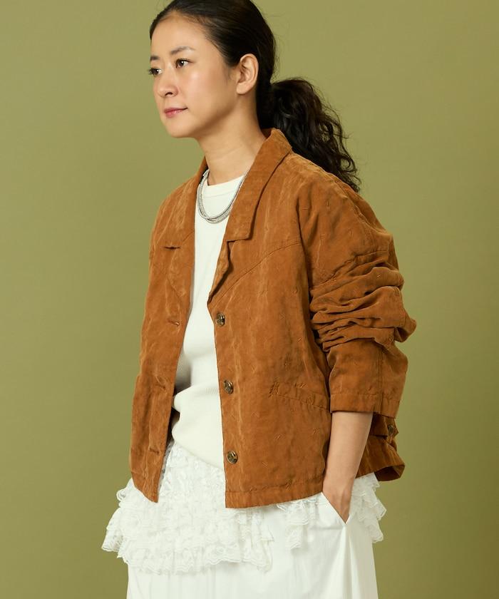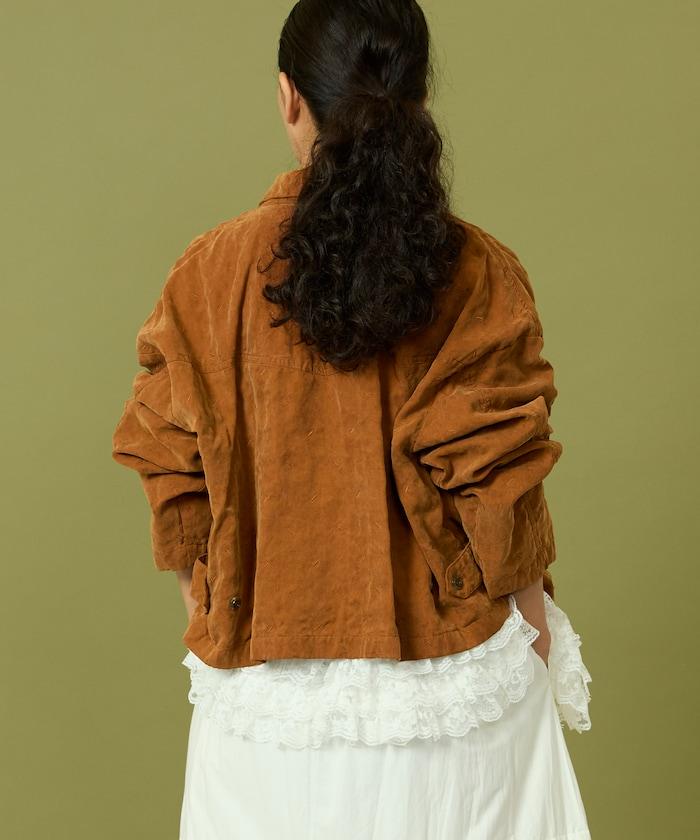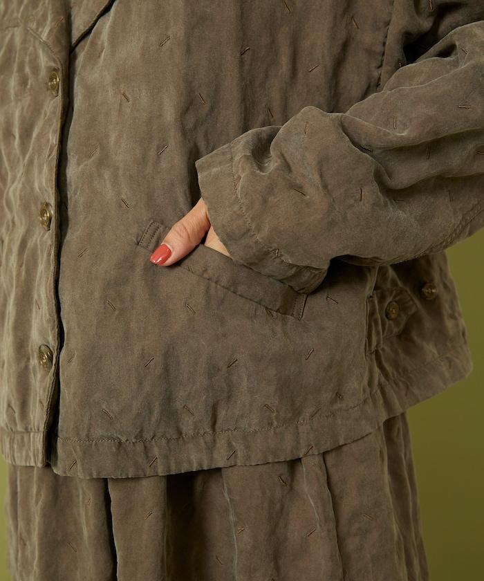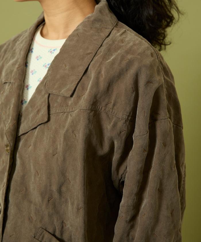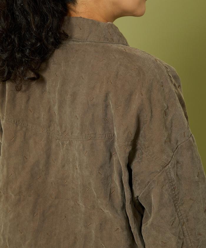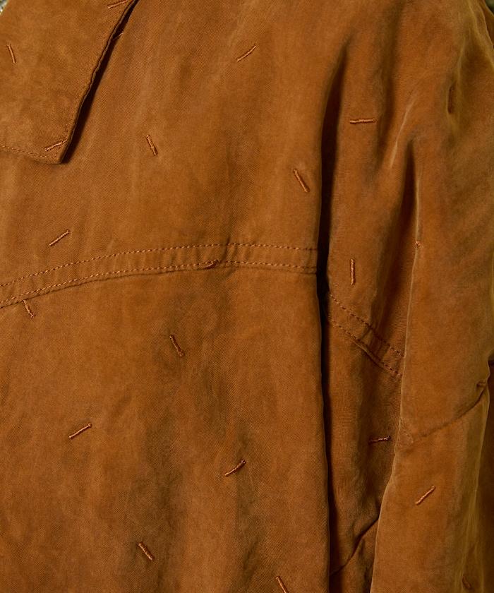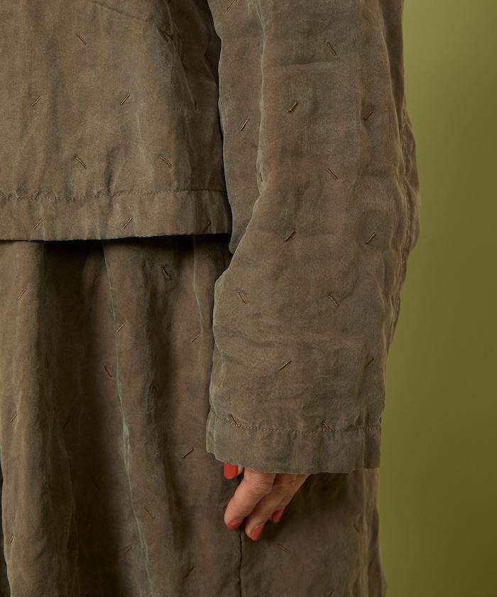 面料由經過纖維化處理的萊賽爾纖維和棉織物製成(這種處理工藝可使纖維變得細膩蓬鬆,呈現出麂皮絨般的質感),並在面料上繡上原始刺繡。