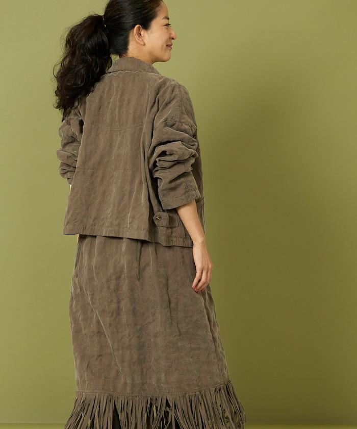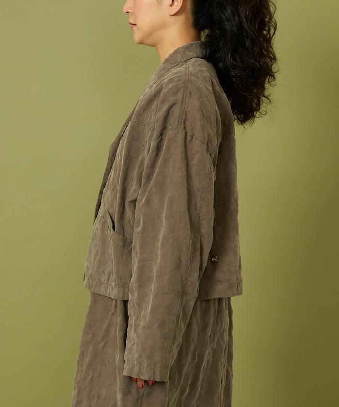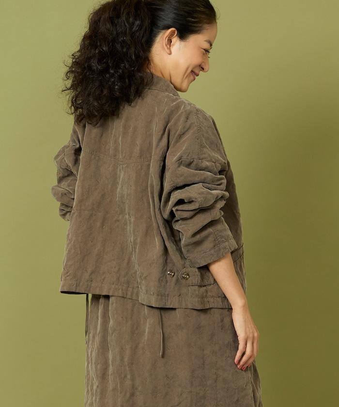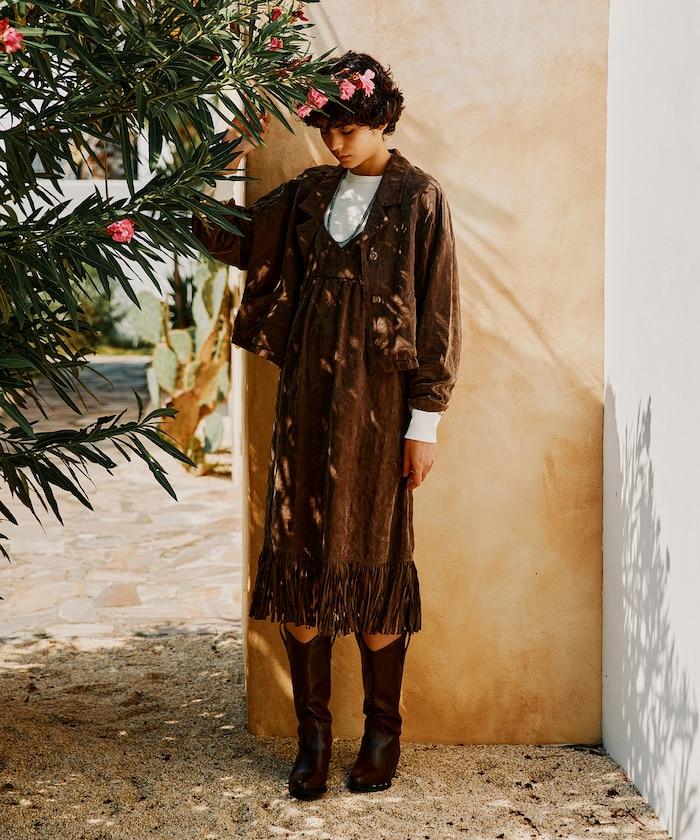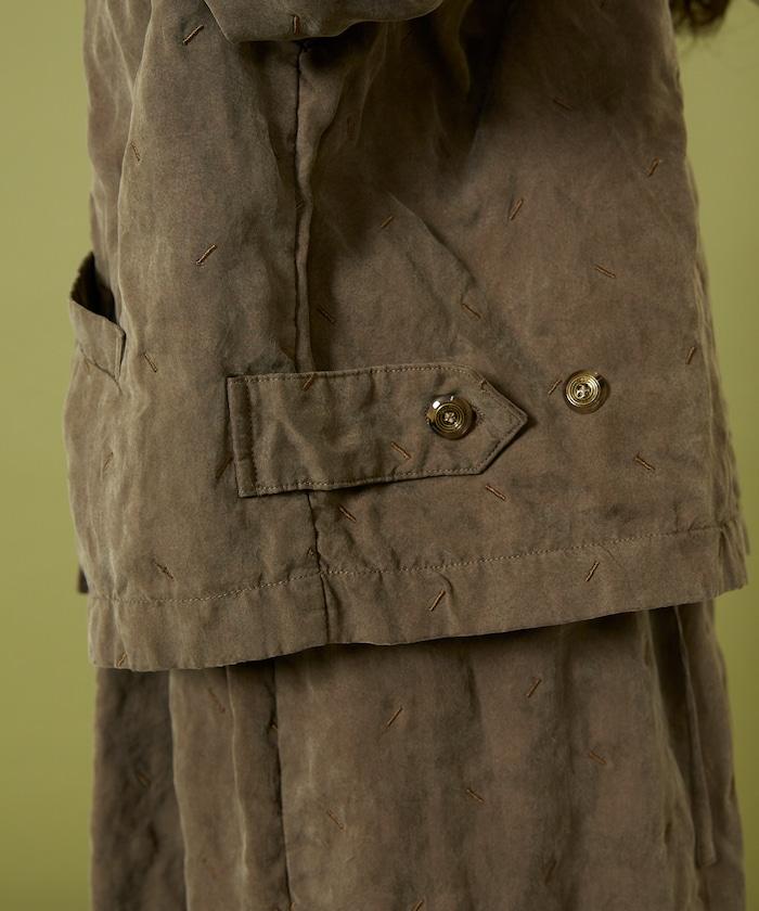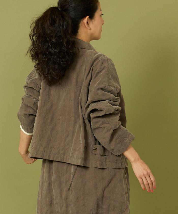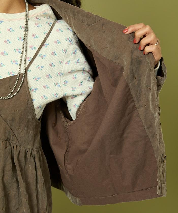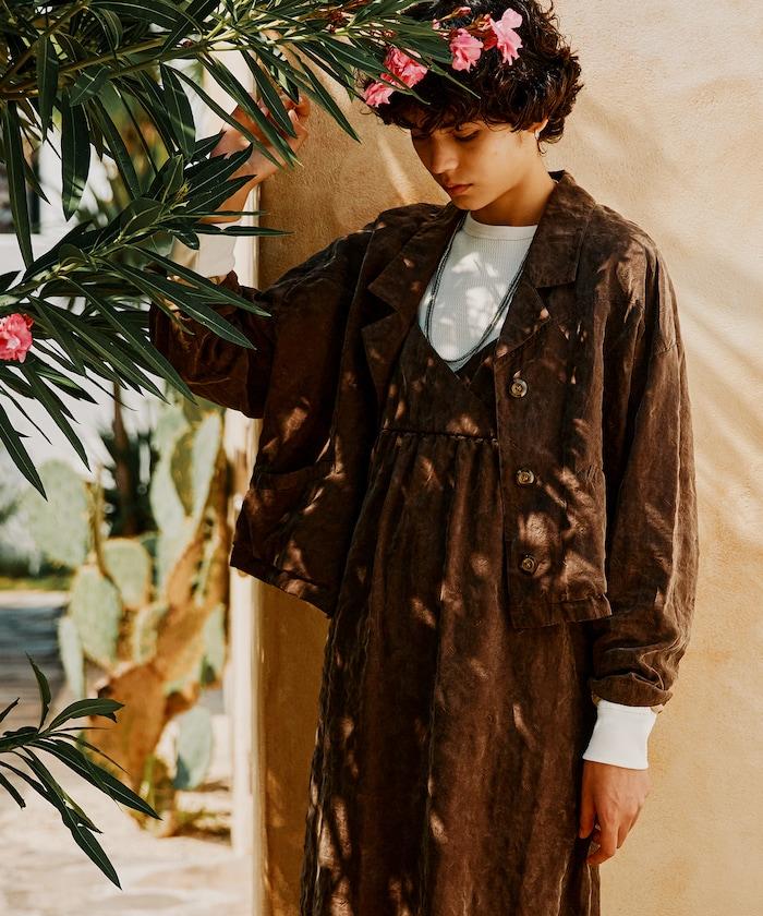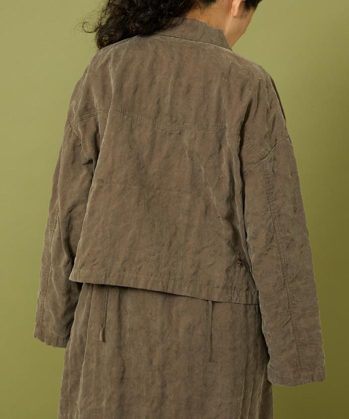 面料由經過纖維化處理的萊賽爾纖維和棉織物製成(這種處理工藝可使纖維變得細膩蓬鬆,呈現出麂皮絨般的質感),並在面料上繡上原始刺繡。