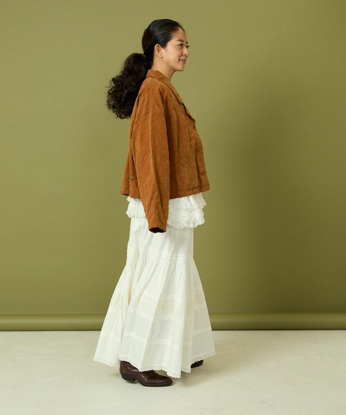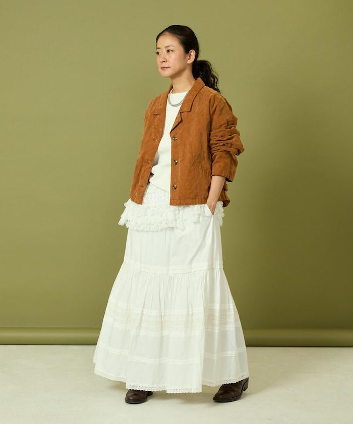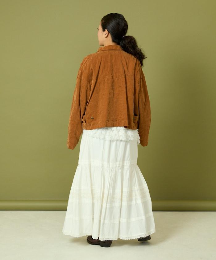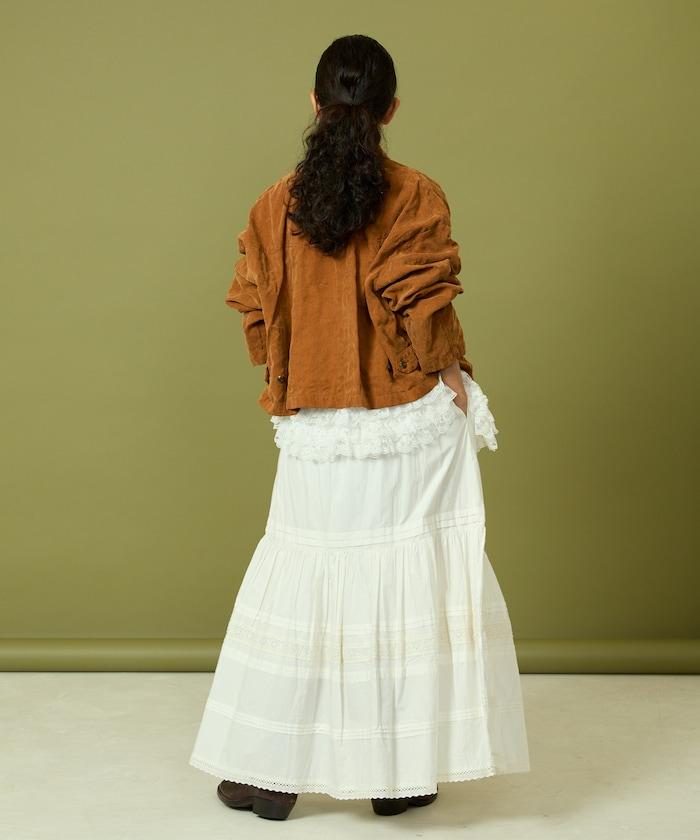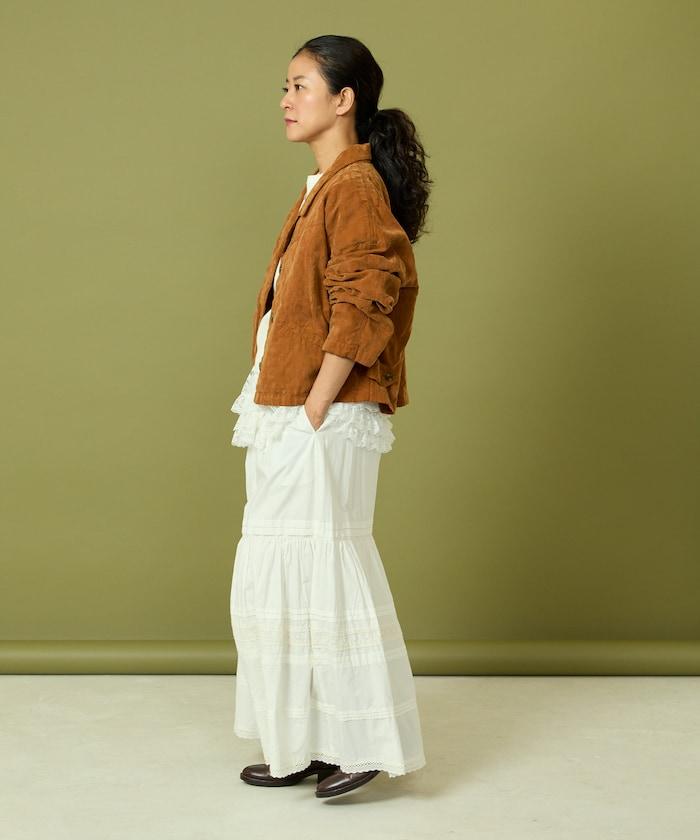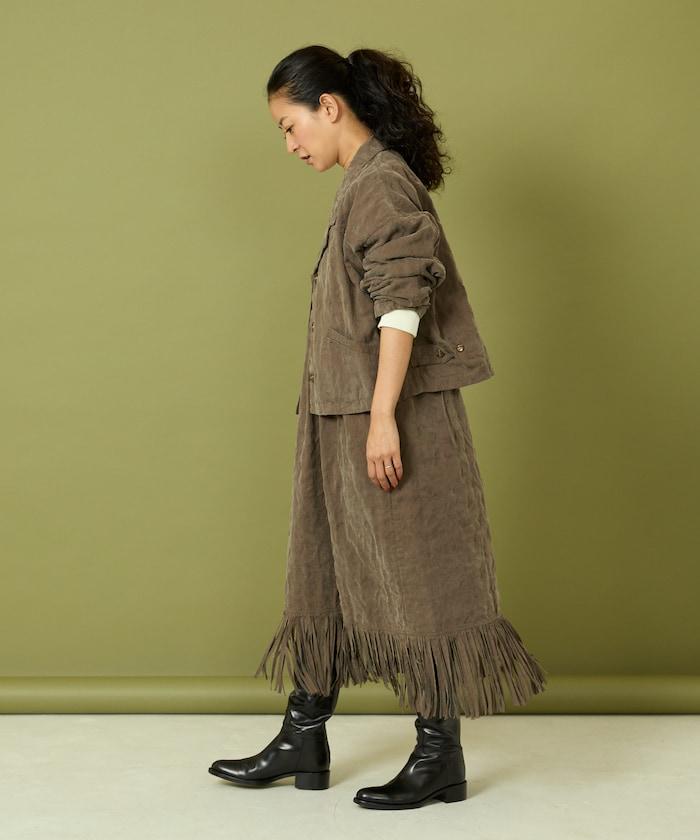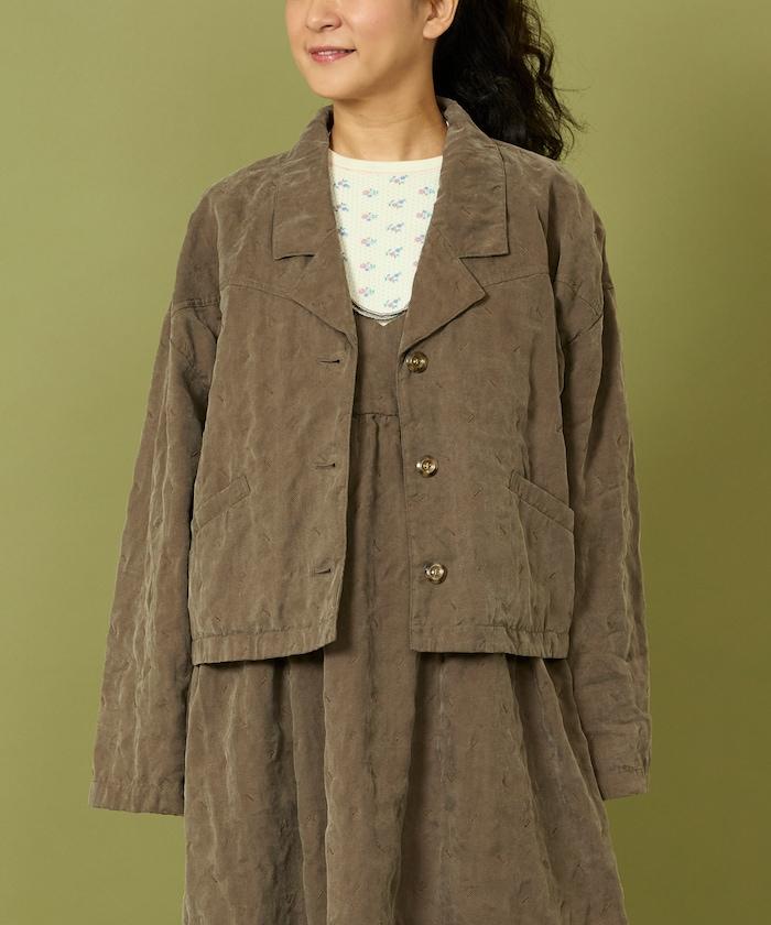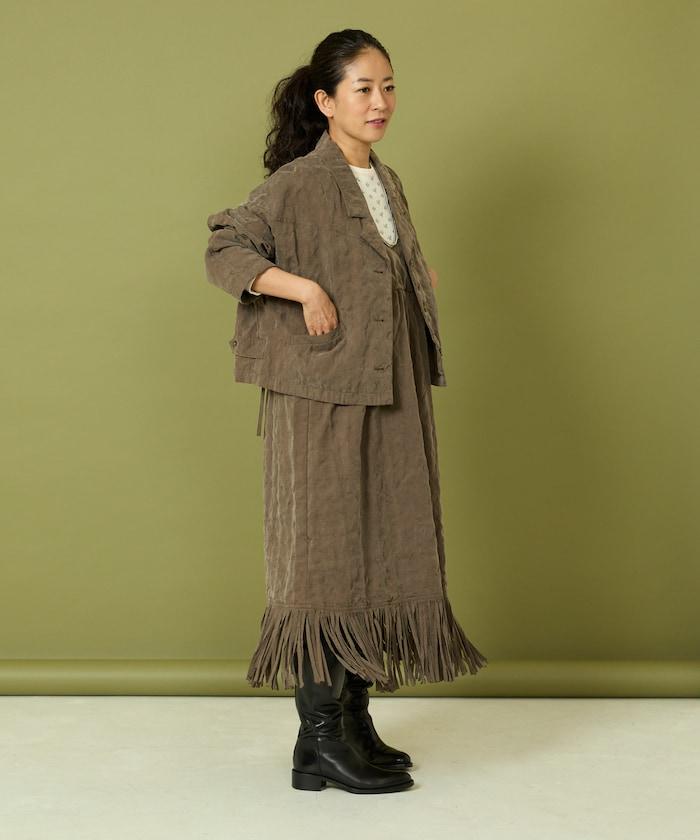 面料由經過纖維化處理的萊賽爾纖維和棉織物製成(這種處理工藝可使纖維變得細膩蓬鬆,呈現出麂皮絨般的質感),並在面料上繡上原始刺繡。