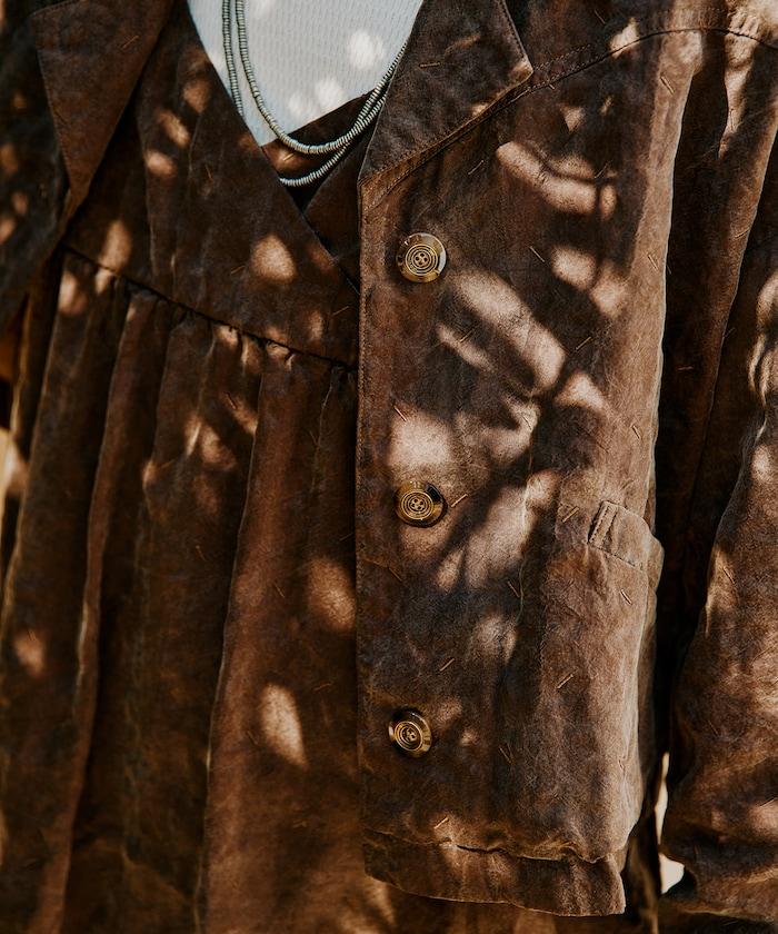 面料在縫製後經過水洗,呈現出獨特的褶皺和凹凸感,與隨著時間推移而變質的舊絲綢相似。