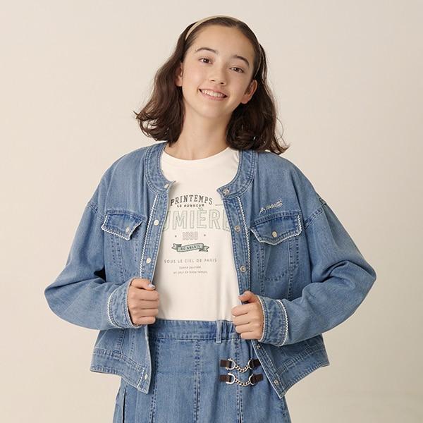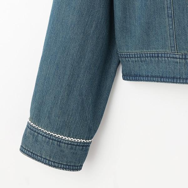 這款牛仔夾克採用了少女般的局部皮孔設計。