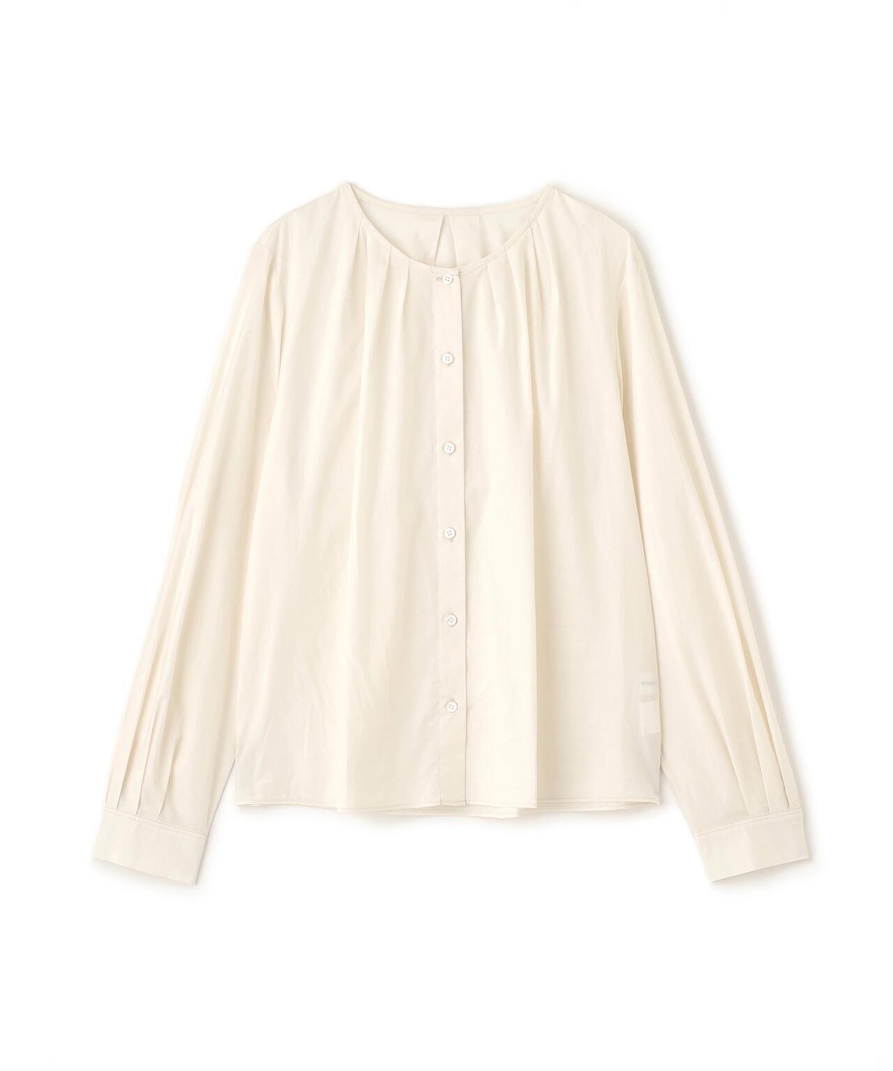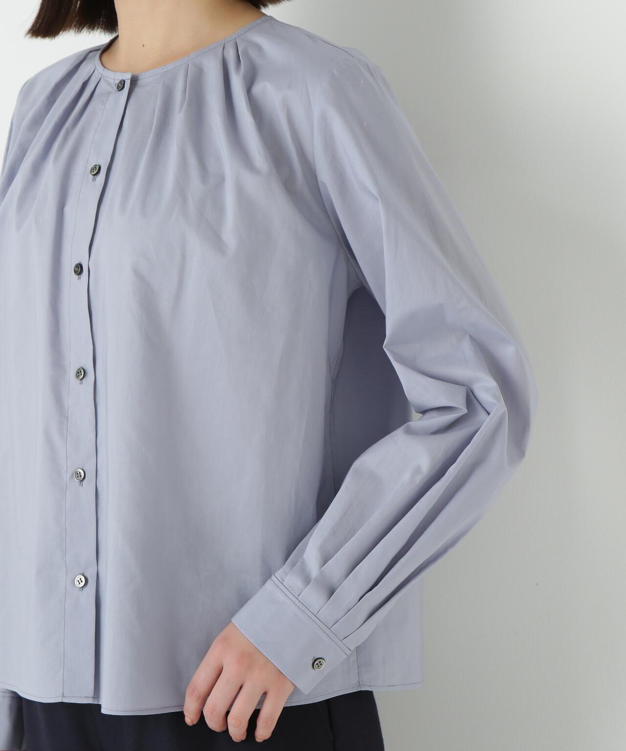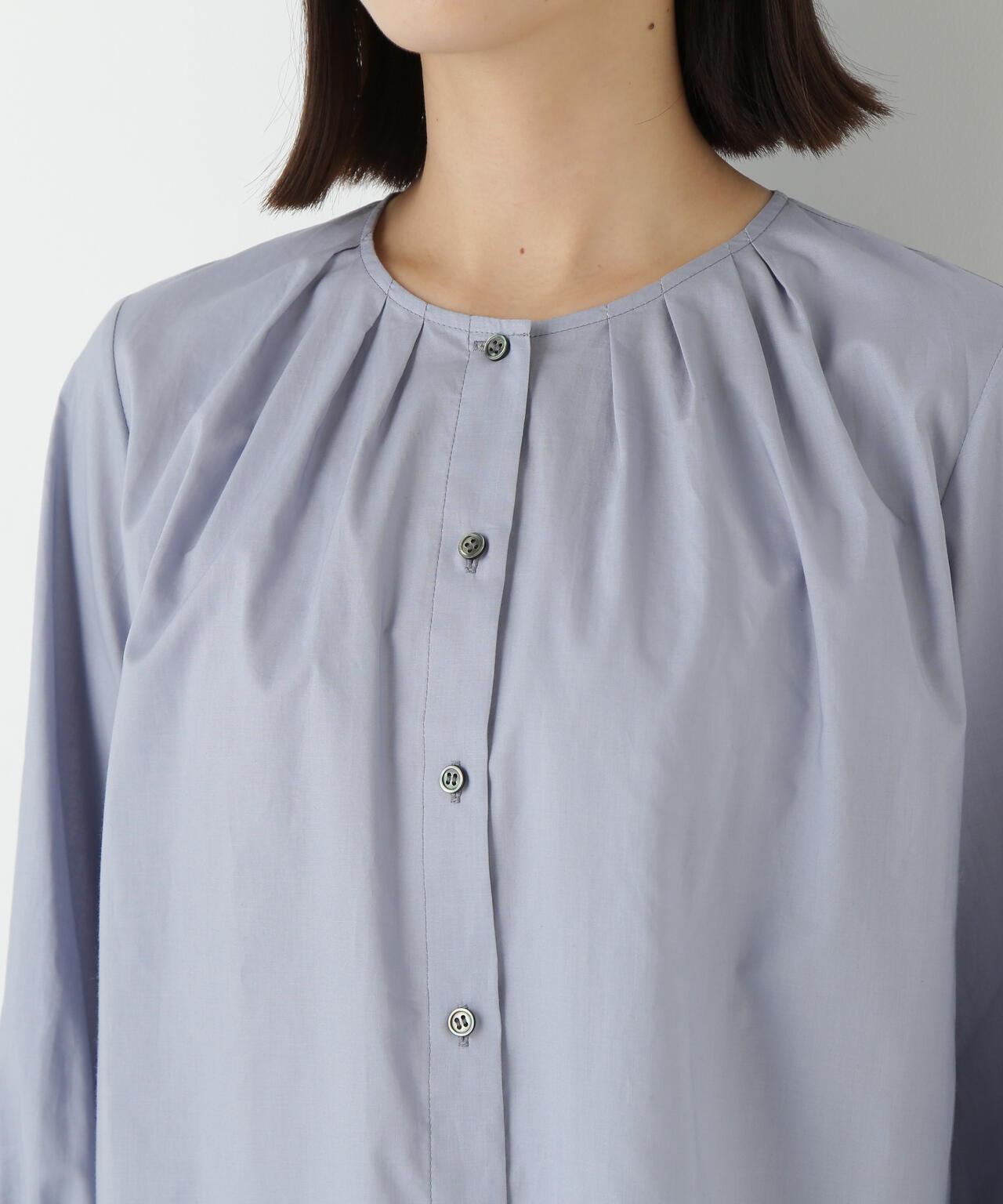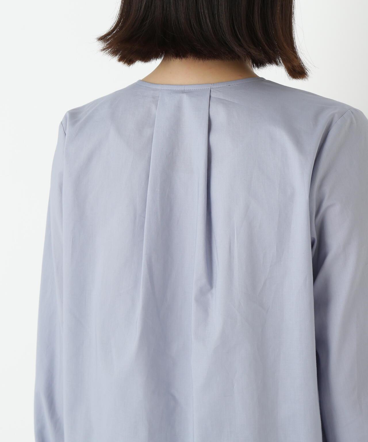 褶襉無領上衣 [設計要點] 這款前開襟圓領上衣在頸部有細微的隨意褶襉。簡潔的肩寬使袖子具有良好的體積感。上衣採用棉質打字機面料,經過空氣翻滾處理,具有水洗效果。推薦座標】這是一件可以搭配任何下裝的設計感上衣。在辦公室場景中也很實用,因為它具有美麗的氛圍。