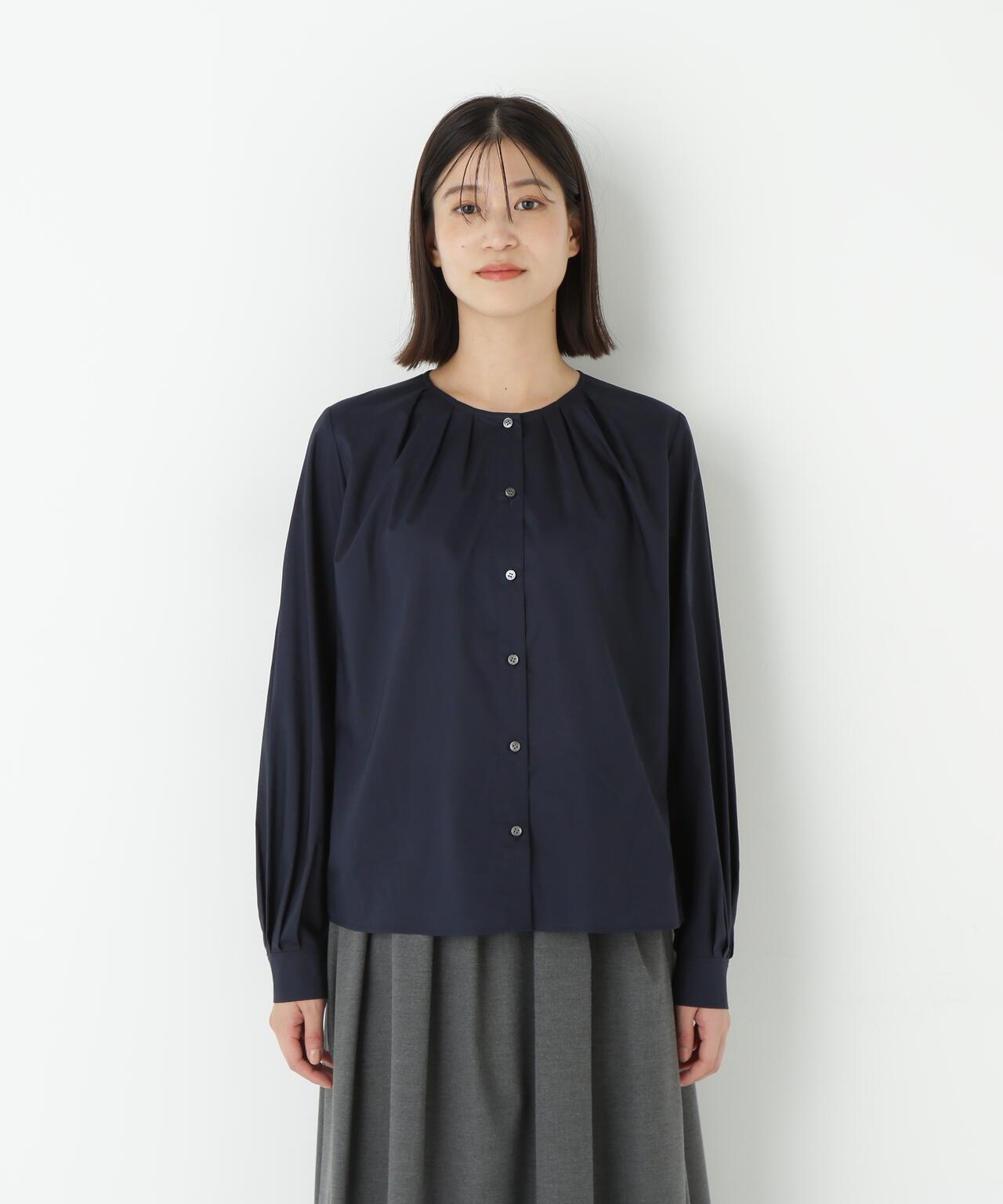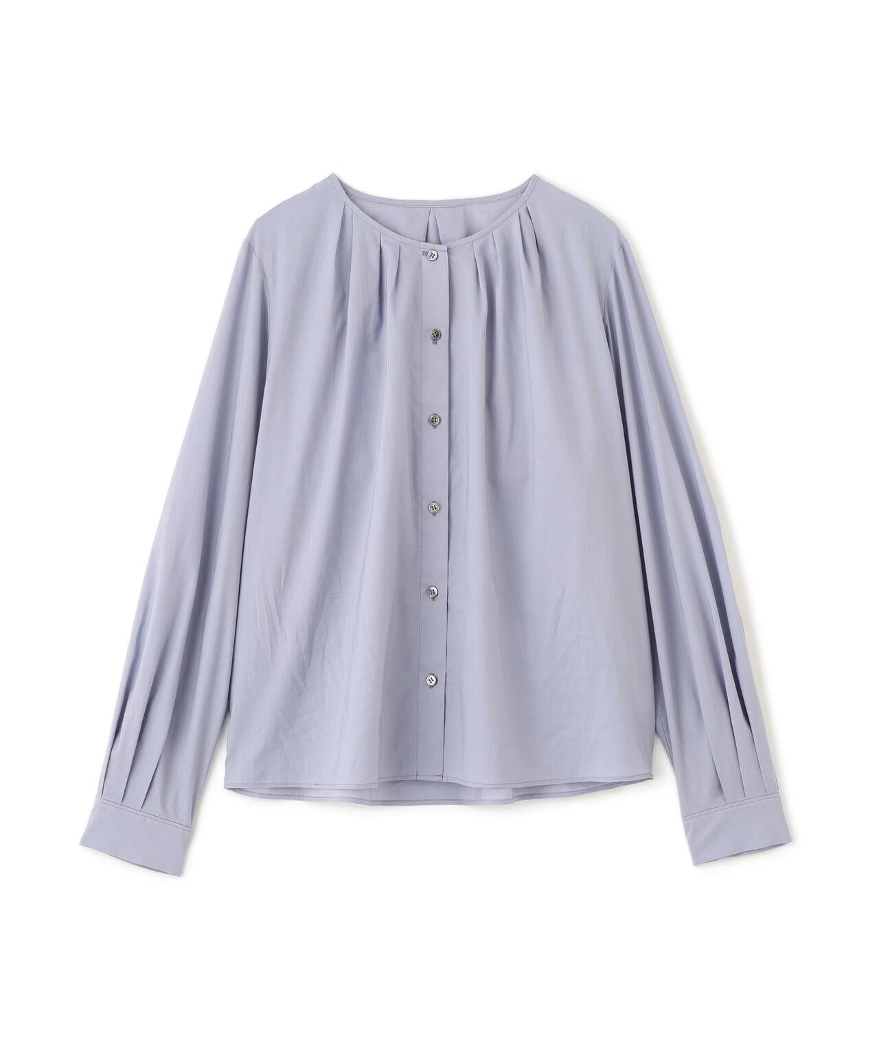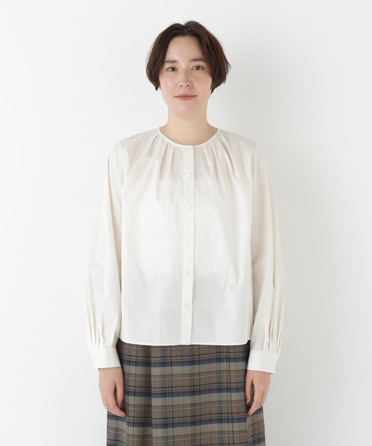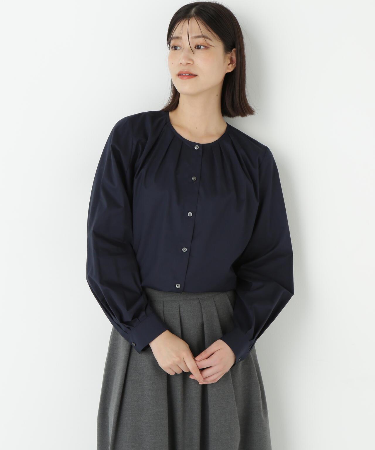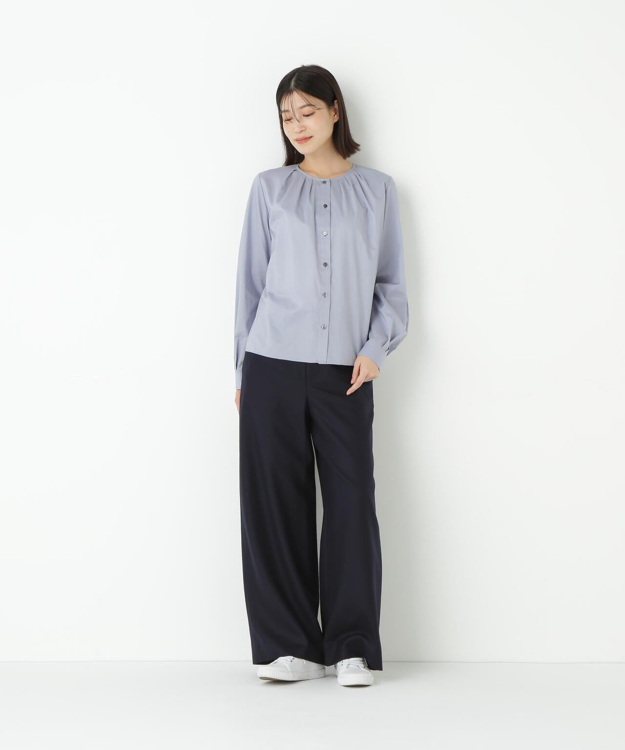 褶襉無領上衣 [設計要點] 這款前開襟圓領上衣在頸部有細微的隨意褶襉。簡潔的肩寬使袖子具有良好的體積感。上衣採用棉質打字機面料,經過空氣翻滾處理,具有水洗效果。推薦座標】這是一件可以搭配任何下裝的設計感上衣。在辦公室場景中也很實用,因為它具有美麗的氛圍。