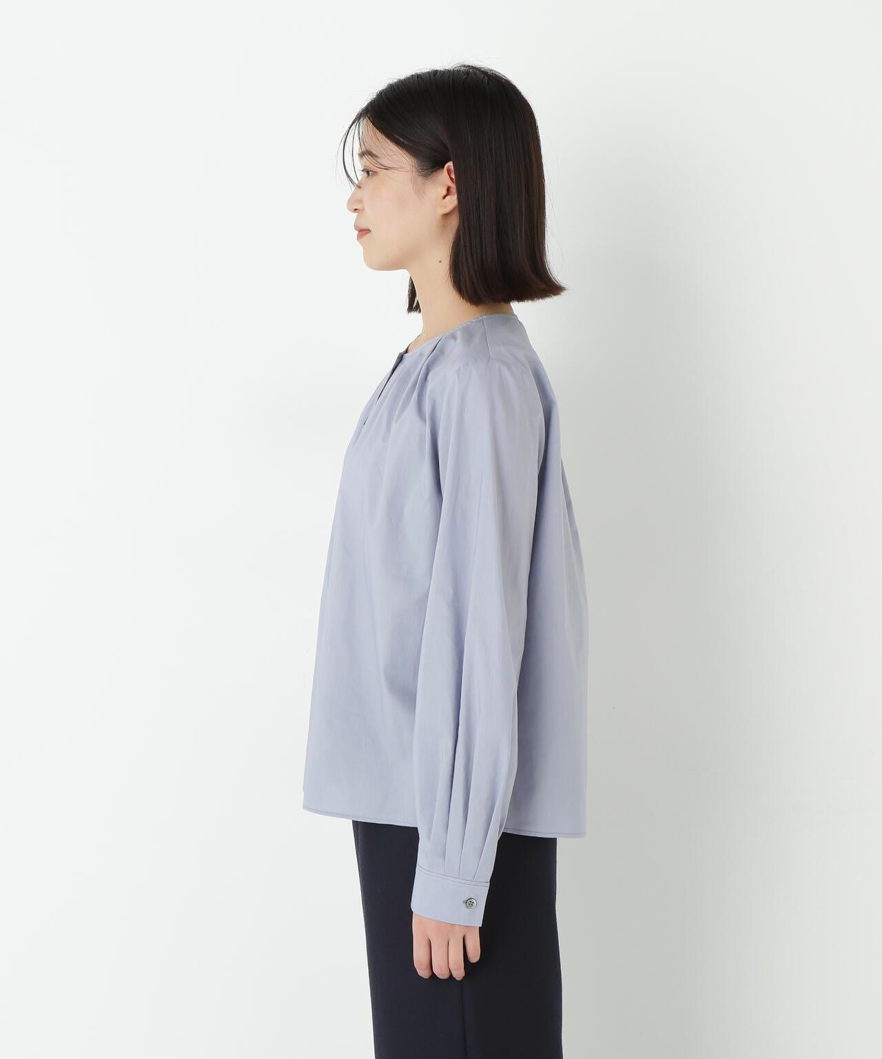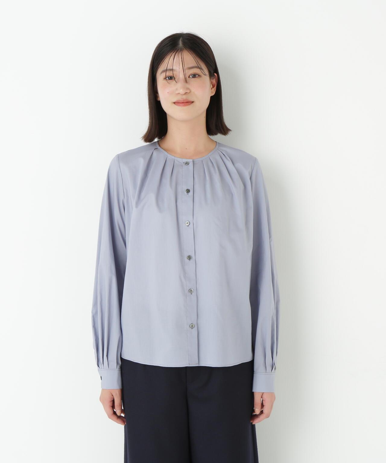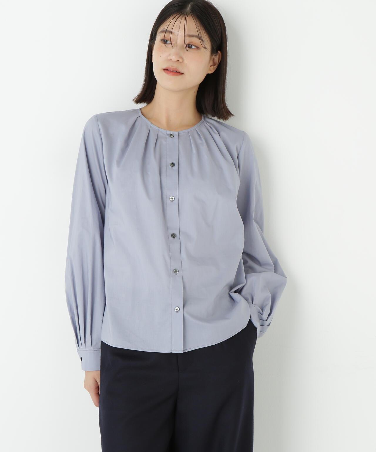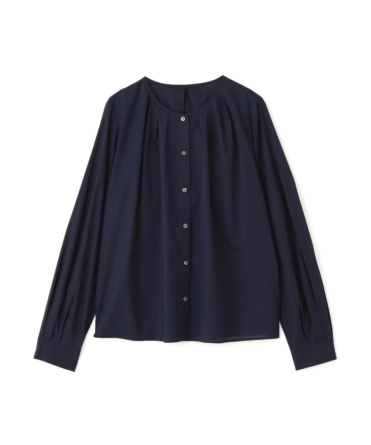 褶襉無領上衣 [設計要點] 這款前開襟圓領上衣在頸部有細微的隨意褶襉。簡潔的肩寬使袖子具有良好的體積感。上衣採用棉質打字機面料,經過空氣翻滾處理,具有水洗效果。推薦座標】這是一件可以搭配任何下裝的設計感上衣。在辦公室場景中也很實用,因為它具有美麗的氛圍。